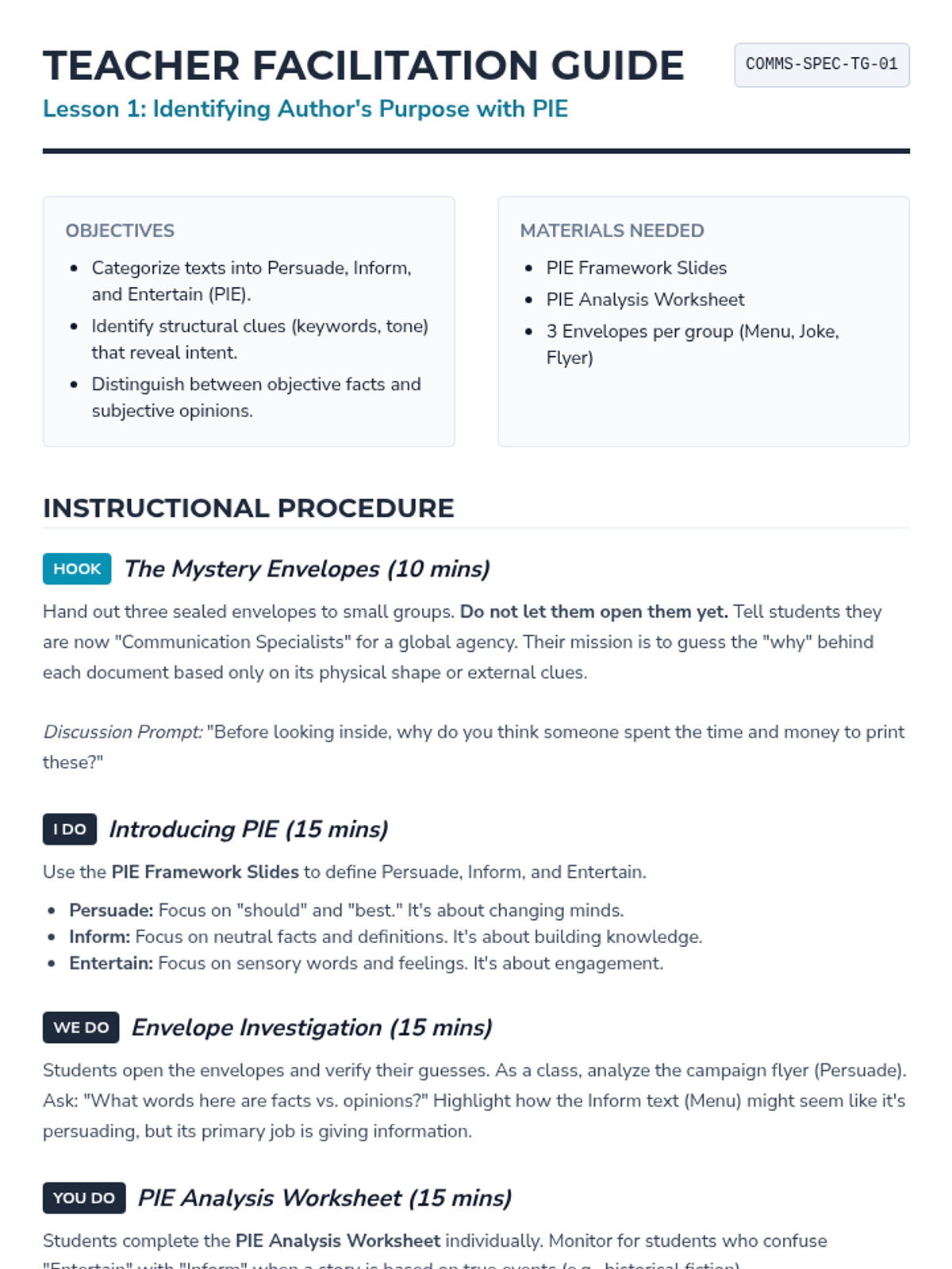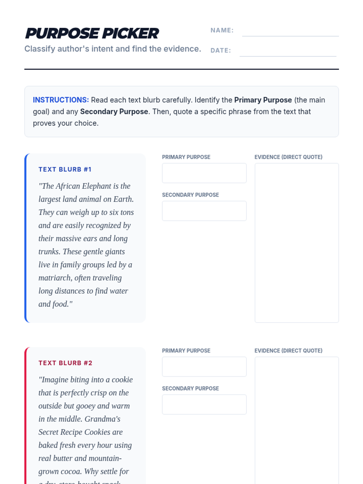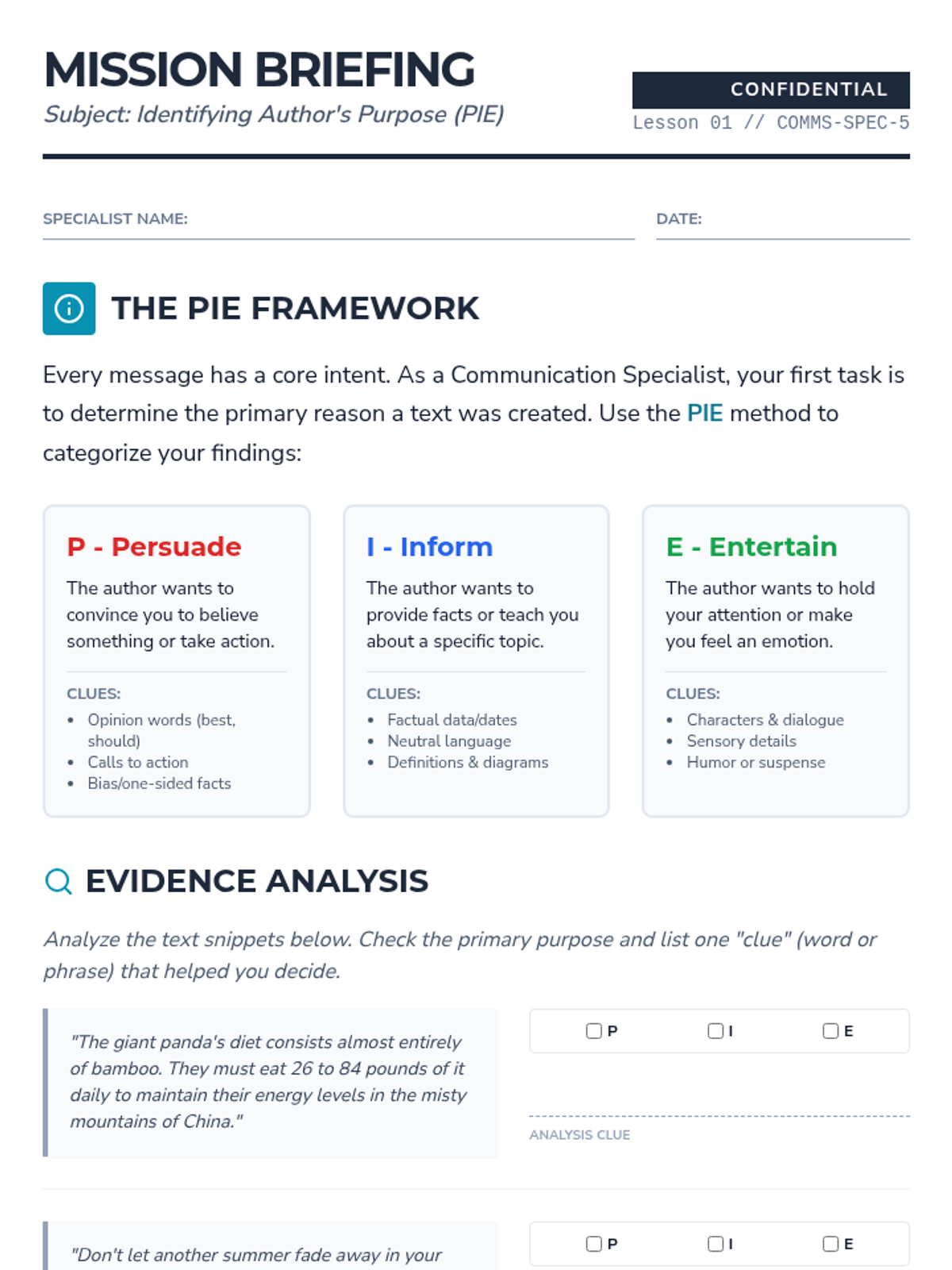 Author's Purpose And ToneIdentification of persuasive, informative, and entertaining intent alongside analysis of word choice to determine emotional stance. Equips students to differentiate between objective reporting and biased perspectives.