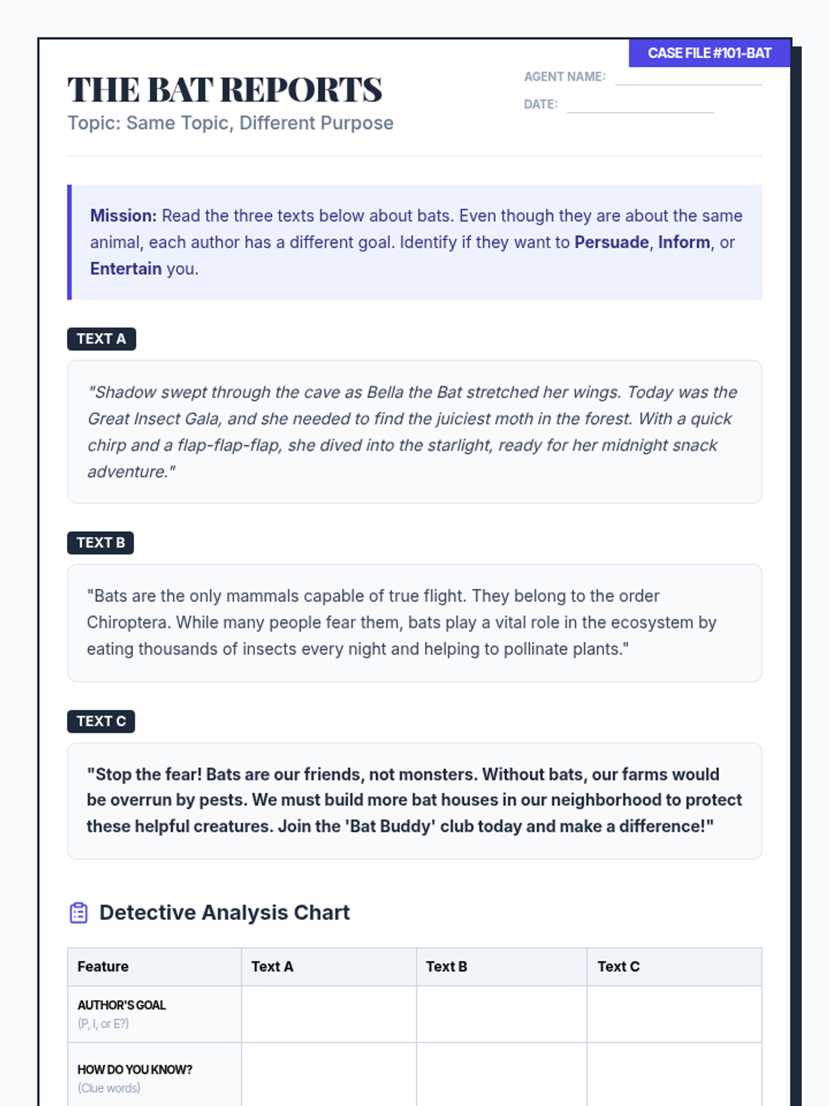 Author's PurposeDistinguishes between persuasive, informative, and entertaining texts using specific textual evidence. Strengthens comprehension by examining how word choice and structure align with a writer's intent.