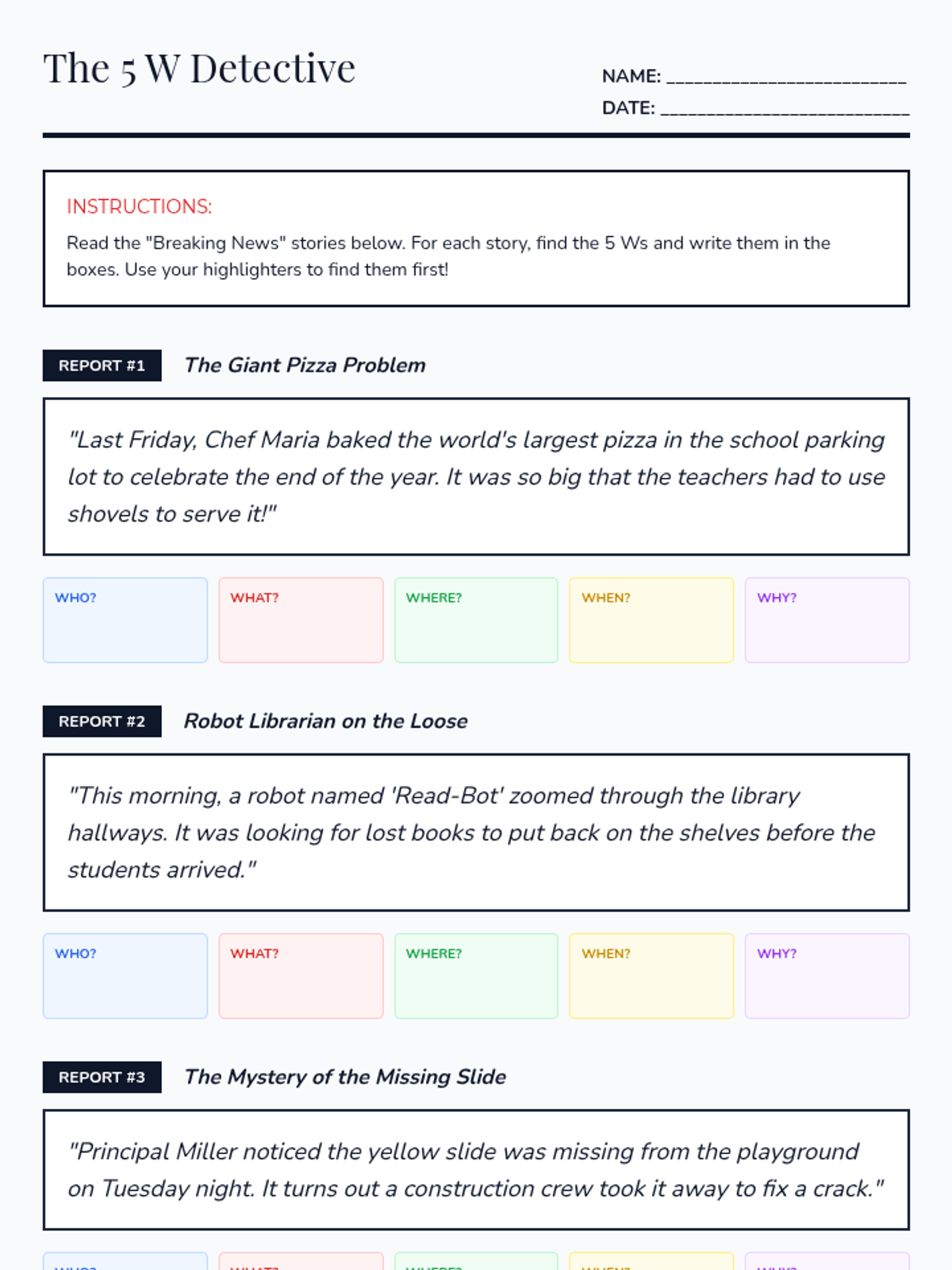 Story ElementsIdentification and analysis of plot, characters, setting, conflict, and resolution. Strengthens reading comprehension by mapping narrative structures and examining how individual components shape a story.