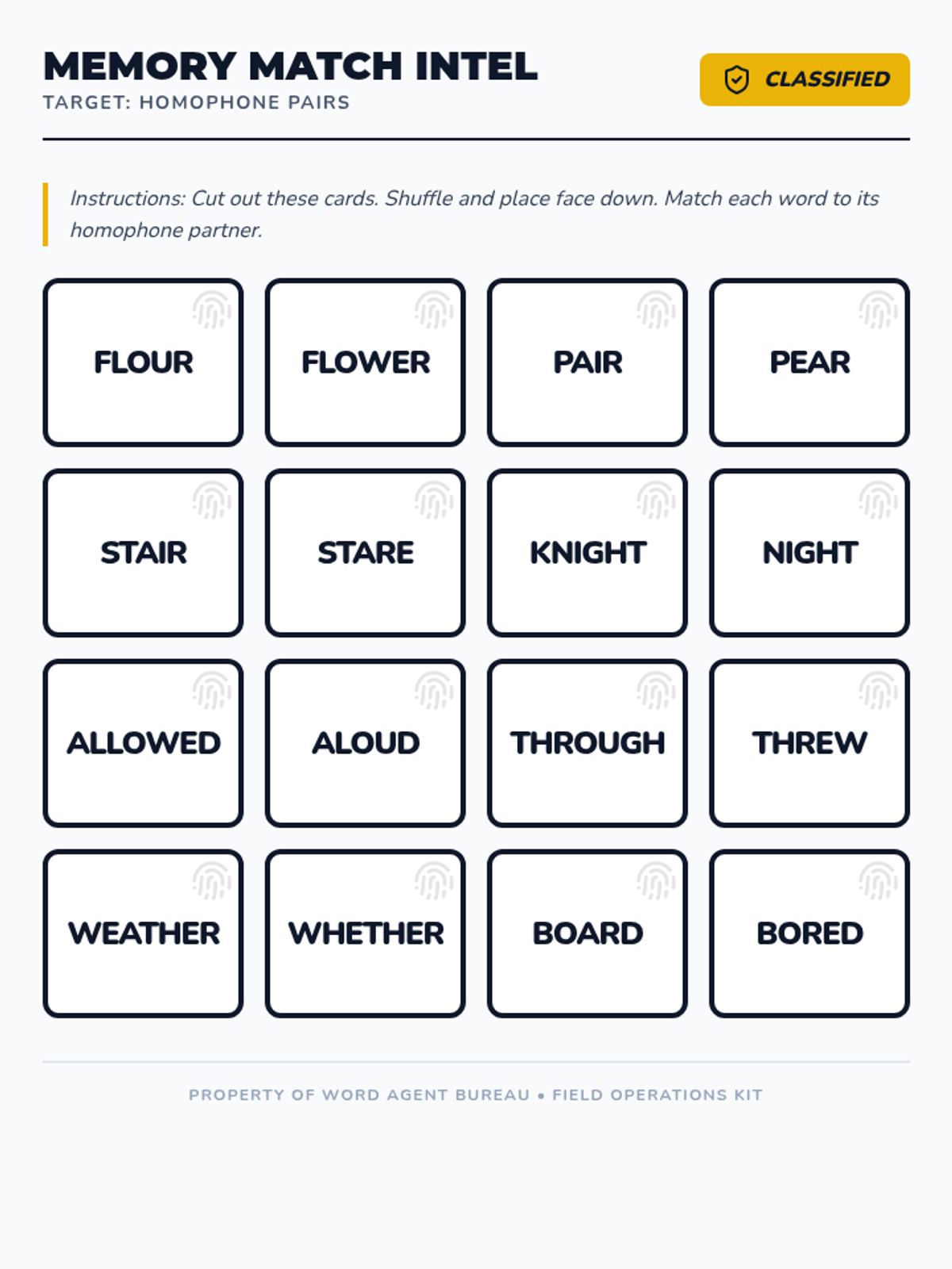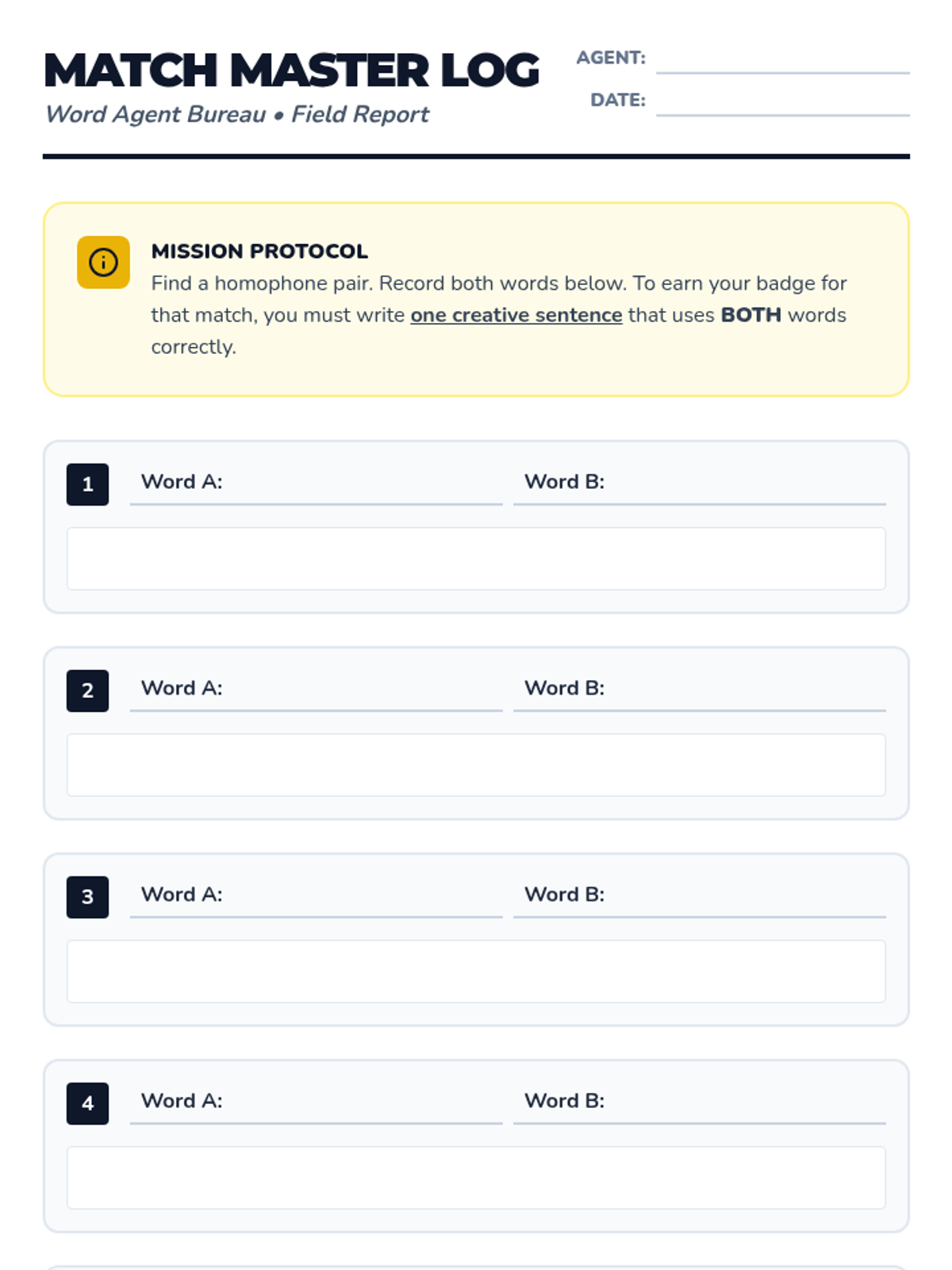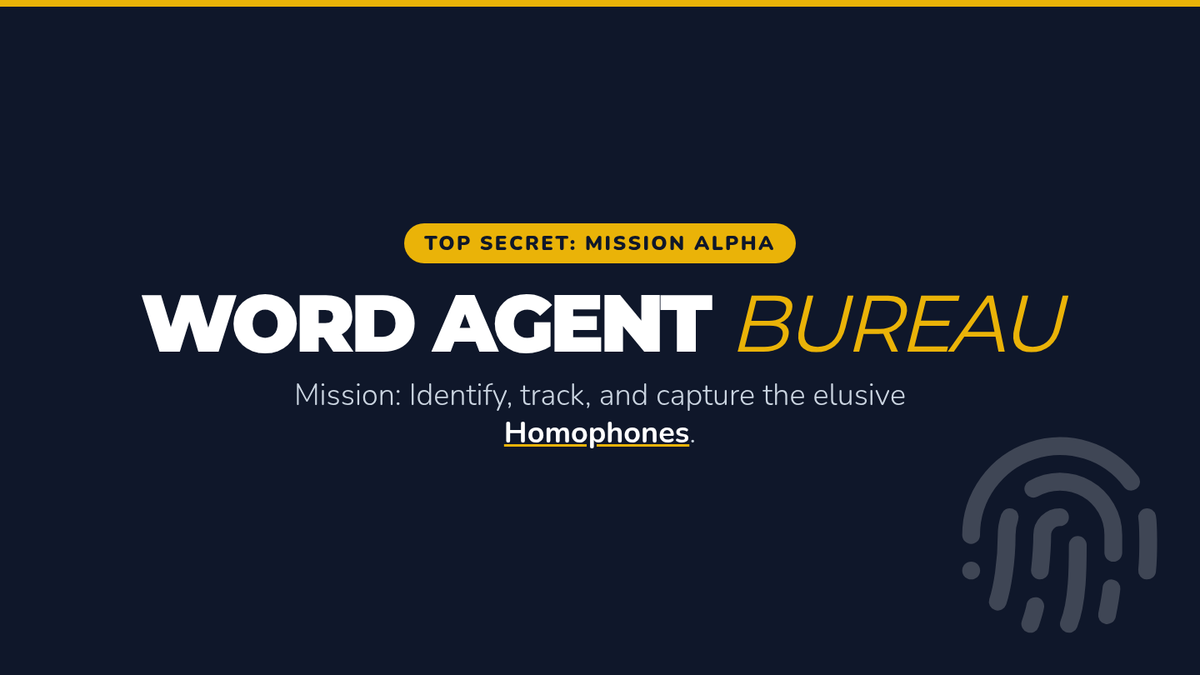 A game-based sequence focused on the rapid identification and correct usage of homophones through competitive and collaborative activities. Students act as 'Word Agents' to solve mysteries, play games, and compete in a final tournament to master spelling and context clues.
