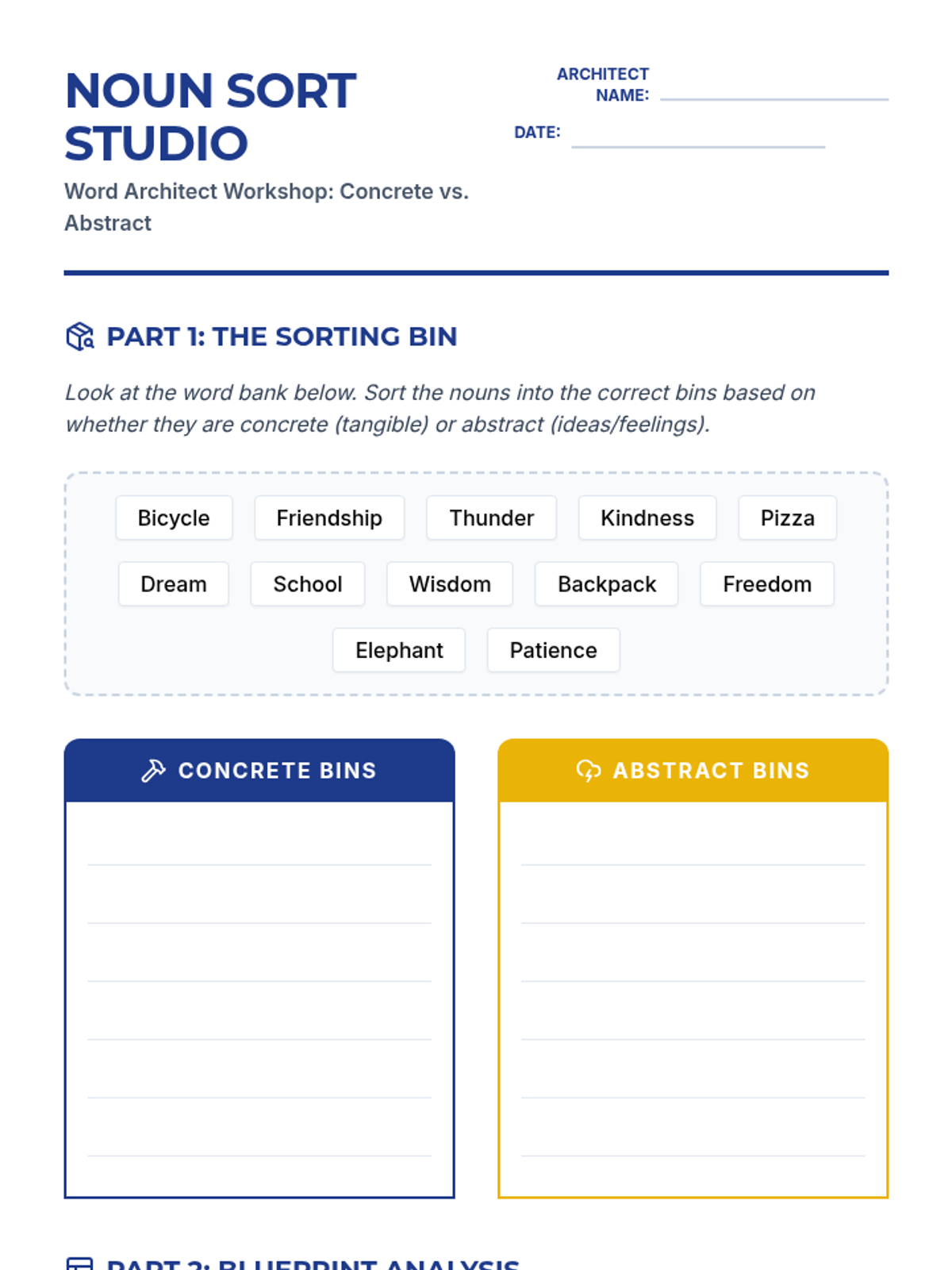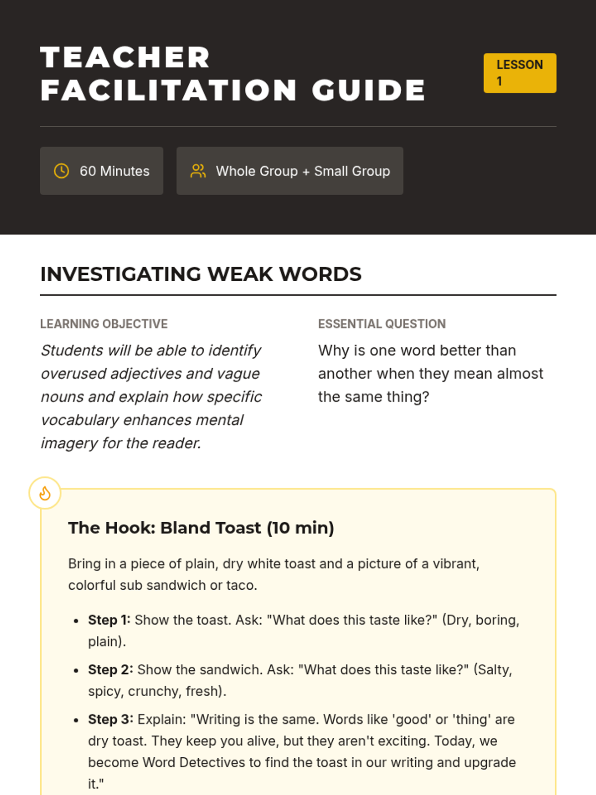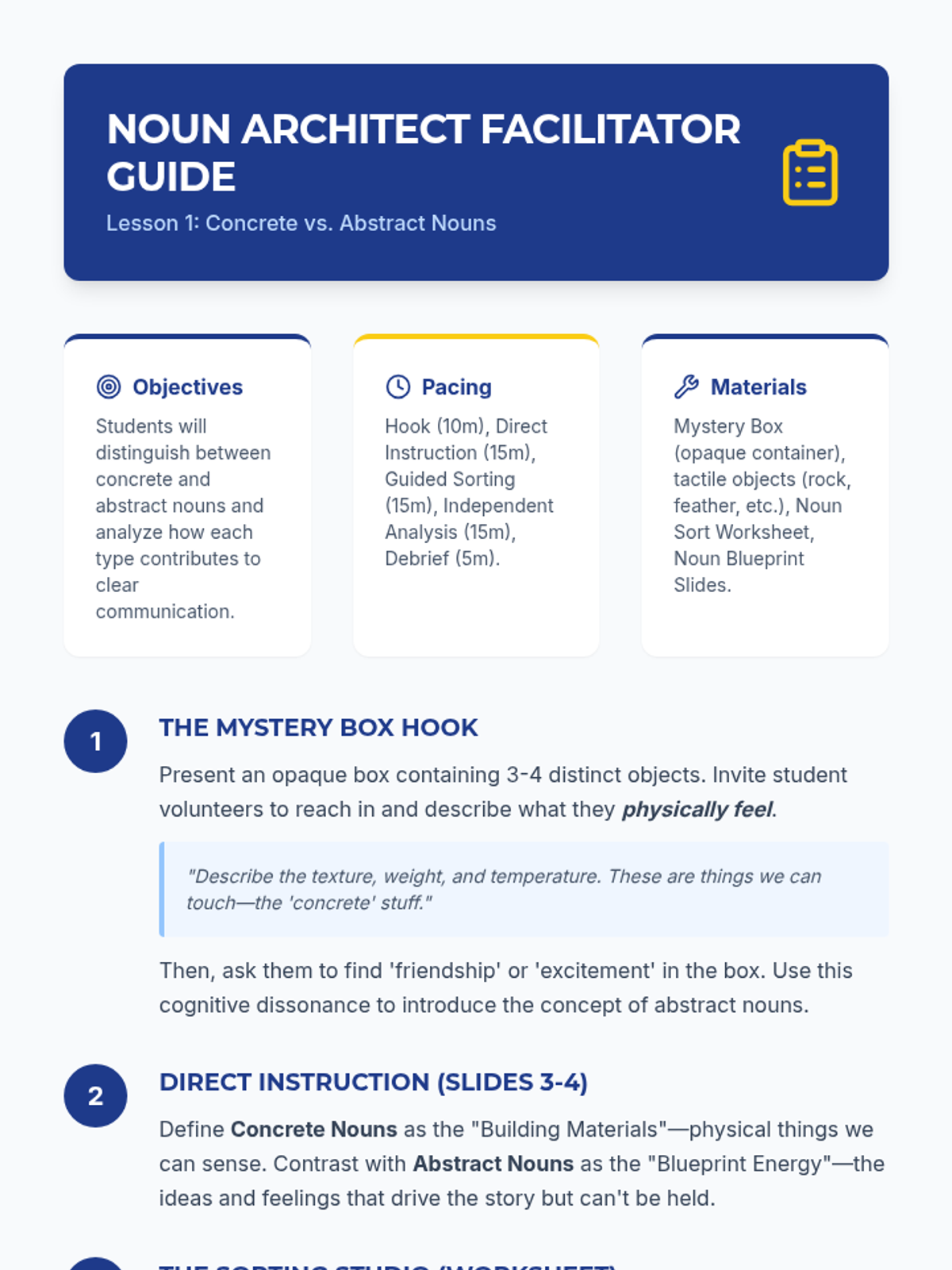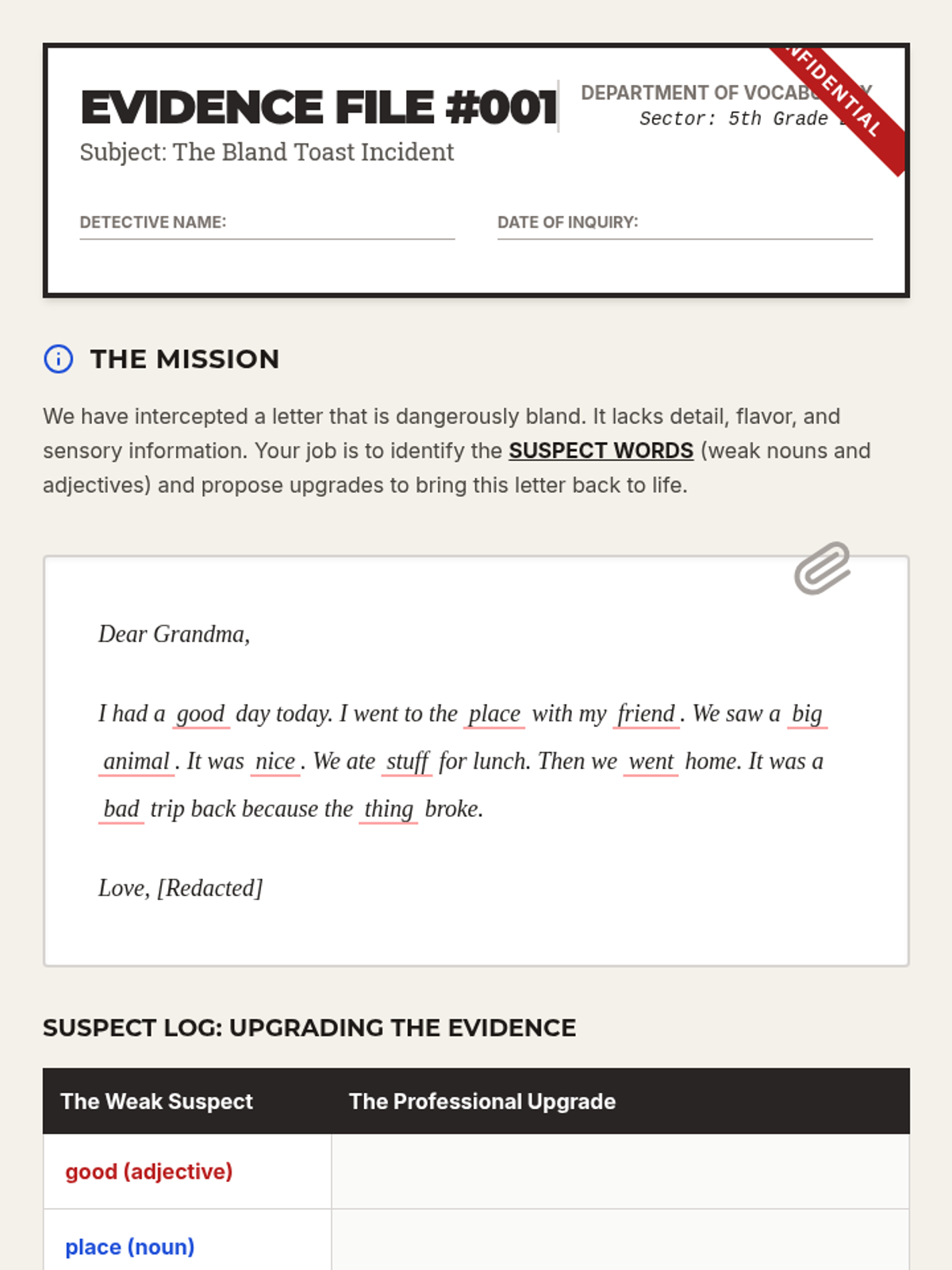 This writing workshop sequence moves students beyond basic identification of nouns and adjectives toward strategic application in narrative writing. Students practice replacing general nouns with concrete alternatives and weak adjectives with vivid modifiers to enhance reader visualization.