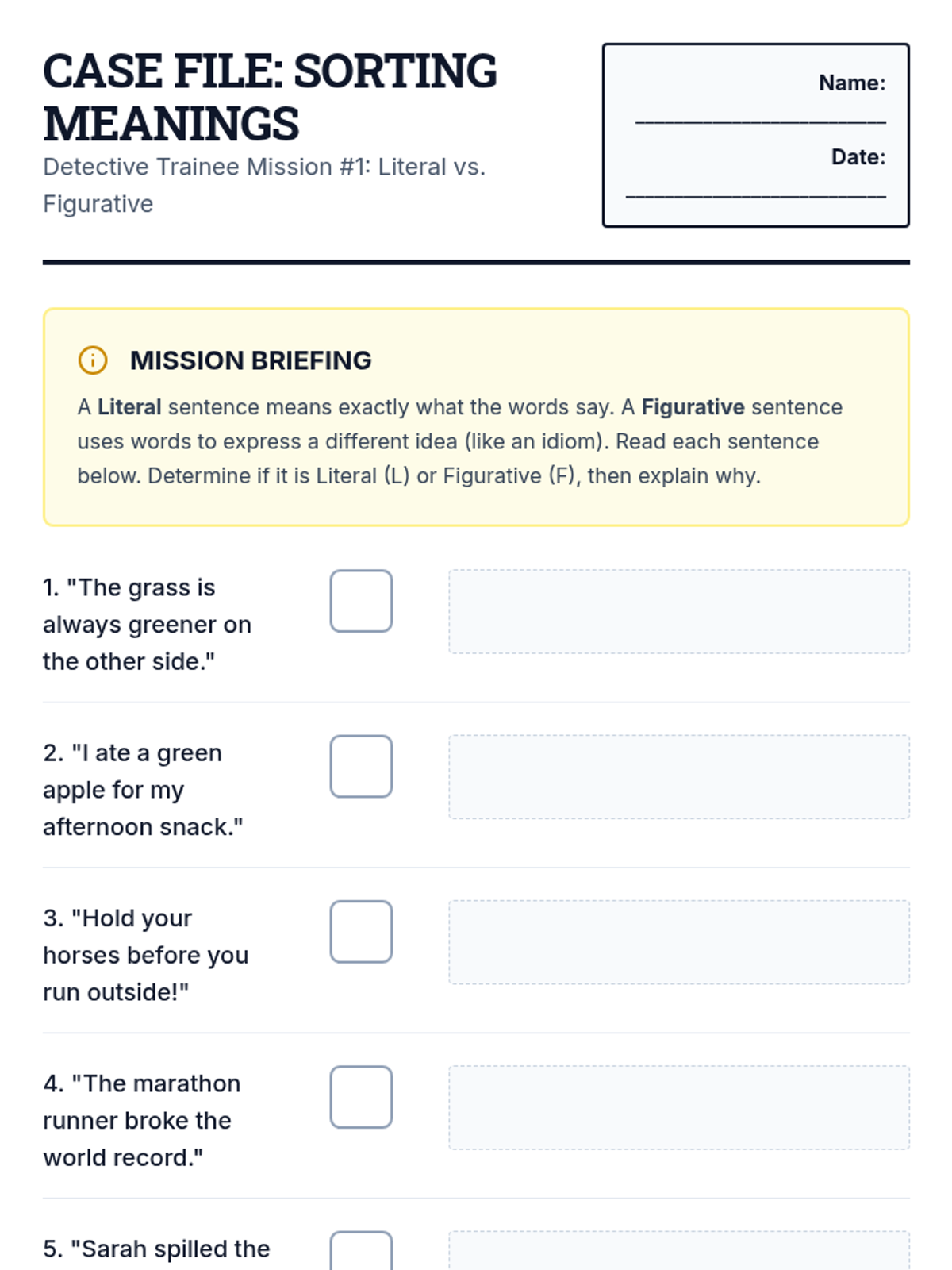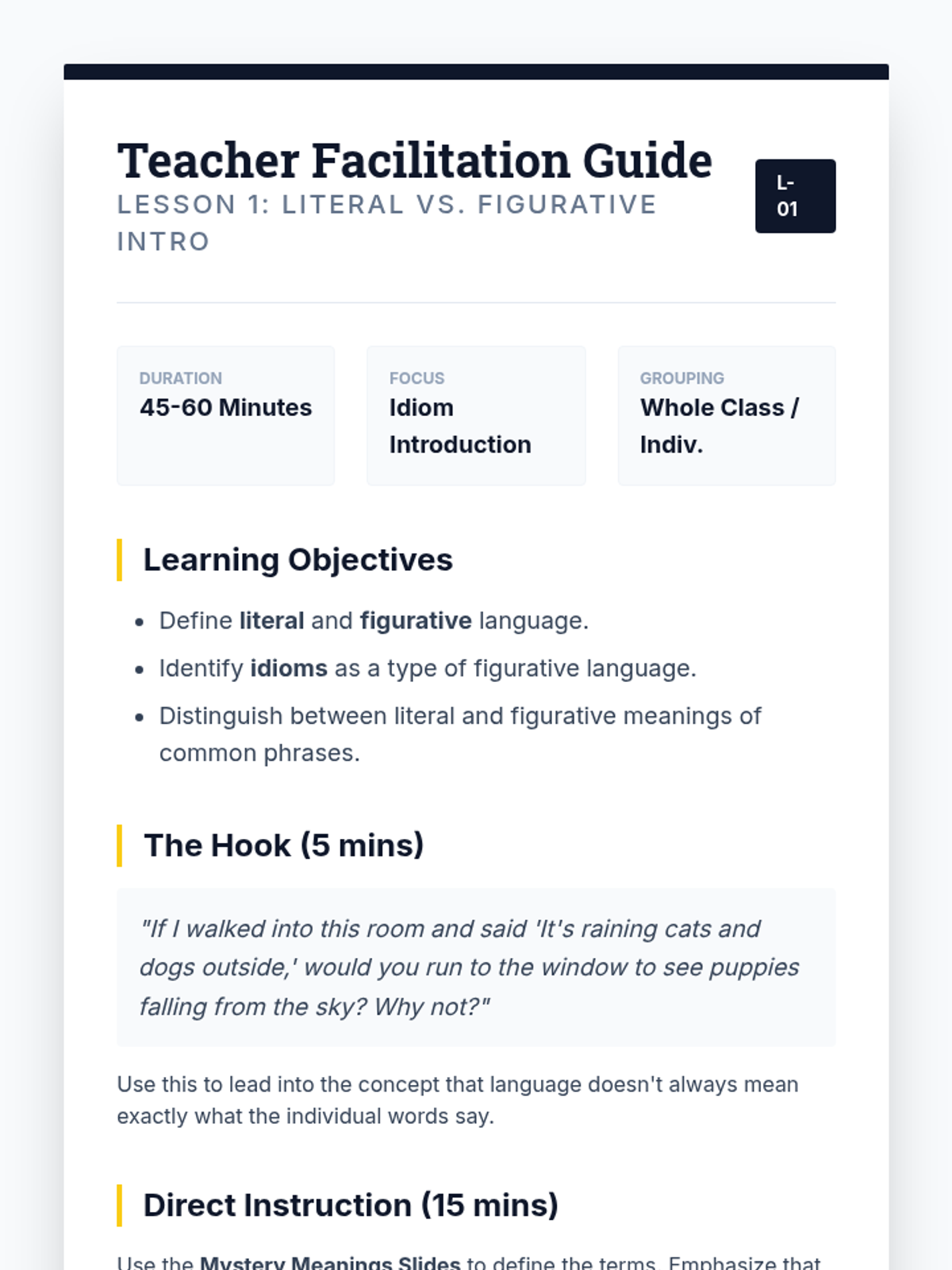 A 5th-grade ELA sequence focused on distinguishing literal from figurative language, specifically idioms. Students move from basic definitions to using context clues and analyzing idioms in informational texts.