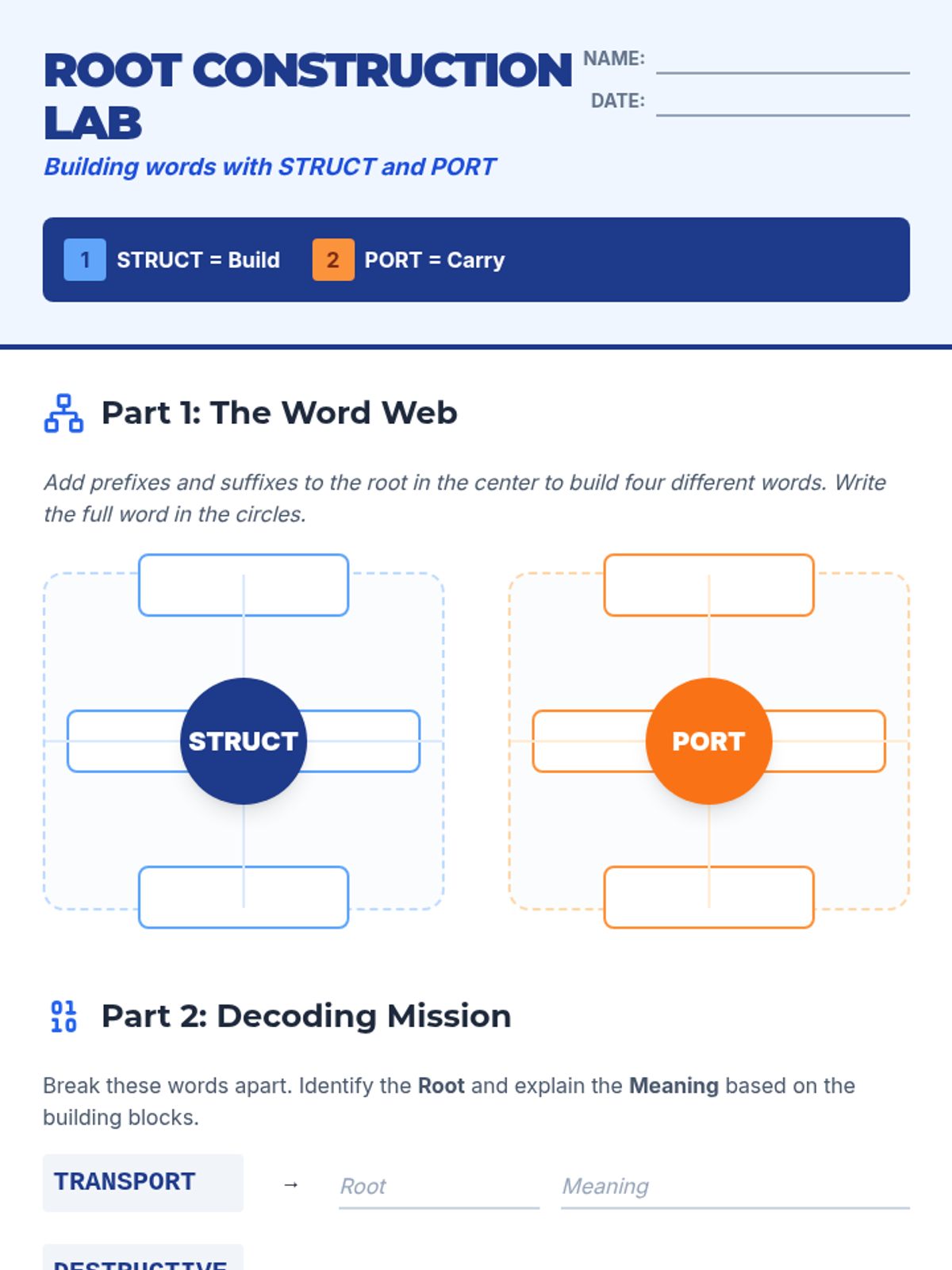 This sequence transforms spelling from rote memorization into a construction project. Students explore Greek and Latin roots (morphemes) as the 'DNA' of English vocabulary, learning to spell complex academic words by understanding their meaningful building blocks.
