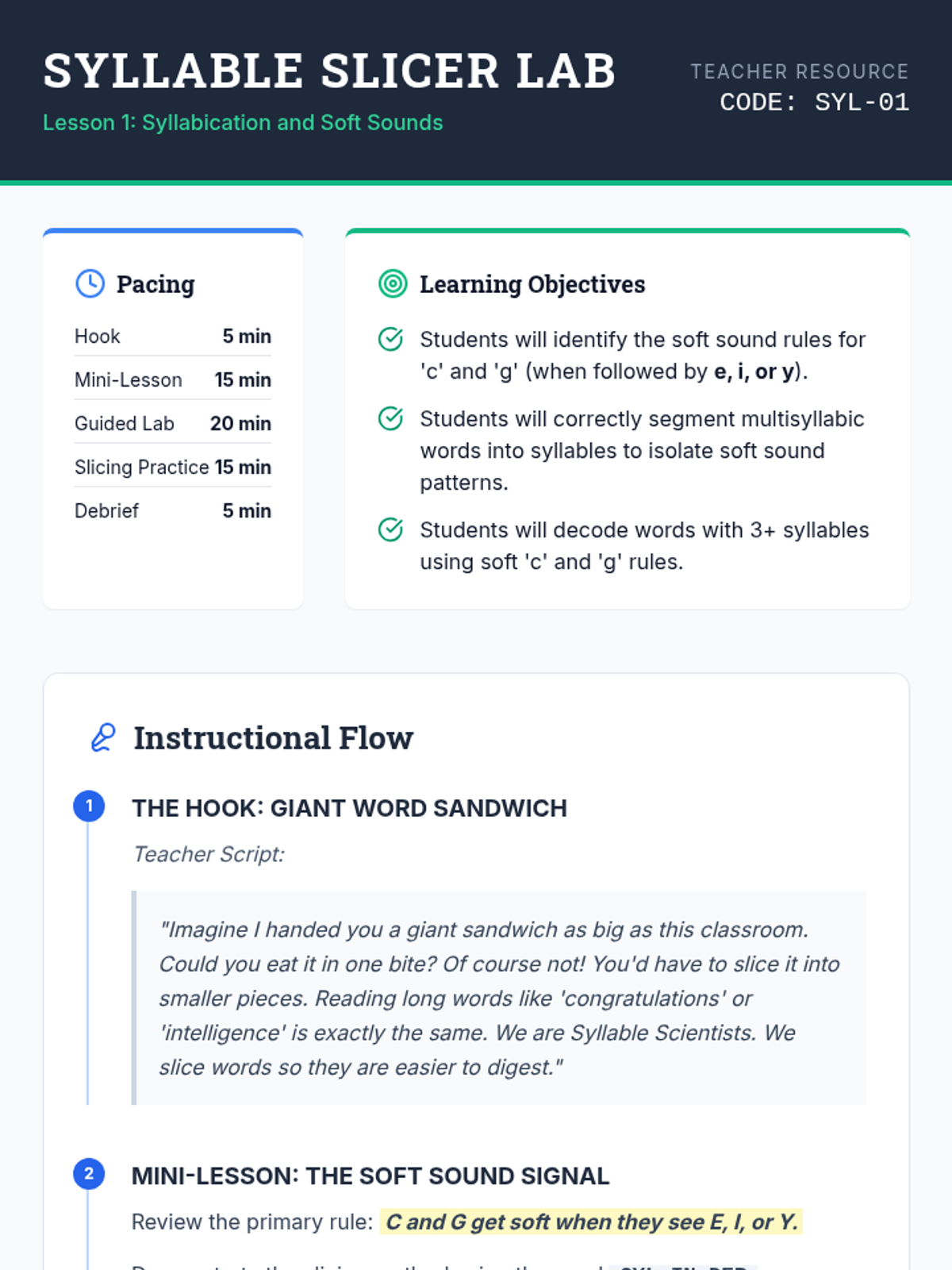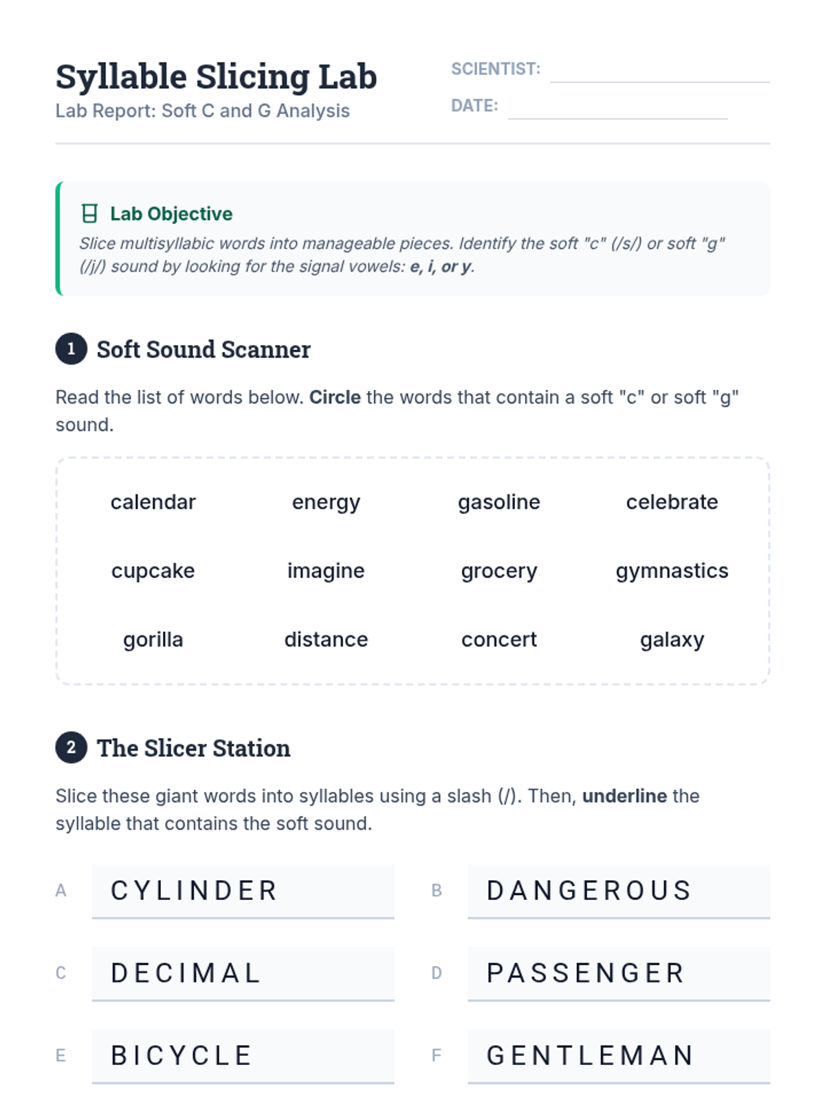 A comprehensive 3rd-grade sequence focused on soft 'c' and 'g' in multisyllabic words, morphological changes, and rule exceptions. Students progress from basic decoding to analyzing academic vocabulary and editing complex texts.