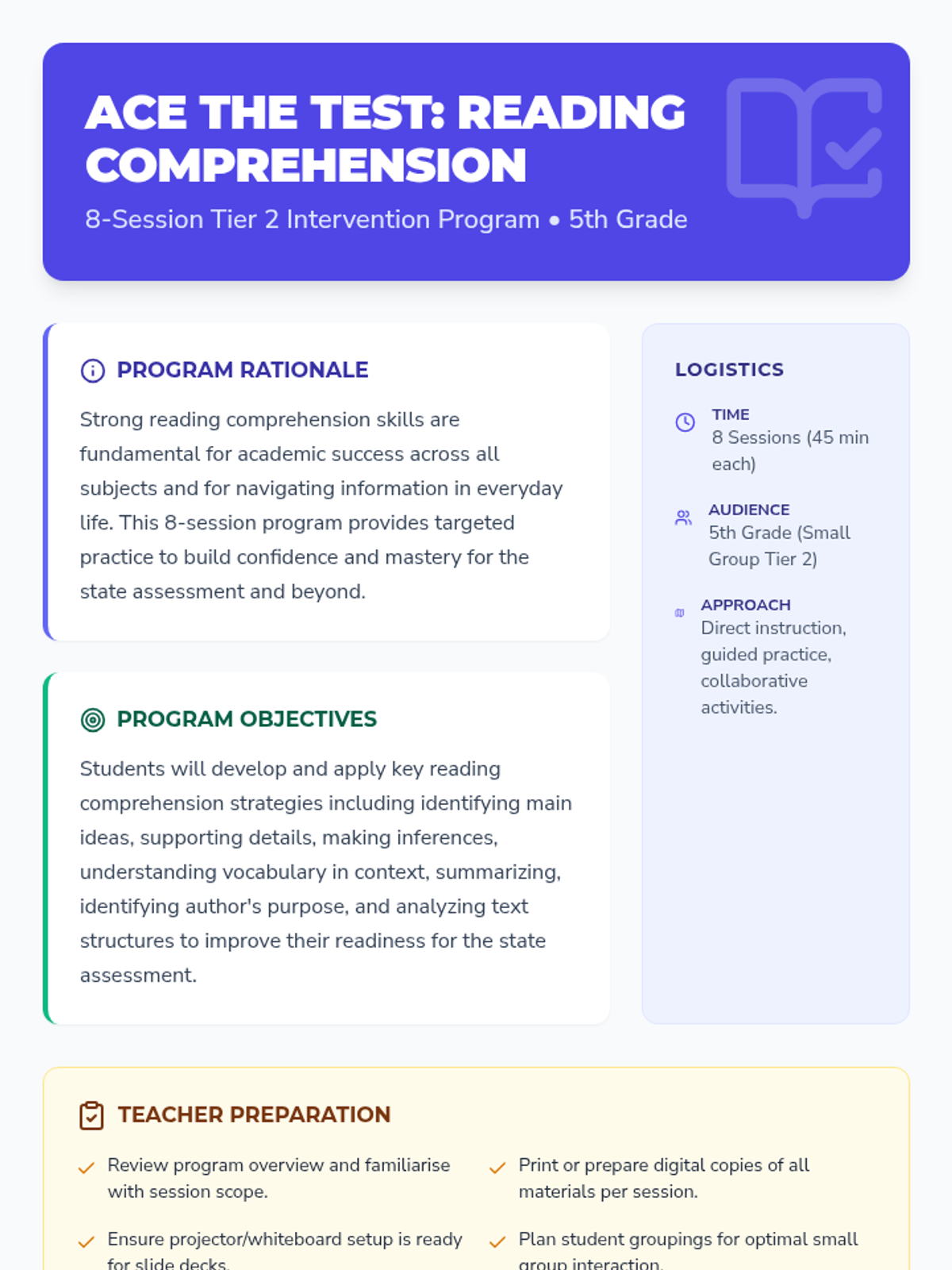 An 8-session Tier 2 intervention program designed to help 5th-grade students master essential reading comprehension strategies like main idea, inferences, and text structure to succeed on state assessments.