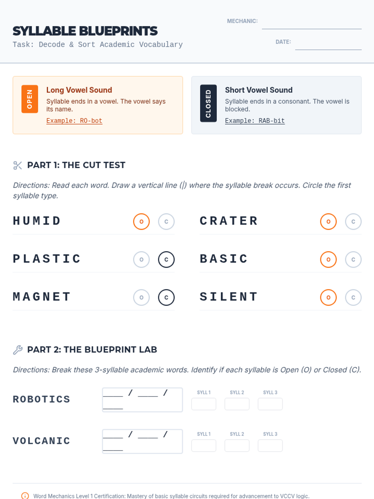 A 5th-grade phonics and reading foundations sequence focused on decoding multisyllabic academic vocabulary using syllable division rules. Students progress from identifying open and closed syllables to mastering VCCV/VCV patterns, vowel teams, r-controlled vowels, and final stable syllables.