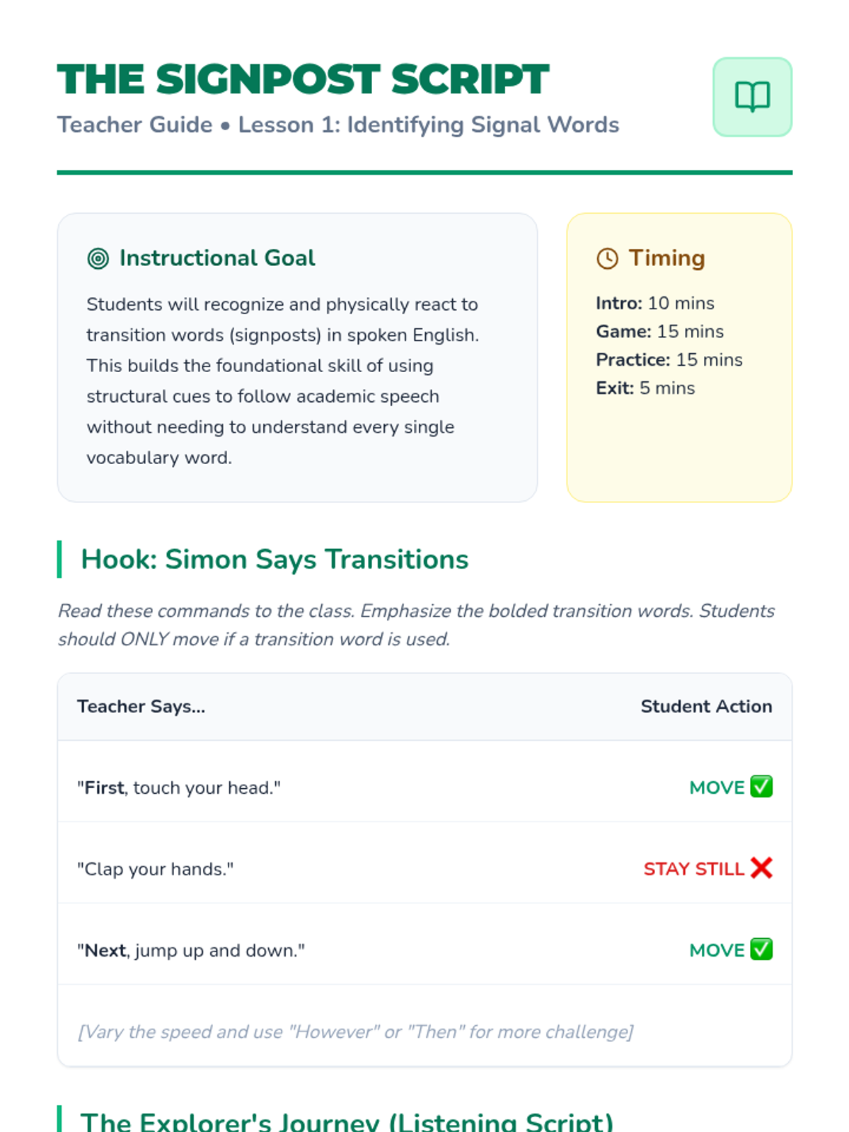 This 5th-grade ESL listening sequence focuses on academic readiness by training students to decode complex, multi-step instructions and academic lectures. Students will master signal words, spatial visualization, keyword note-taking, and natural speech reductions through a series of "Listening Agent" missions.
