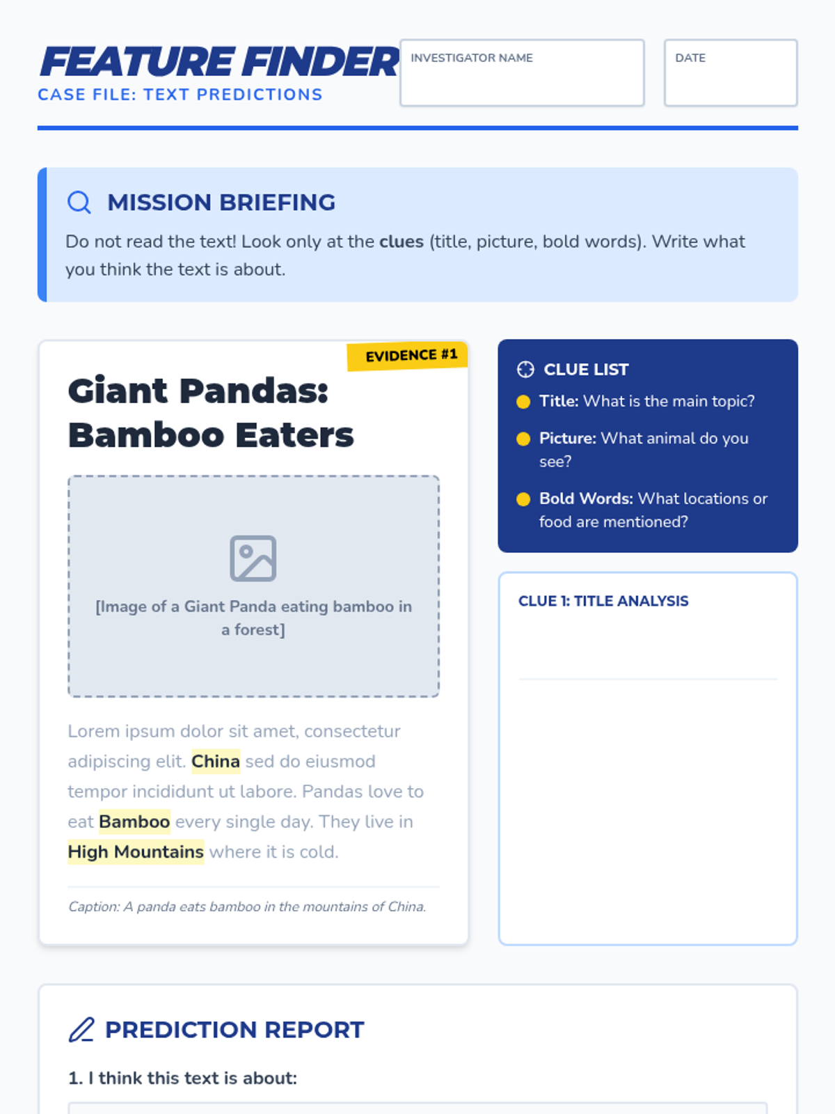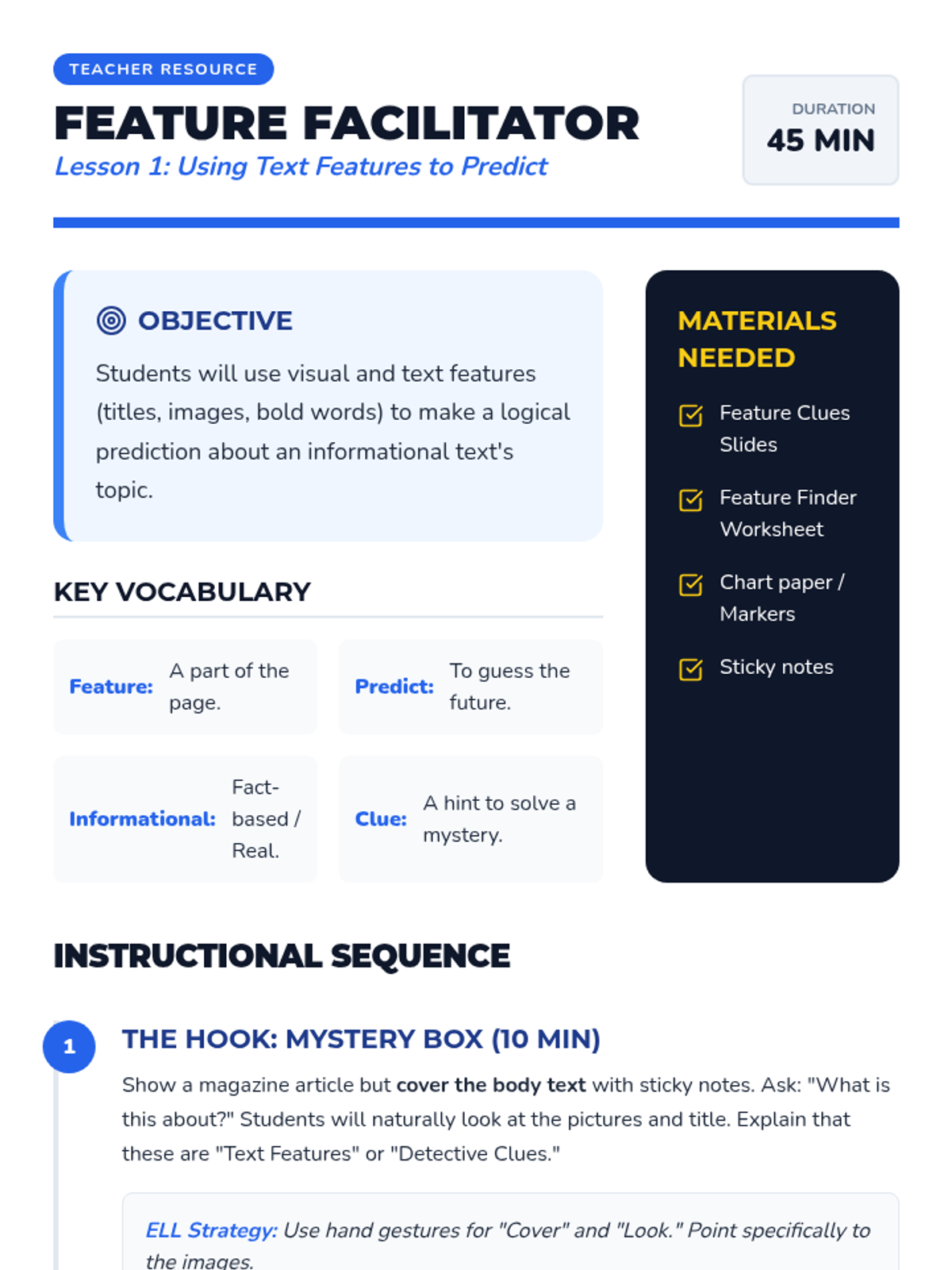 A comprehensive sequence designed for 5th-grade beginner English Language Learners to master the art of extracting key details from informational texts. Through five progressive lessons, students learn to use text features, scan for keywords, apply the 5 Ws, sequence information, and create visual summaries to demonstrate comprehension.
