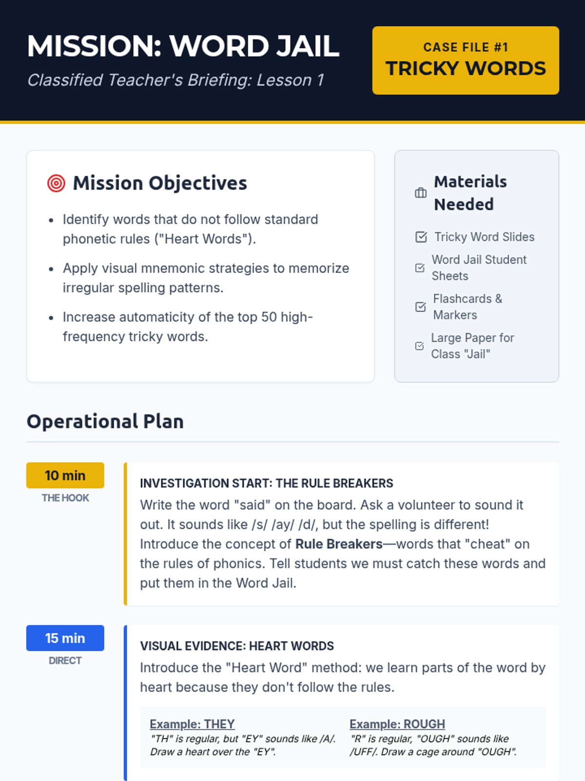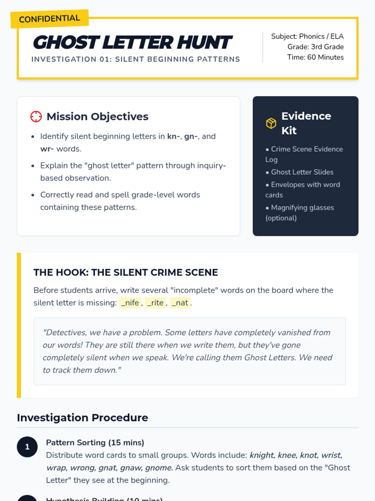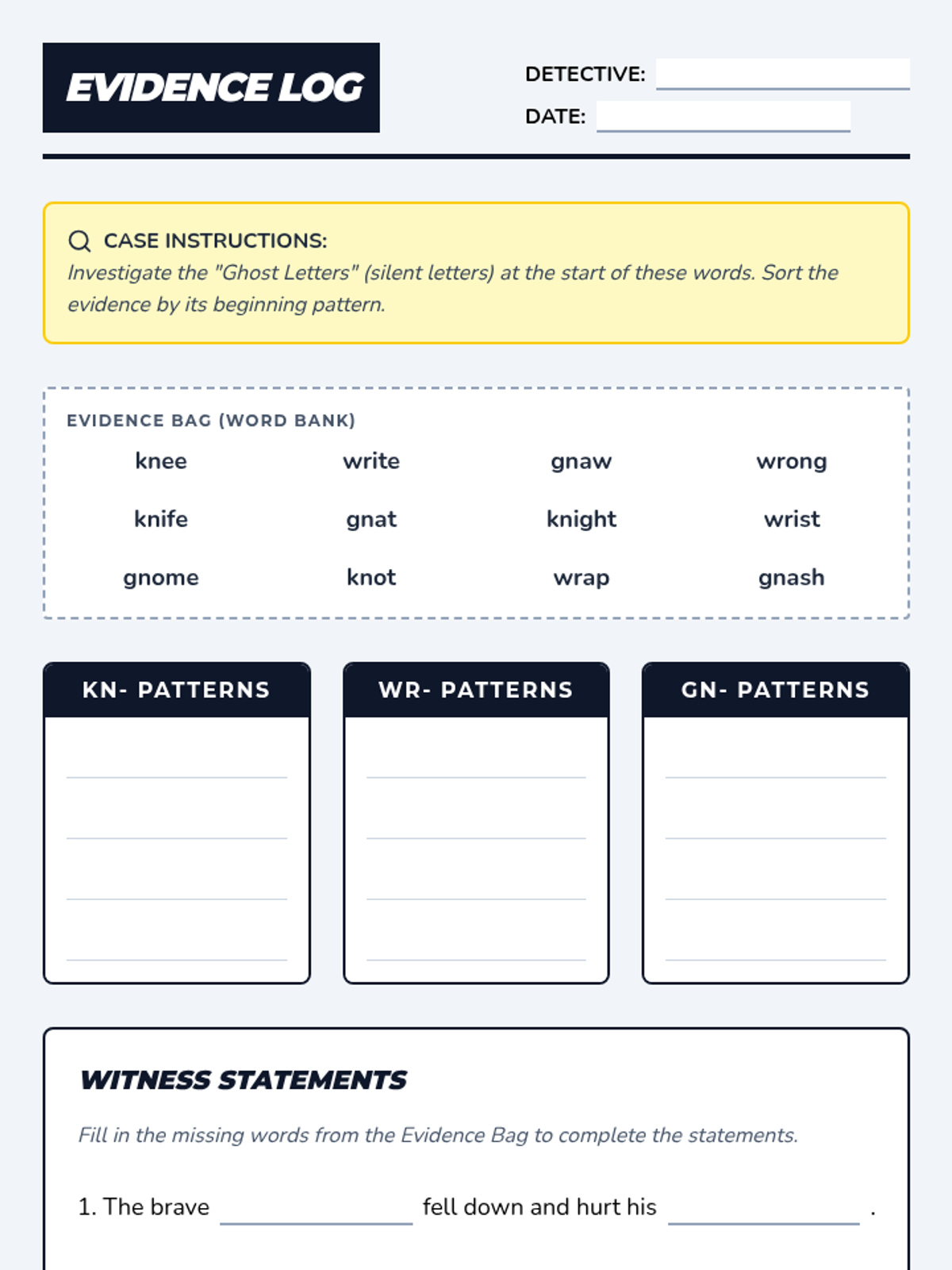 An inquiry-based exploration of 'rule-breaking' digraphs and silent letter combinations (ph, gh, kn, wr, gn, mb). Students act as 'Word Detectives' to investigate orthographic patterns, progressing from identification to contextual application and creative writing.