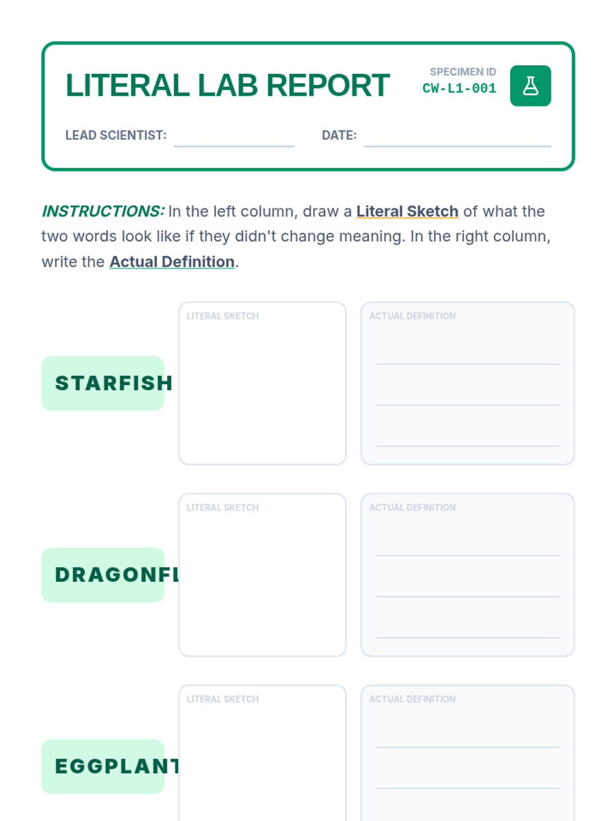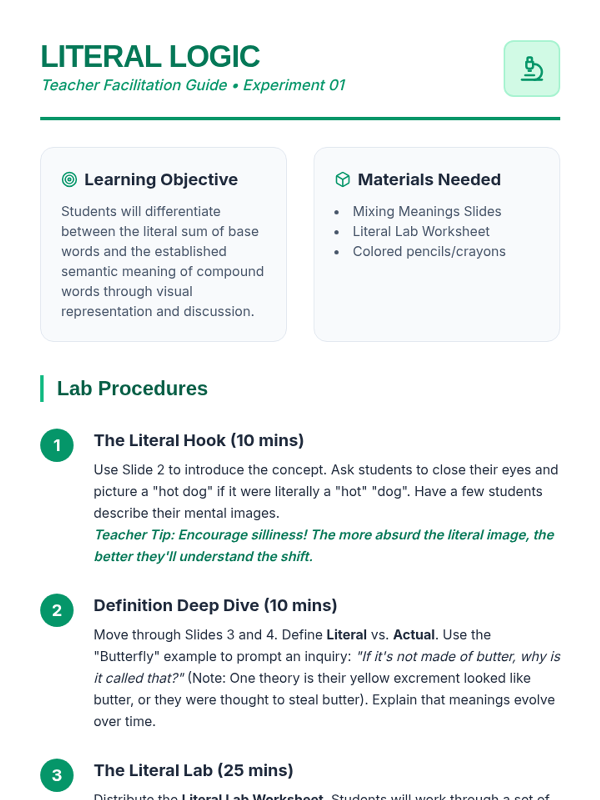 A 5-lesson inquiry into how compound words shift in meaning, comparing literal interpretations with actual definitions through a 'Word Lab' theme. Students explore transparent and opaque compounds, create riddles, and build semantic maps to understand language evolution.