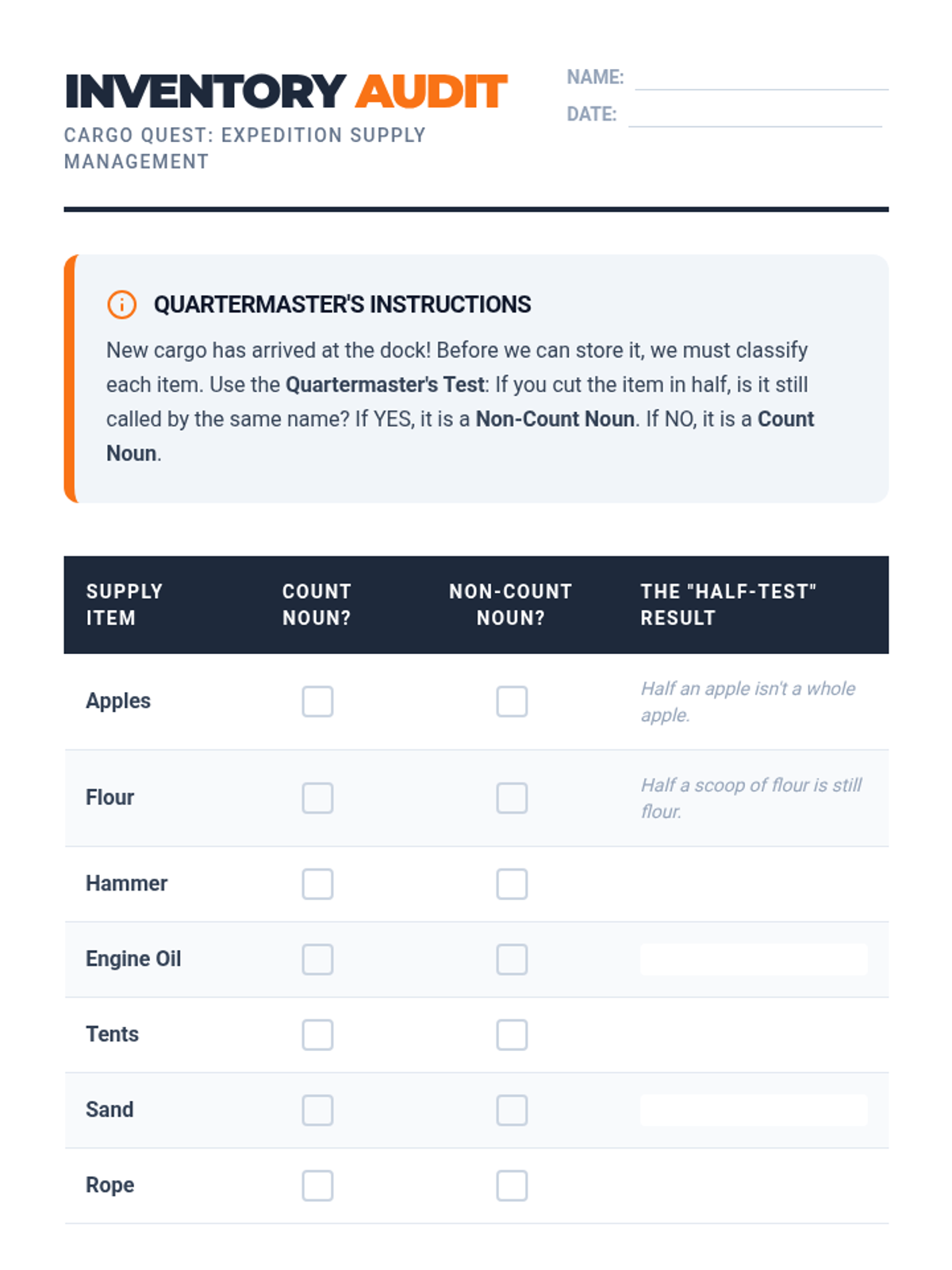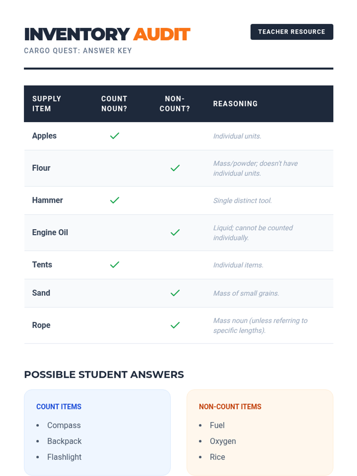 A game-based ELA sequence where 5th-grade students master the use of articles (a, an, the, and null) by distinguishing between count and non-count nouns through the lens of supply management and inventory logistics.