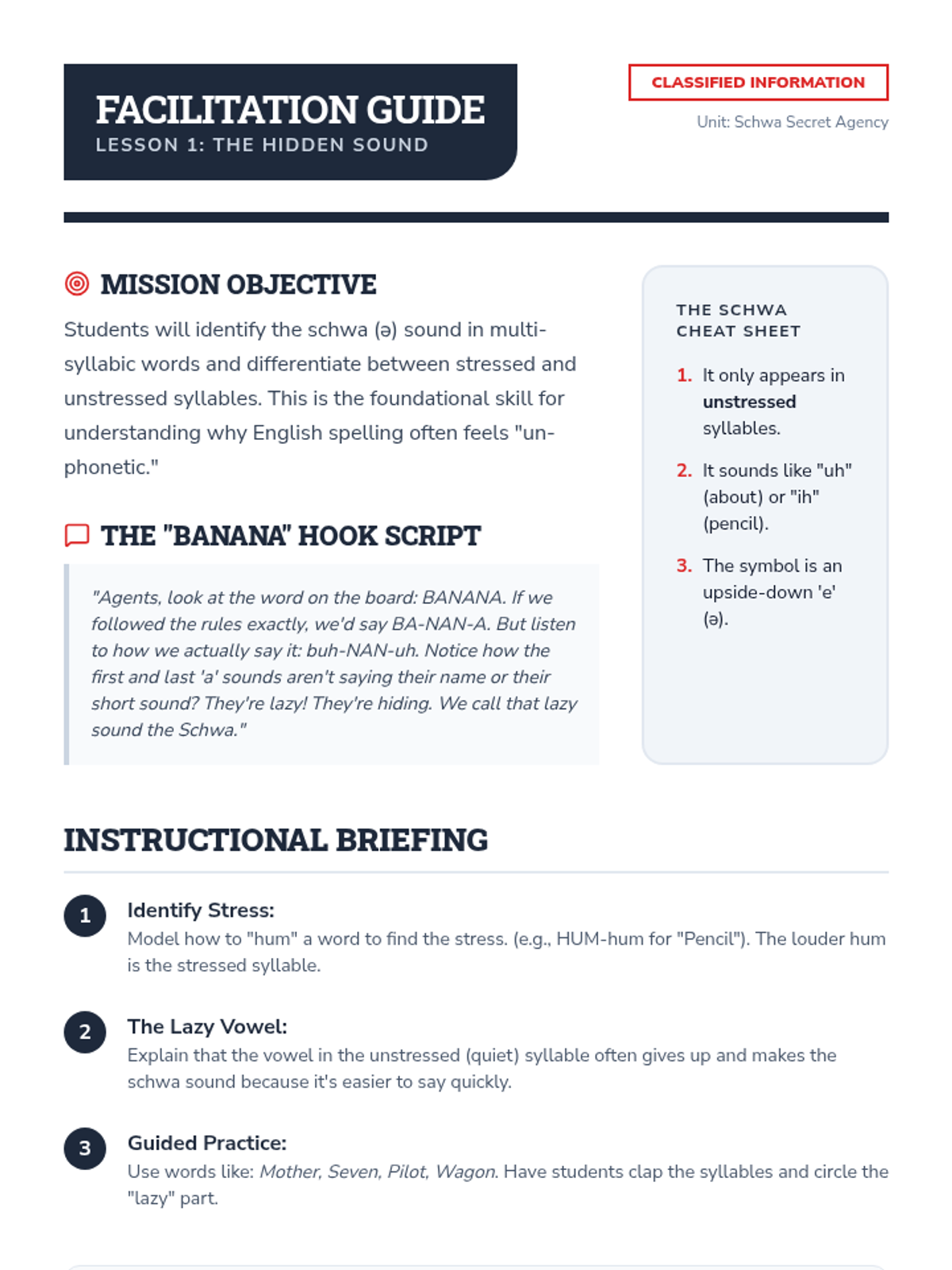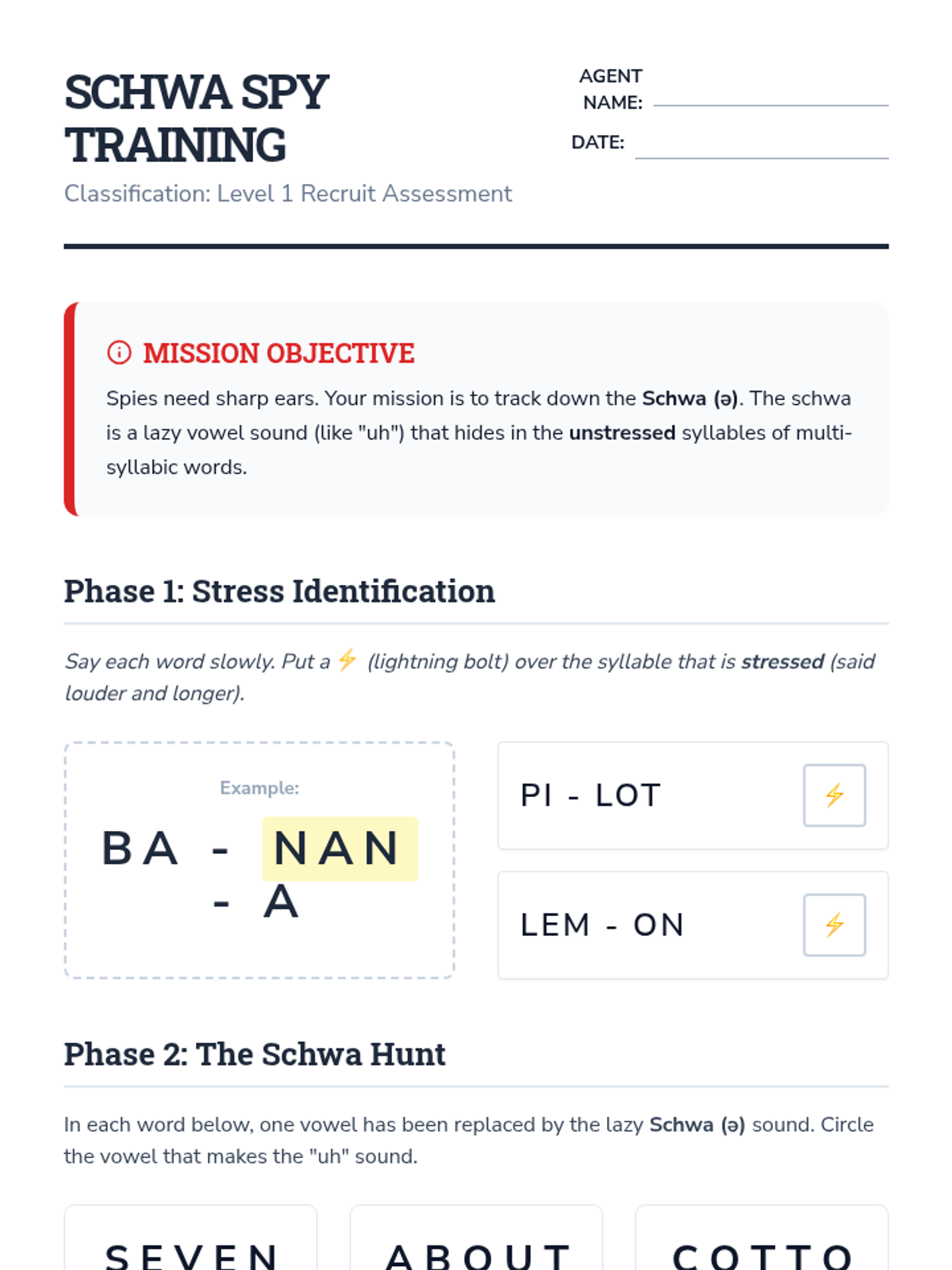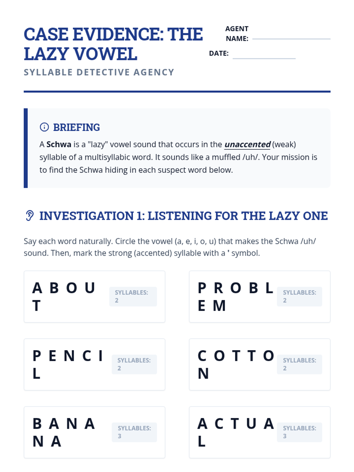 A comprehensive 5th-grade sequence exploring the Schwa sound and syllable stress. Students learn to identify the 'lazy vowel,' map stress patterns, and apply this knowledge to improve spelling and decoding of multisyllabic words.