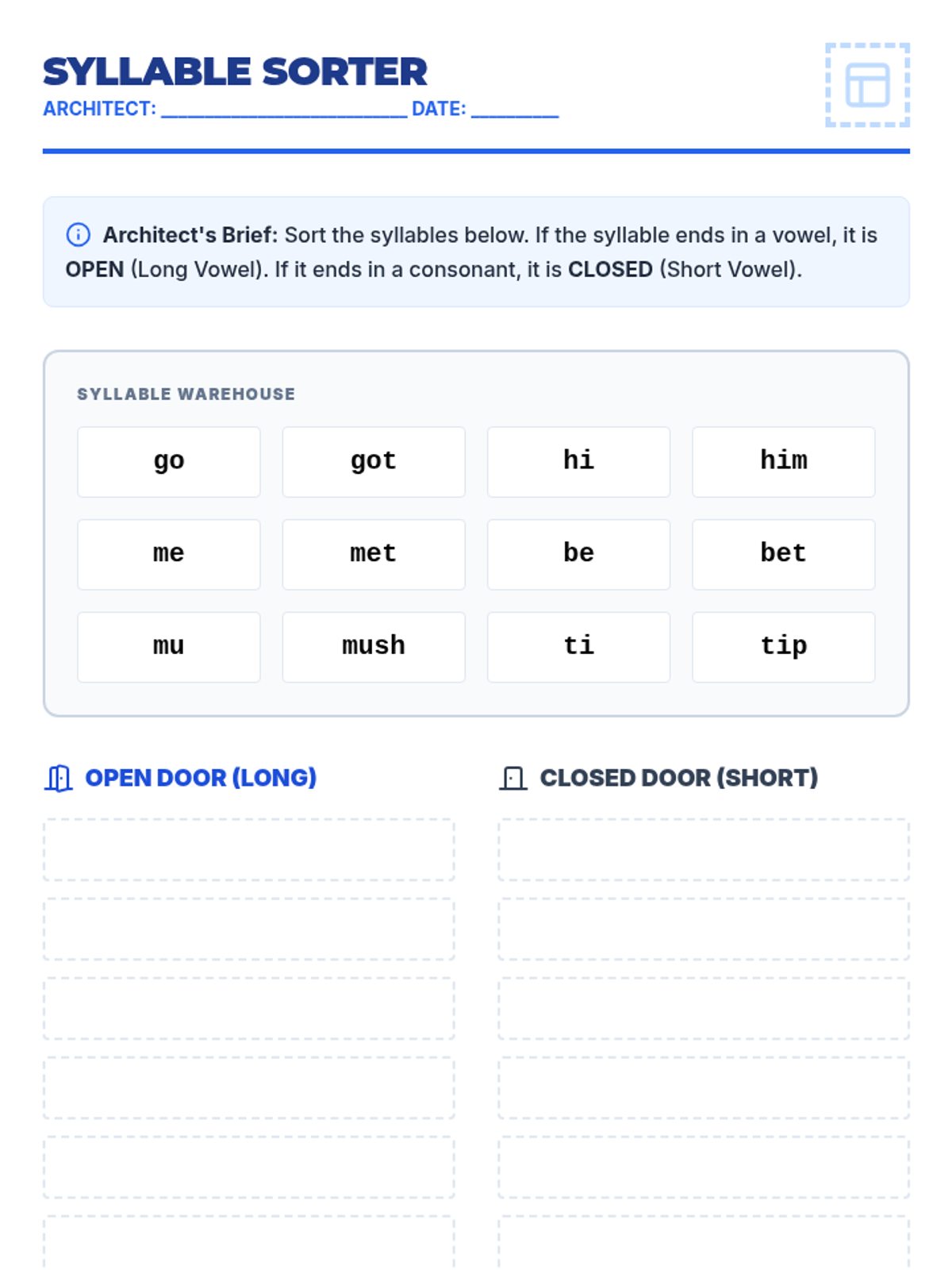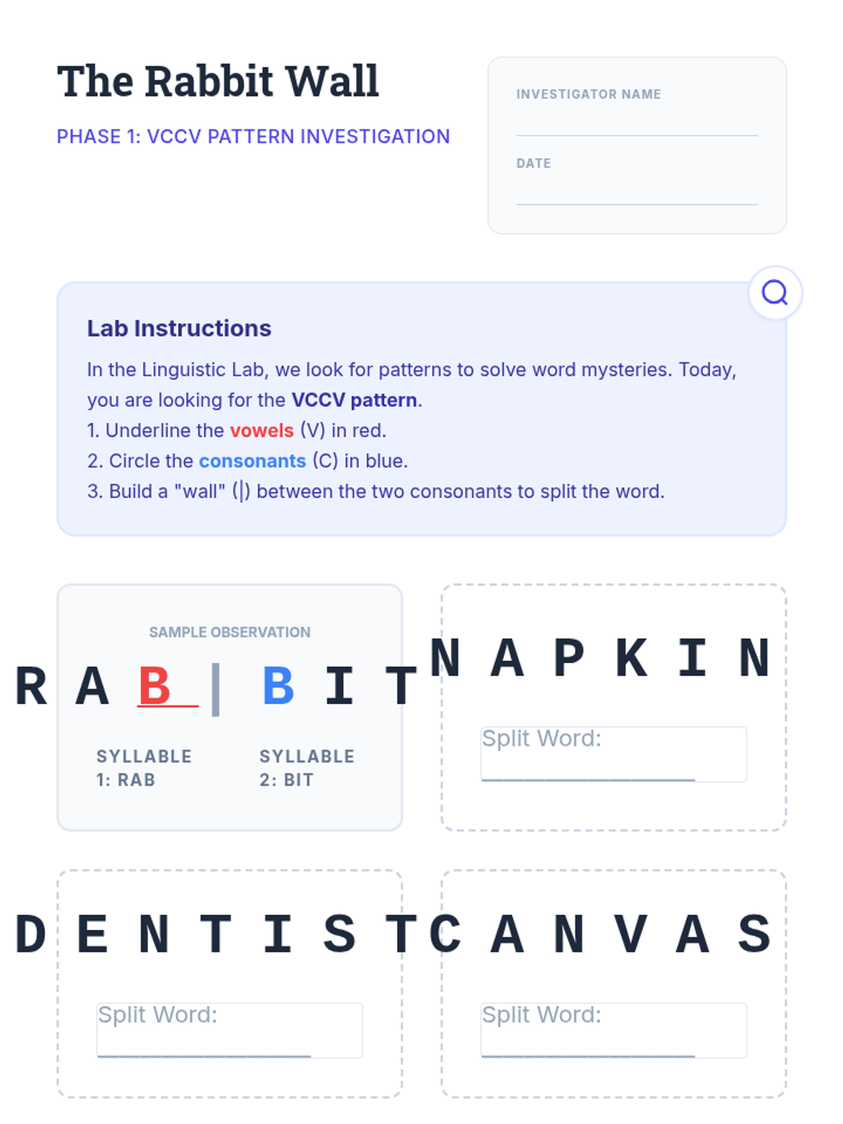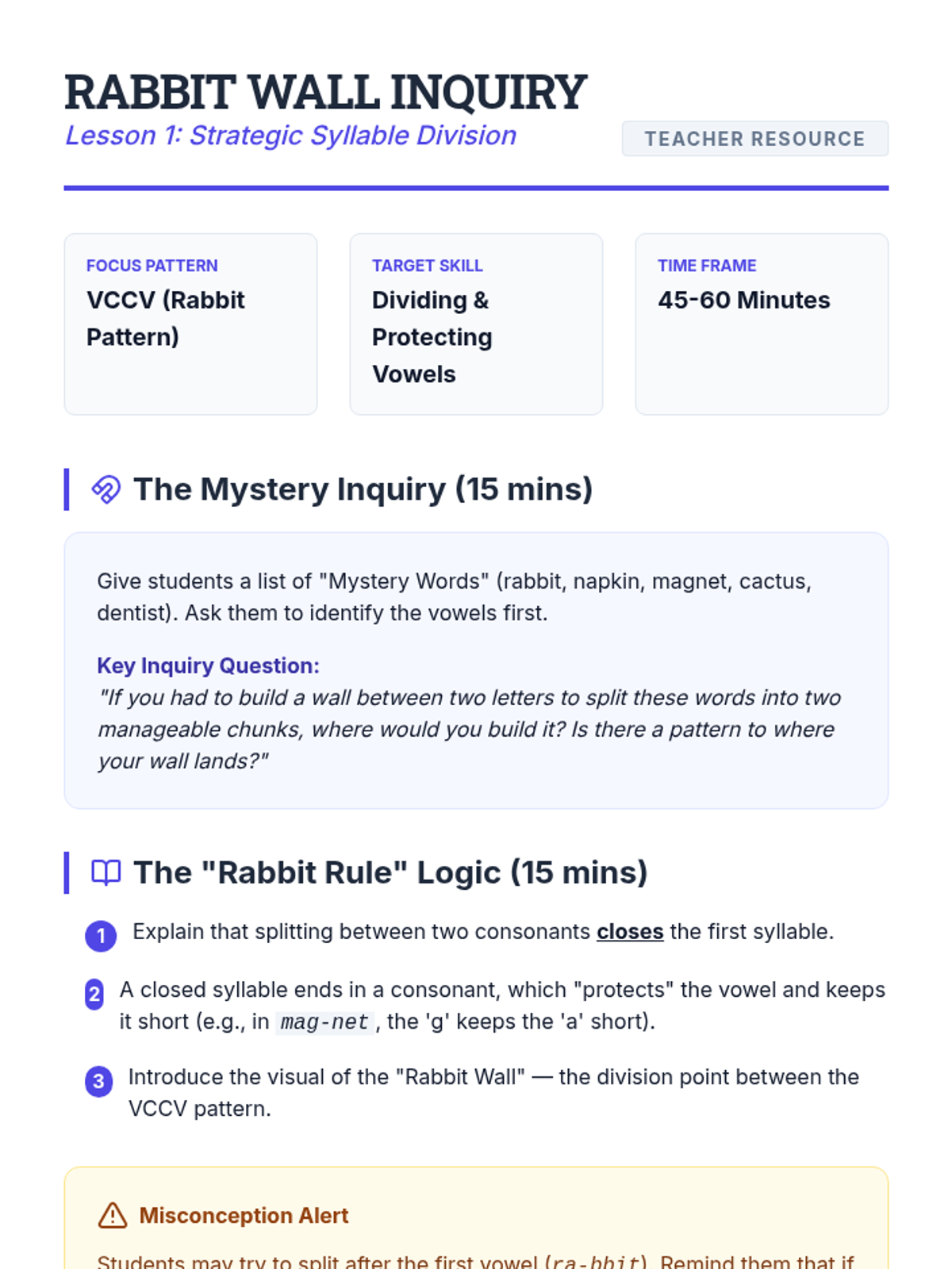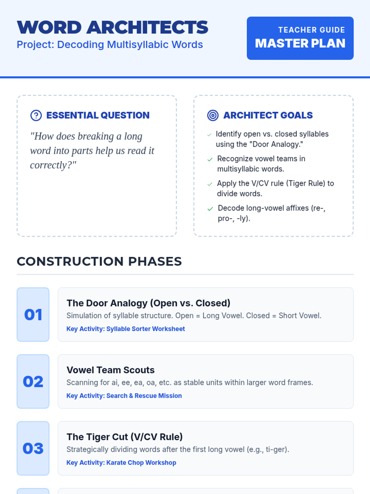 This simulation-based sequence treats students as 'Word Architects' who learn to construct and deconstruct multisyllabic words containing long vowels. The focus moves beyond one-syllable decoding to recognizing open syllables and vowel teams within longer, academic vocabulary.