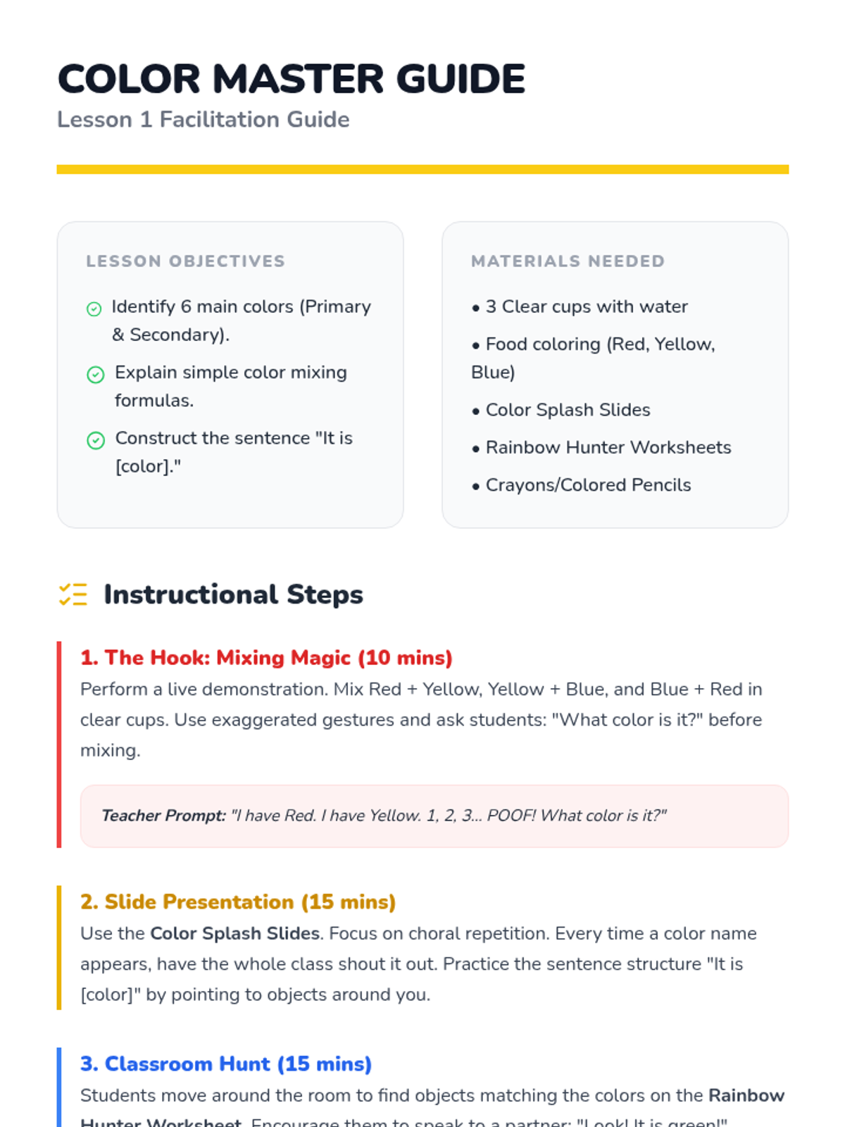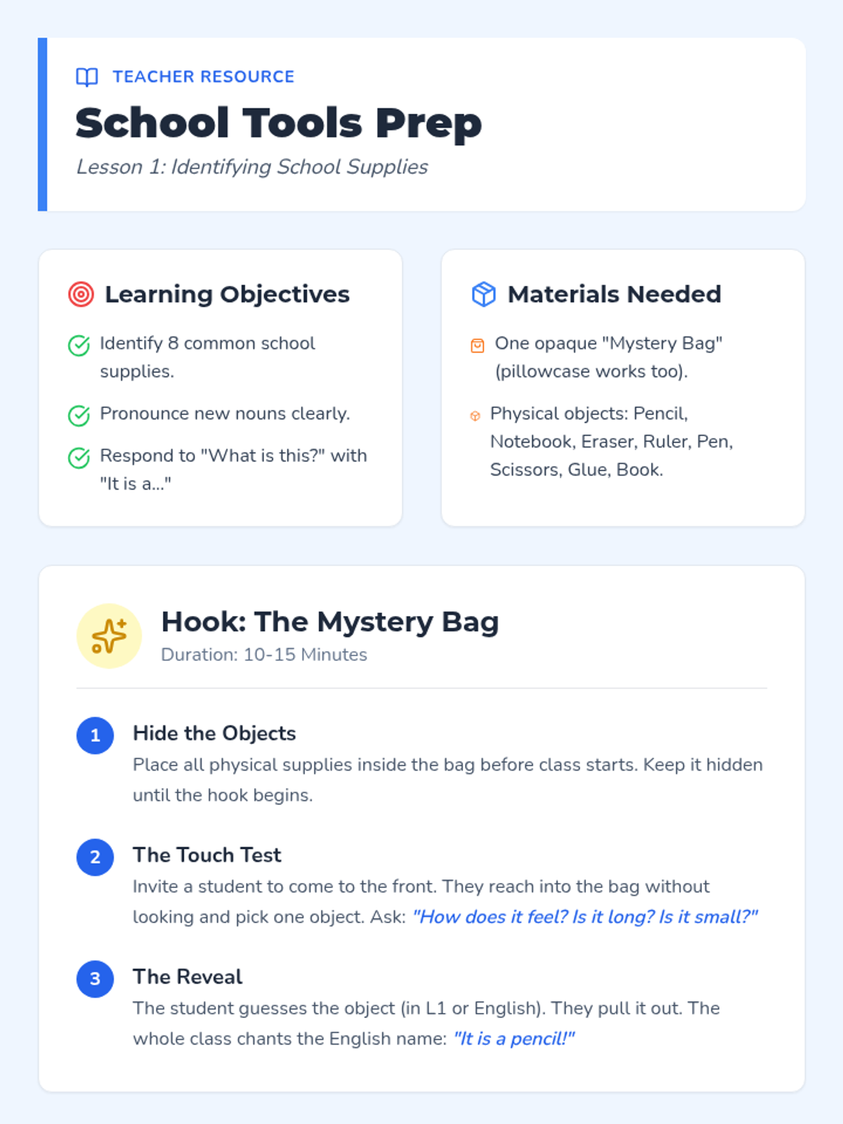 A 5-lesson unit for beginner English Language Learners (ELLs) focusing on classroom objects, instructional commands, colors, numbers, and prepositions. The sequence uses Total Physical Response (TPR) and gamified activities to build foundational vocabulary.