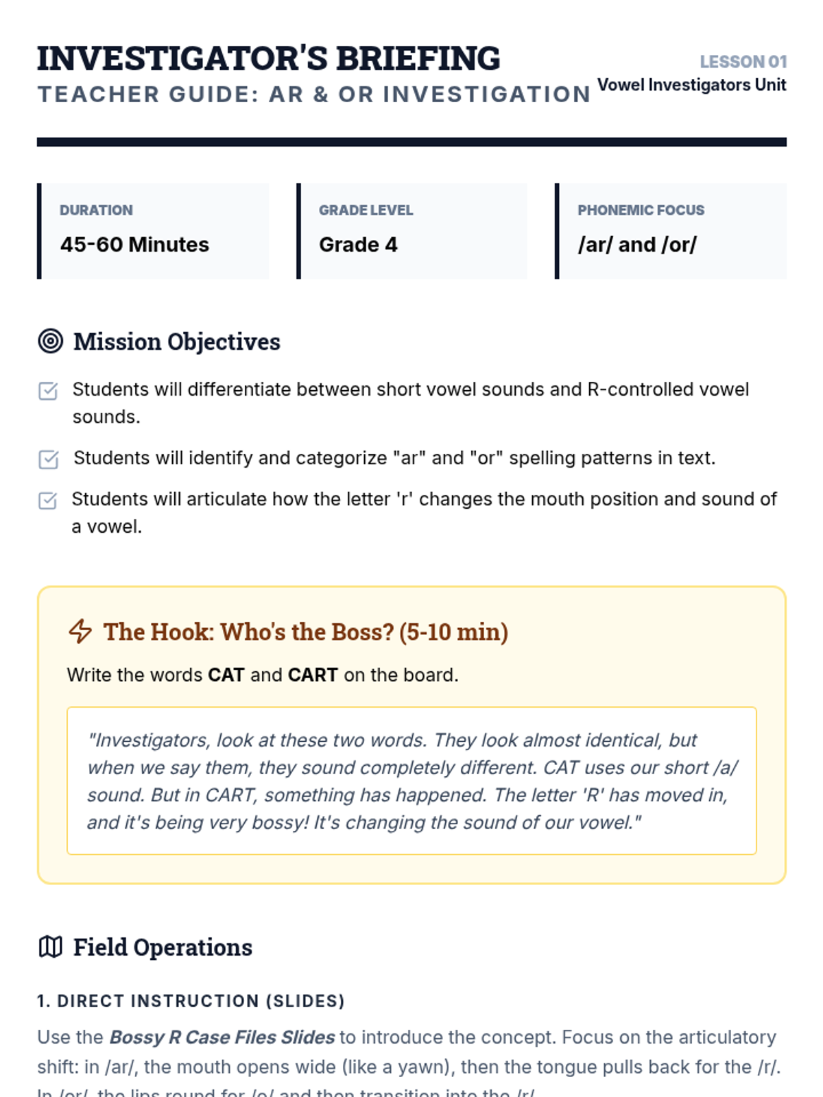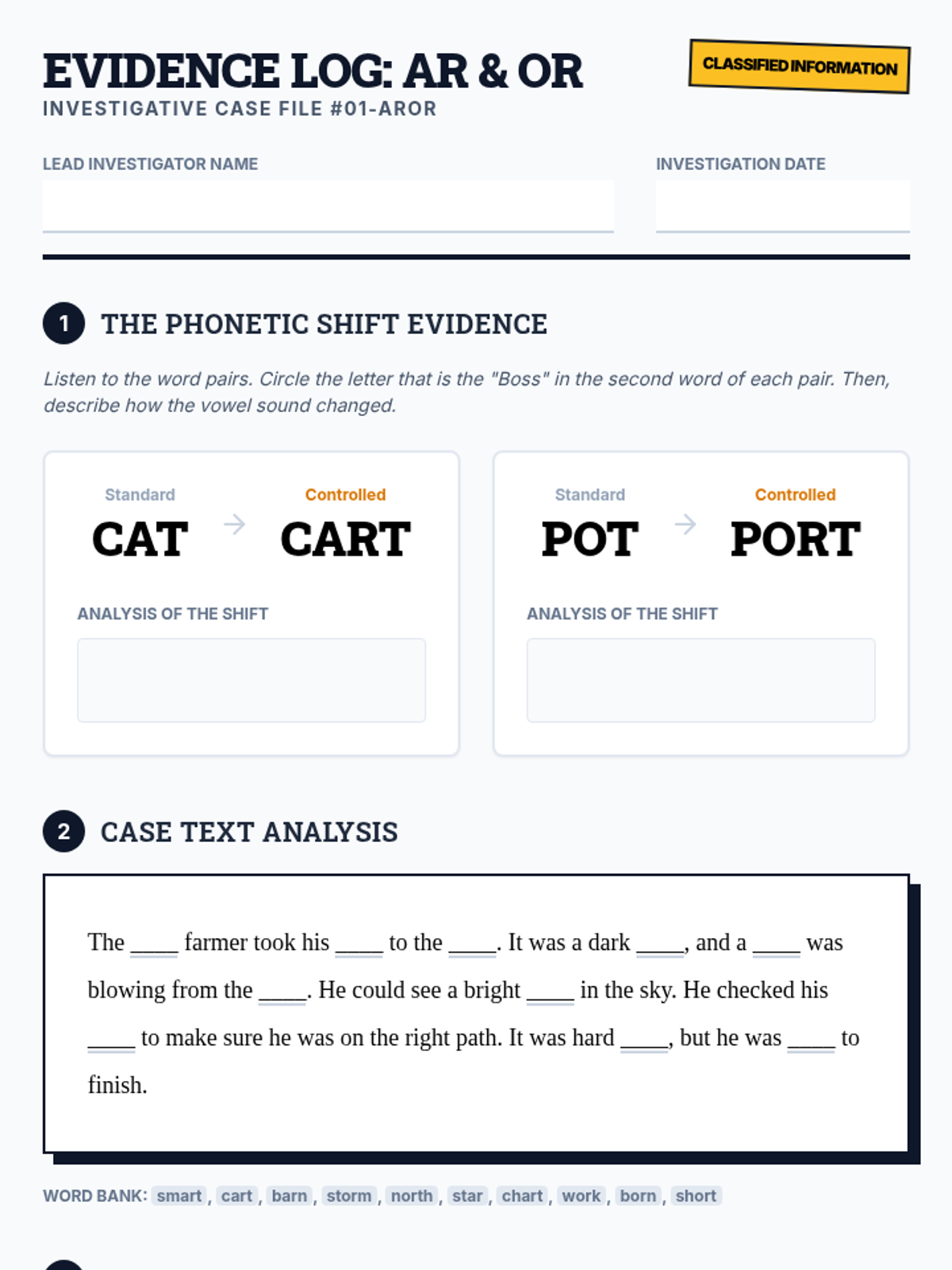 Students investigate the influence of the letter 'r' on preceding vowels, analyzing how it distorts standard vowel sounds to create new phonemes. Using an inquiry-based approach, the class acts as linguistic investigators to categorize 'bossy r' patterns and bridge into complex variations like 'air', 'ear', and 'ore'.