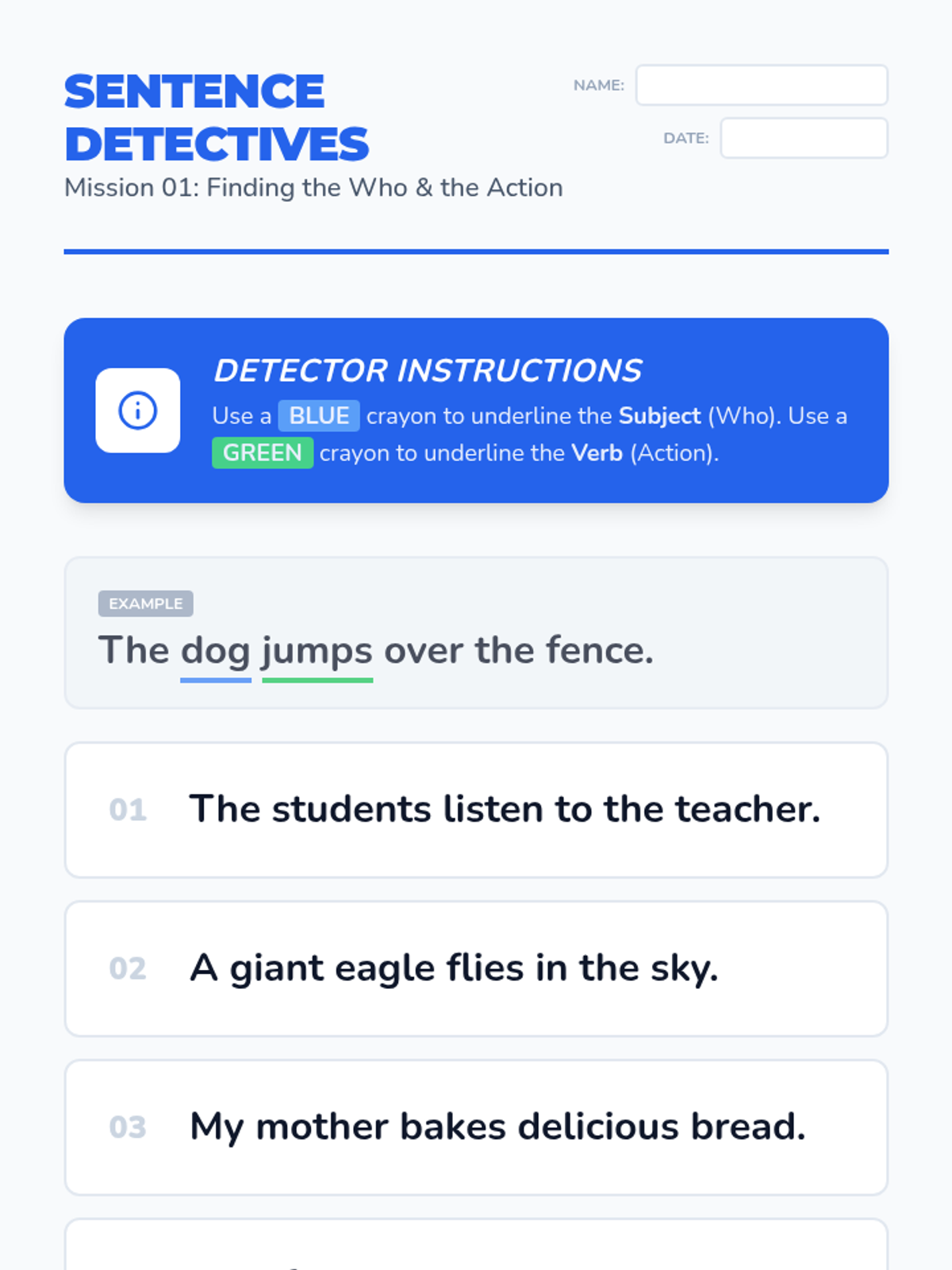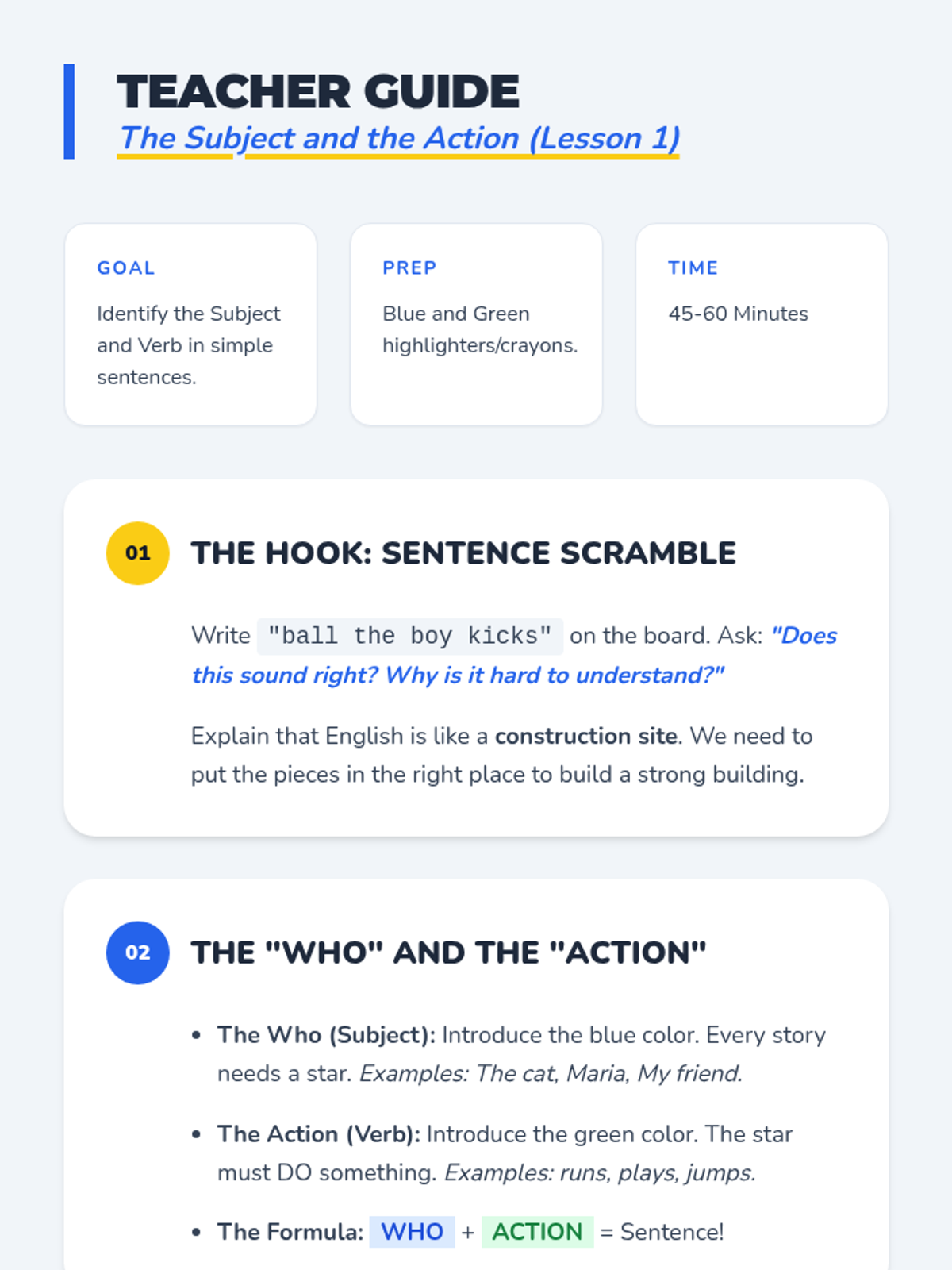 A comprehensive unit for beginner ELL students to master English sentence architecture, moving from basic Subject-Verb-Object patterns to descriptive expansion and compound structures.