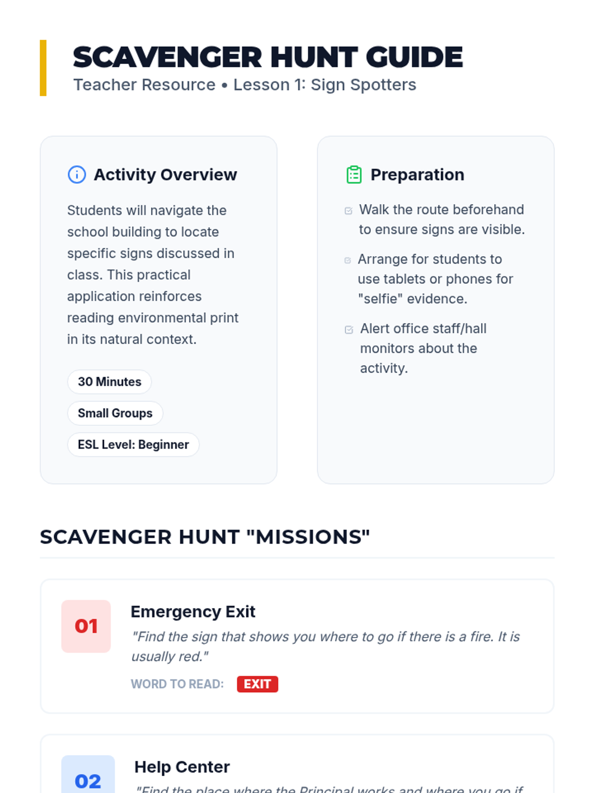 A 5-lesson survival English sequence for 5th-grade beginner ESL students, focusing on reading environmental print, schedules, menus, and maps to navigate real-world school and community scenarios.