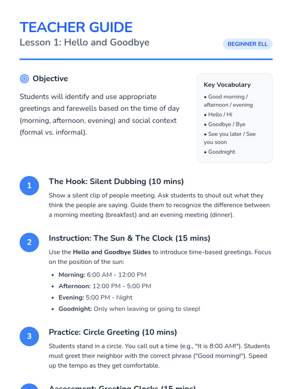 A comprehensive listening sequence for beginner ESL students to navigate their middle school environment. Students progress from basic classroom commands and object identification to mastering numbers, times, and social introductions through active listening simulations.