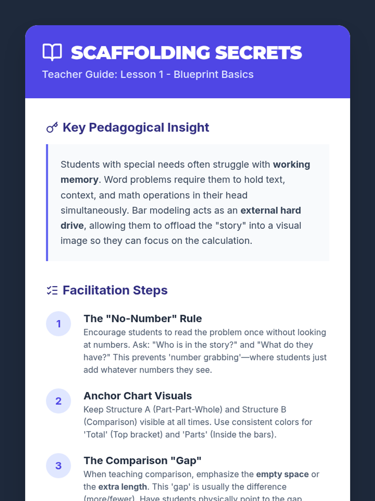 This sequence uses the Concrete-Representational-Abstract (CRA) framework to help 4th-grade students decompose multi-step math problems. Students progress from physical manipulatives to bar models, mastering multiplicative comparisons and two-step problem structures to reduce cognitive load and improve problem-solving accuracy.