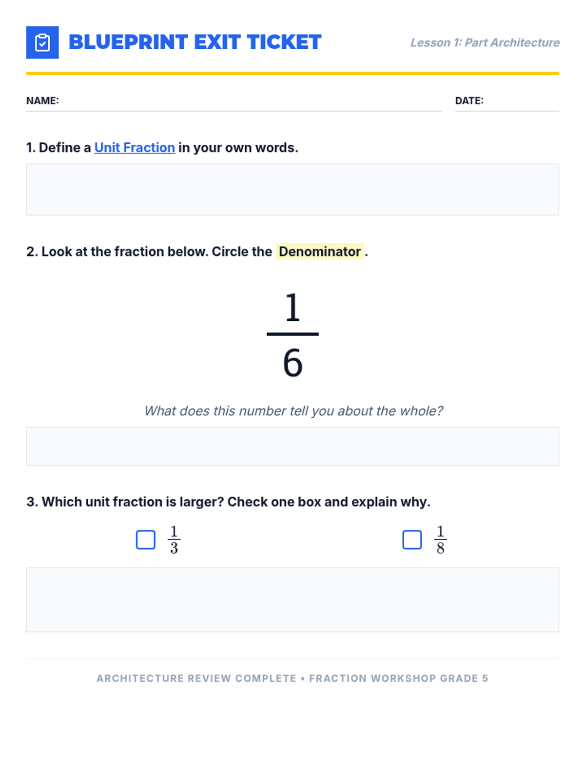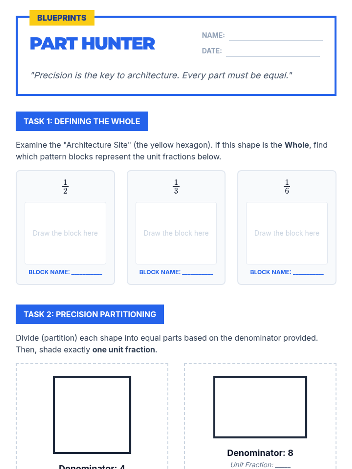A comprehensive unit on fractions covering identification, decomposition with tape diagrams, equivalent fractions, and representing fractions on a number line. Students act as 'Factory Engineers' to build and analyze numerical parts.