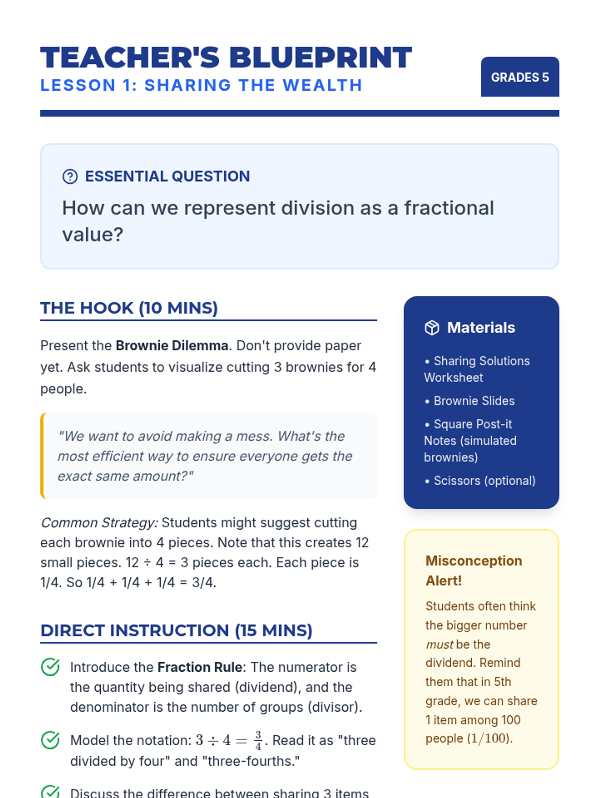 This sequence guides 5th-grade students from visual models to the standard algorithm for dividing fractions. Students discover the relationship between division and multiplication through reciprocals, build fluency with the algorithm, and apply their knowledge to solve complex problems and analyze common errors.