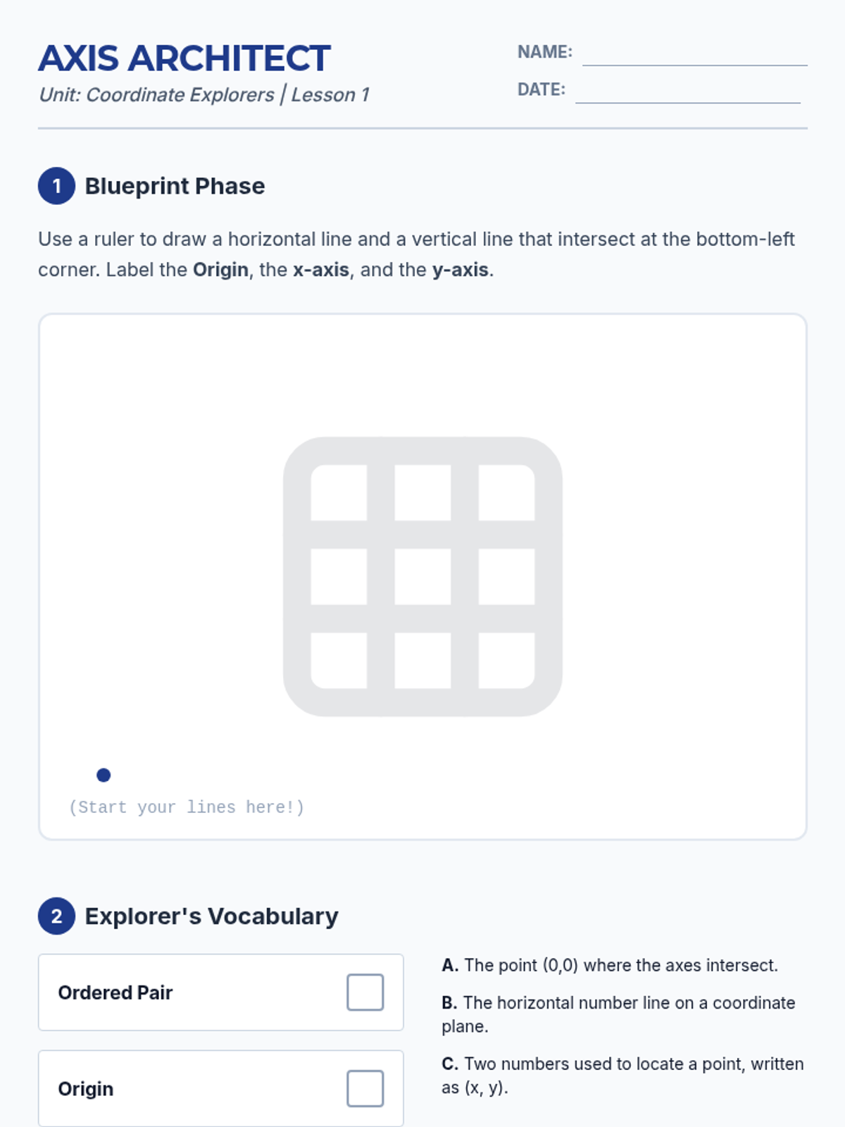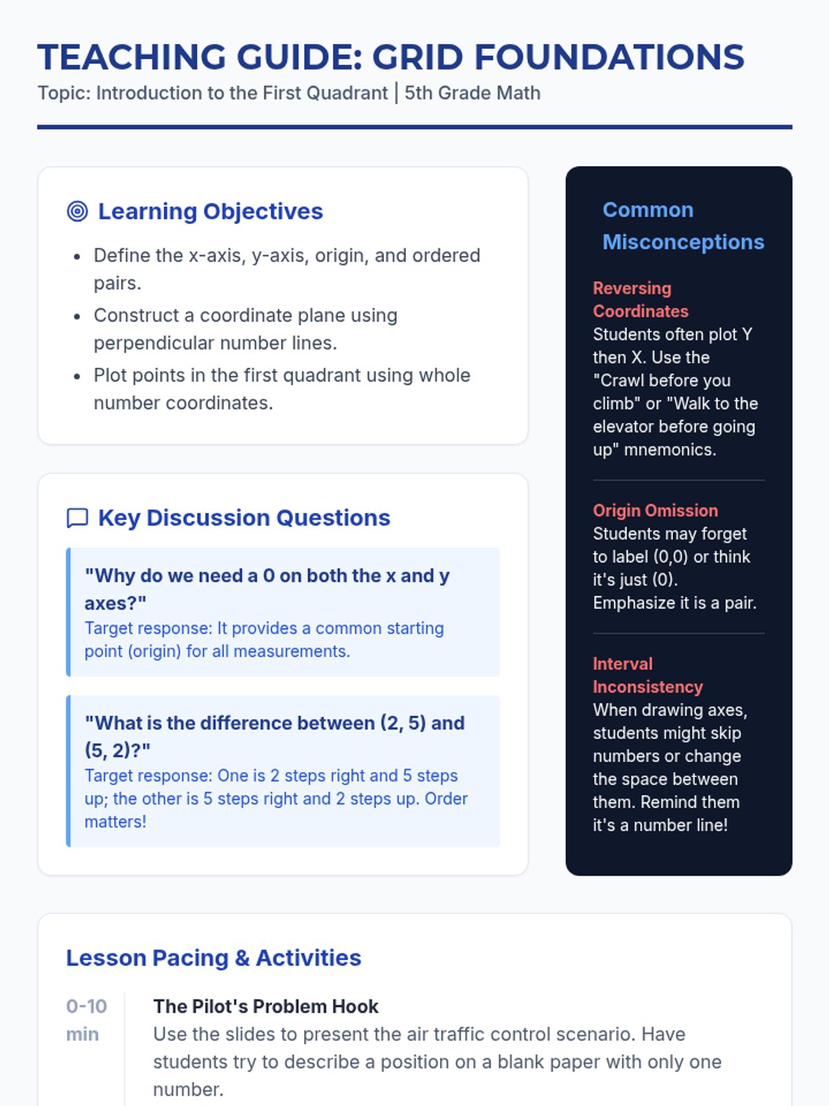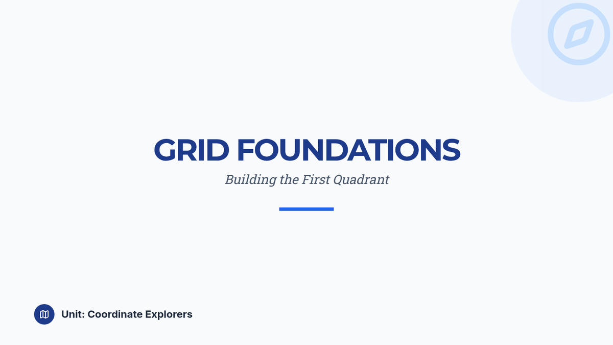 This sequence introduces 5th-grade students to the first quadrant of the coordinate plane, specifically focusing on plotting and reading rational numbers (fractions and decimals). Students will progress from building the axes to using coordinates for navigation, geometric analysis, and strategic gaming.
