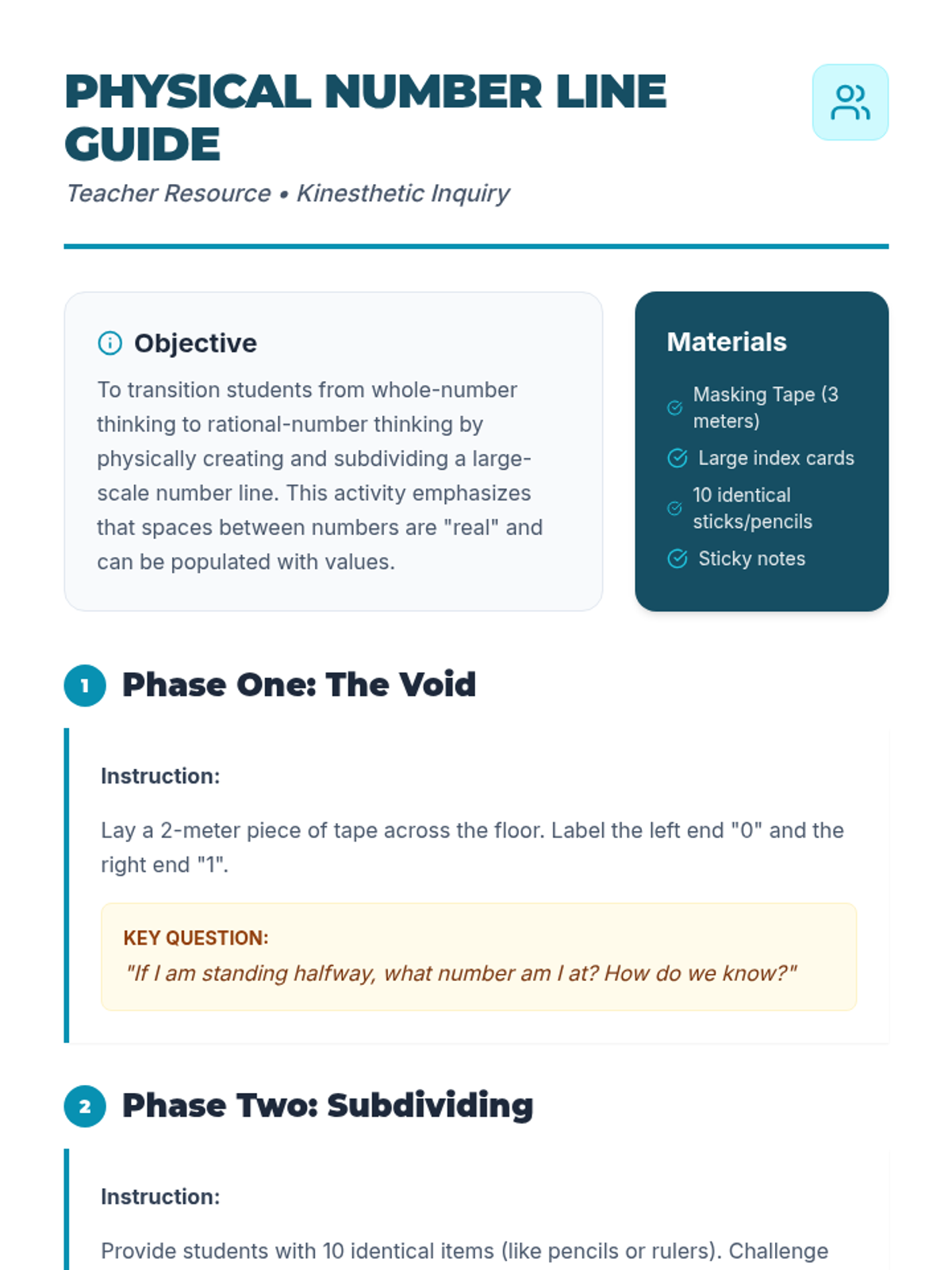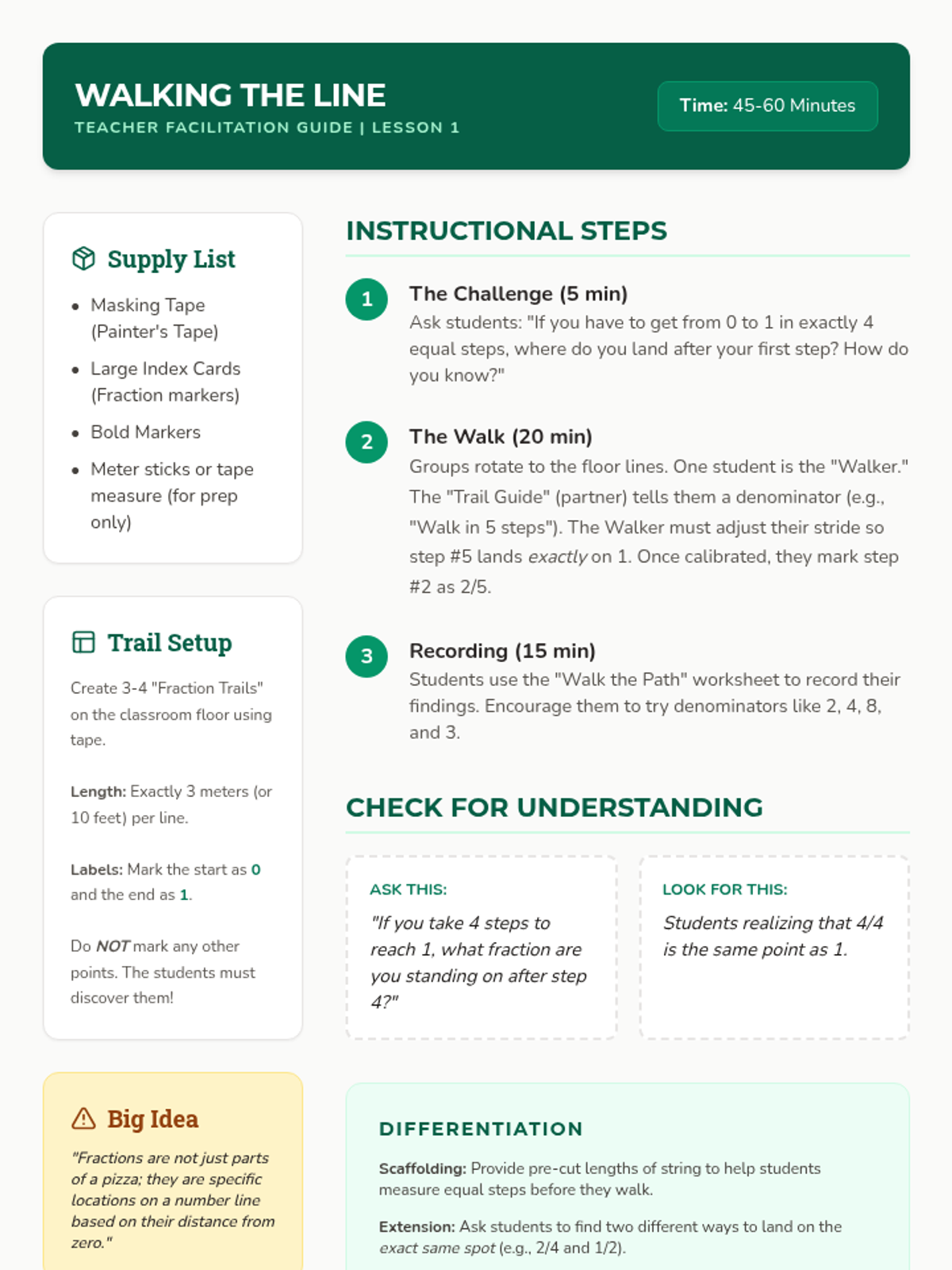 This sequence shifts student understanding of fractions from area models to linear measurement. Students explore fractions as distances on a number line through physical movement, paper folding, games, and estimation, eventually extending their understanding to fractions greater than one.