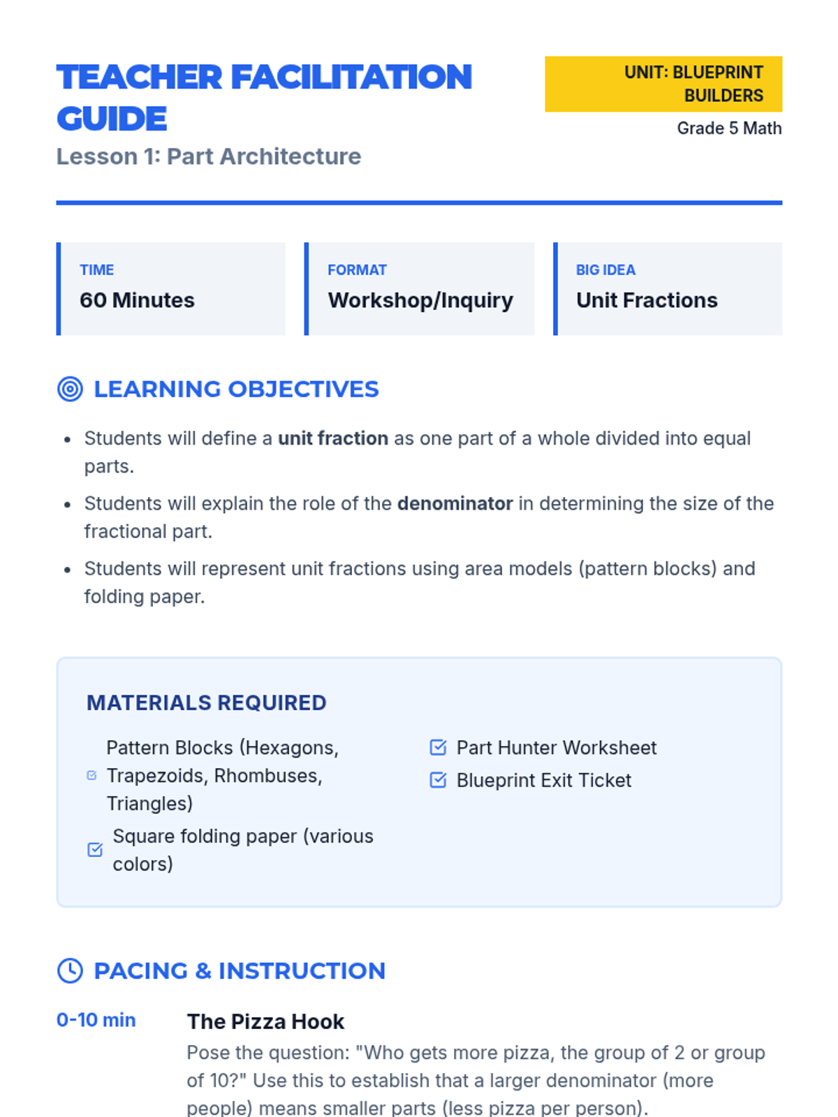 This sequence strengthens student understanding of fractions as numbers through a rigorous workshop model designed to solidify foundational concepts before advanced operations. Students progress from identifying unit fractions to constructing complex fractional values using area models, set models, and number lines.