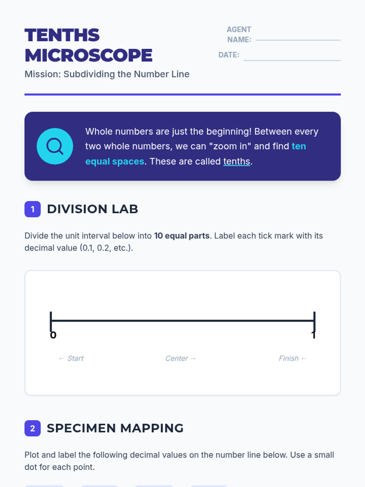 A comprehensive 6th-grade math unit that uses the number line as a primary tool for understanding the magnitude, ordering, and comparison of decimals. Students transition from visualizing tenths to 'zooming in' on hundredths and calculating midpoints.