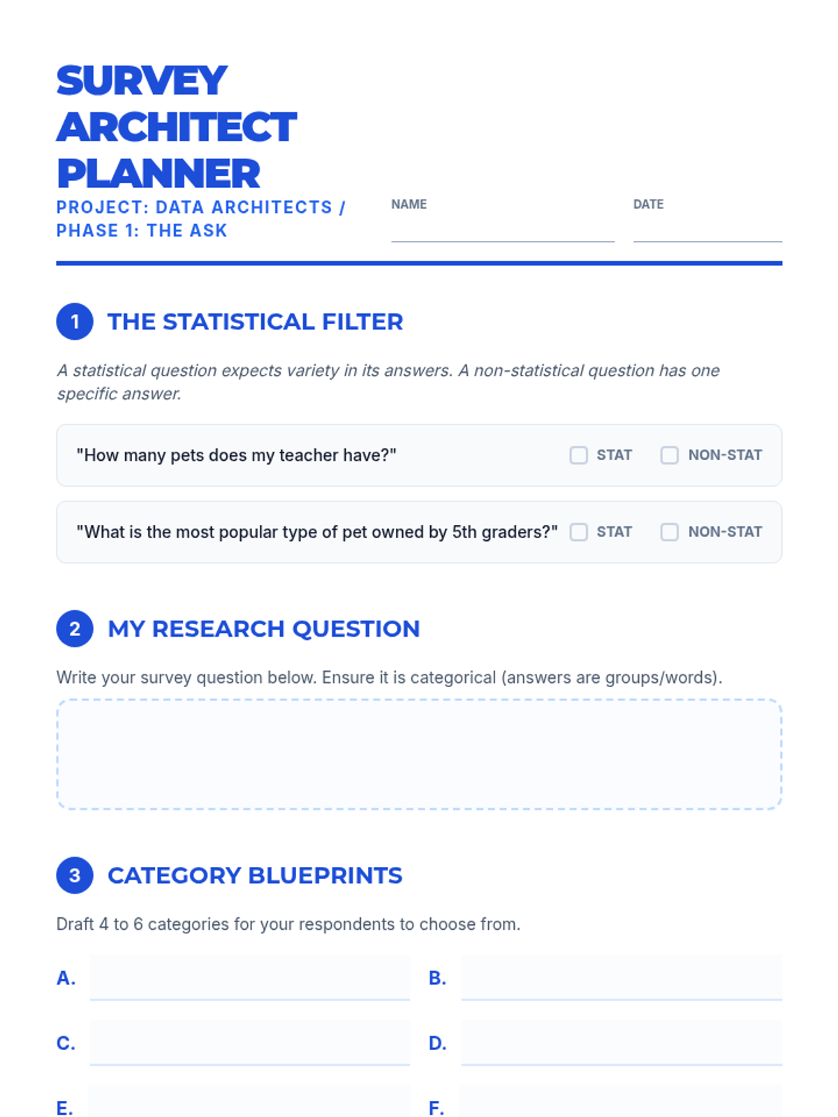 A project-based sequence where 5th-grade students act as data analysts to investigate school-wide questions, moving from question formulation to data collection, organization, visualization, and final presentation.