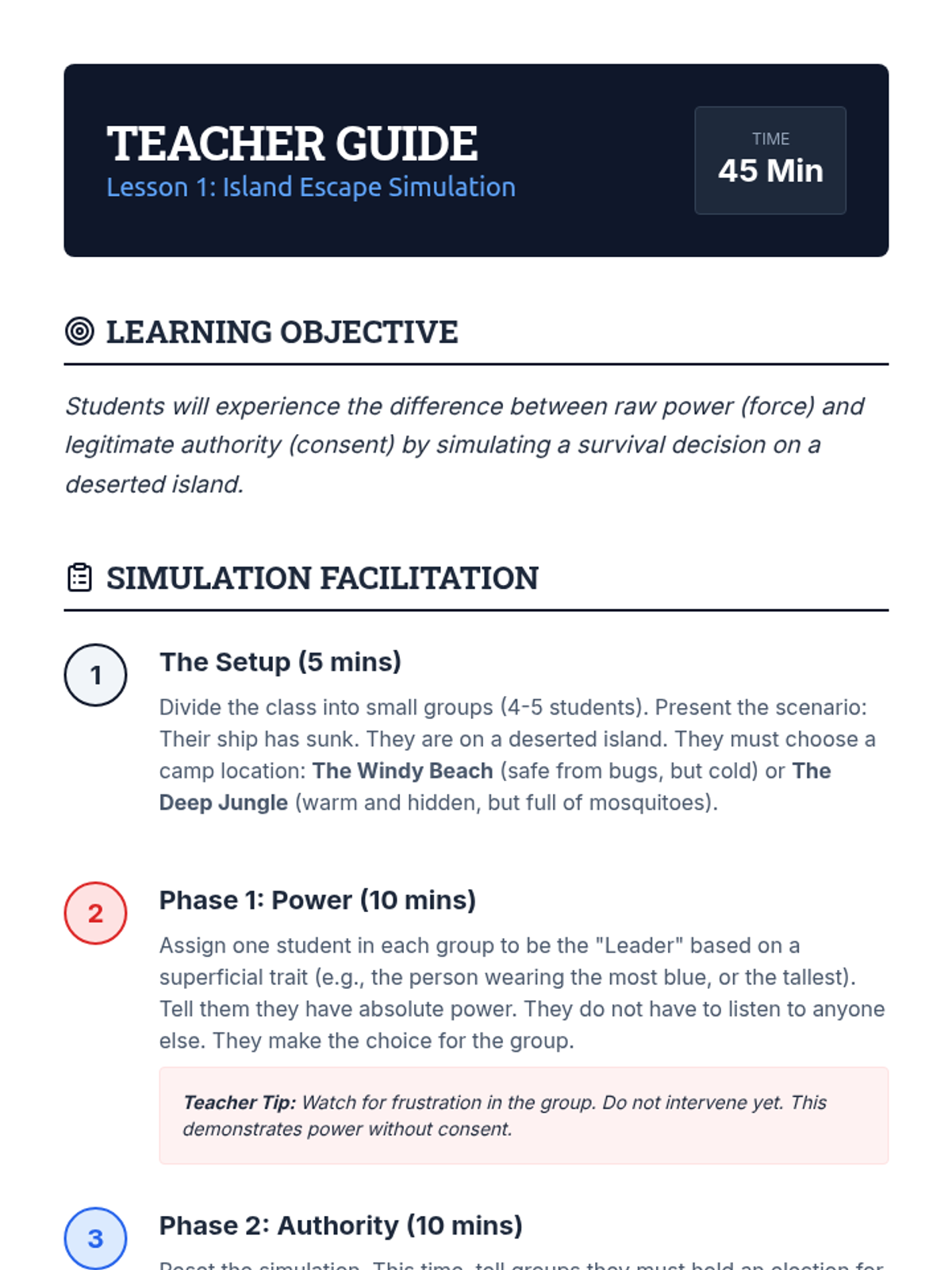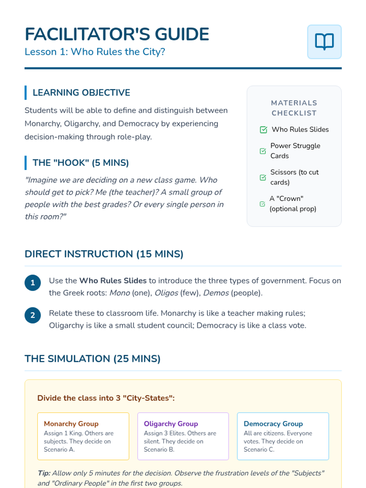 A 5th-grade civics sequence that uses immersive simulations to compare democratic, authoritarian, and monarchical systems. Students progress from exploring the nature of authority to evaluating which government structures best balance efficiency and human rights.