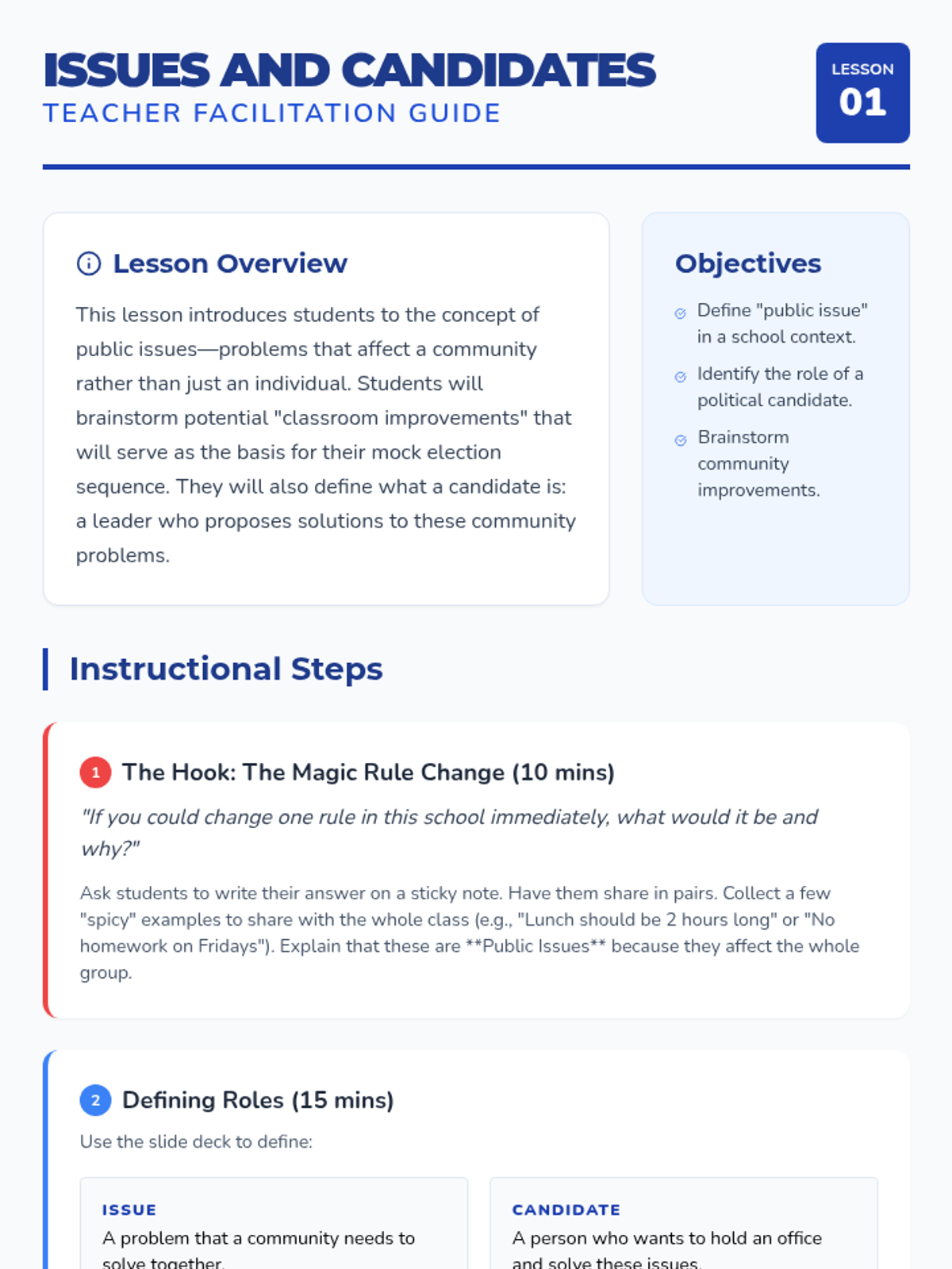 This sequence guides students through democratic participation, from identifying issues and candidates to the mechanics of voting and beyond. Students engage in a simulation where they form interest groups, run campaigns, and learn how to advocate for change in their community.