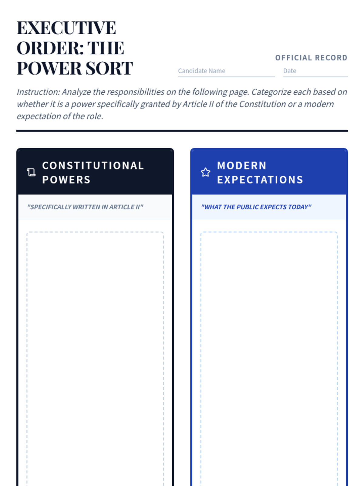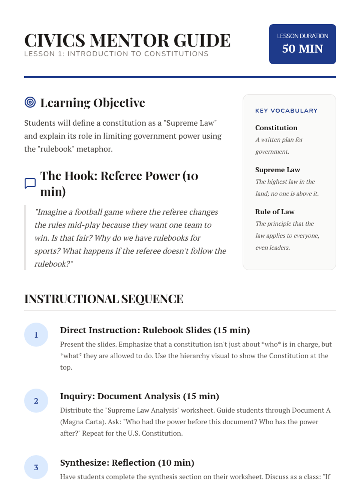 Students explore the concept of constitutional frameworks by drafting a 'Classroom Constitution.' They learn how written rules prevent confusion, define rights and responsibilities, and limit the power of leaders, culminating in a formal ratification ceremony.
