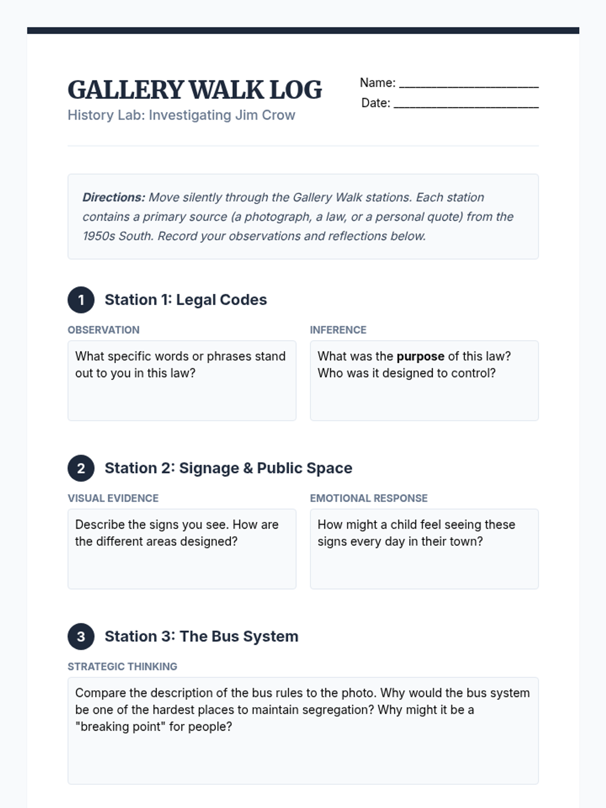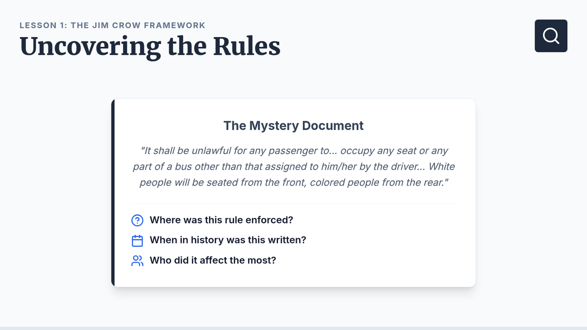 This 5th-grade history sequence explores the dismantling of Reconstruction and the rise of Jim Crow laws, focusing on how legal and social systems were used to restrict the rights of African Americans after the Civil War.