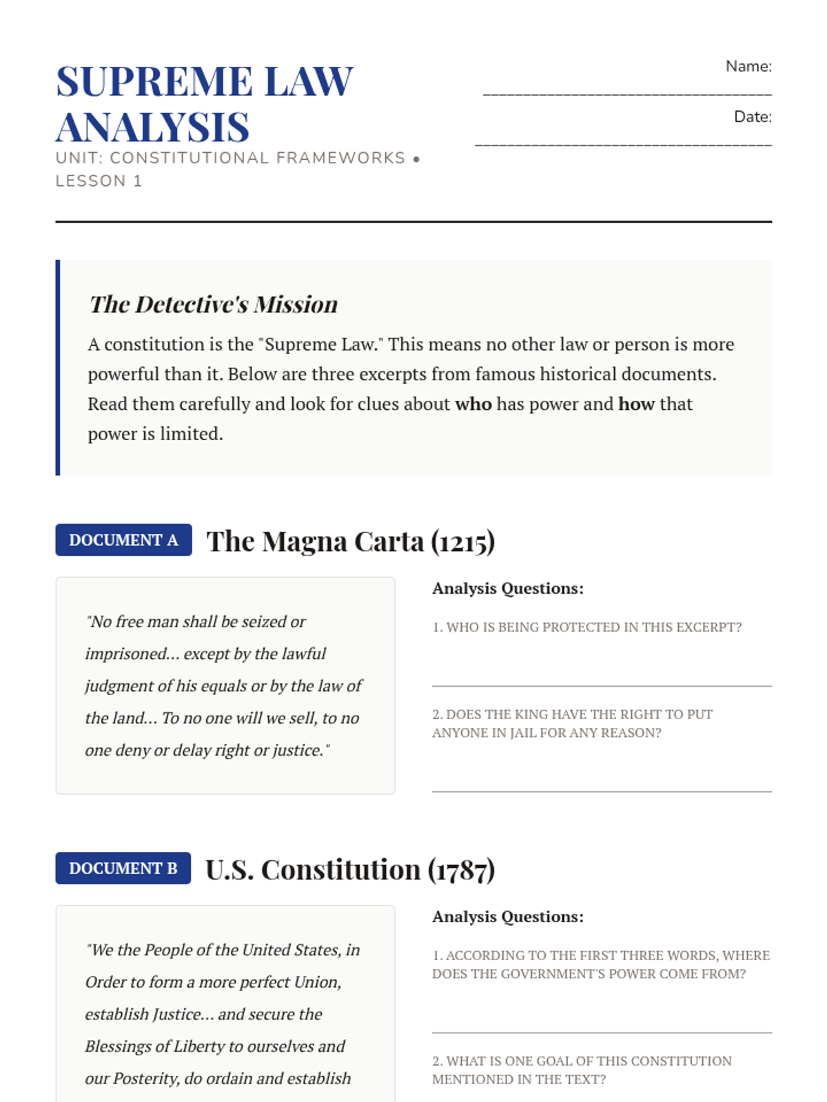 A series of lessons exploring the foundational documents and processes of the United States government, from the birth of the nation to the creation of modern laws.