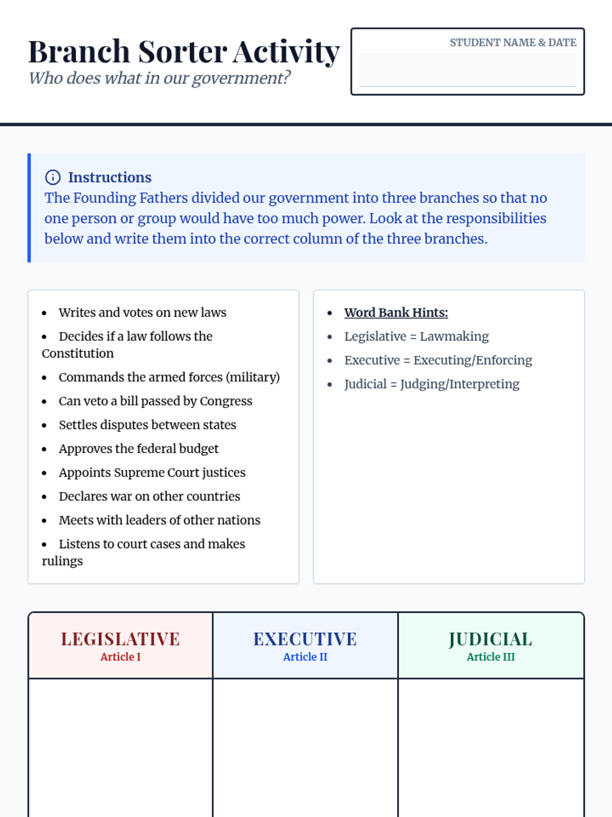 The ConstitutionFundamental principles of U.S. governance, including the Preamble, Articles, and the Bill of Rights. Examines the separation of powers, checks and balances, and the amendment process.