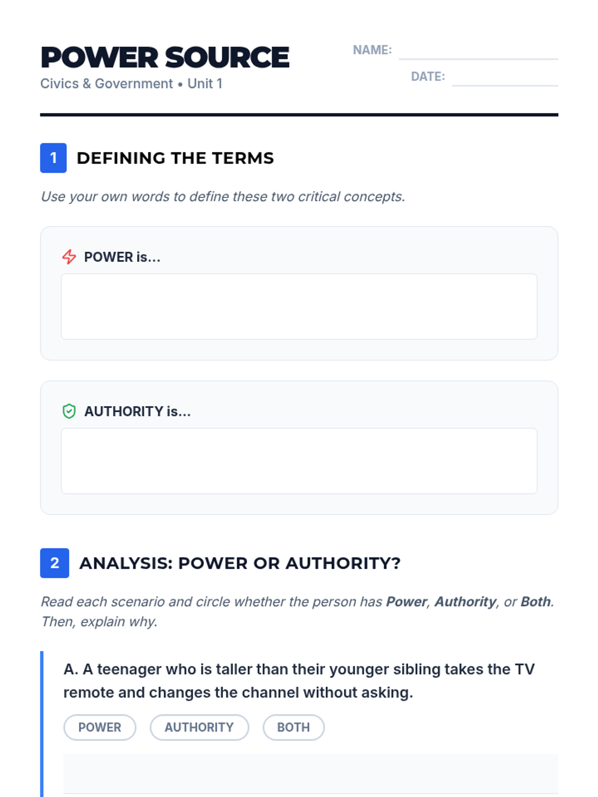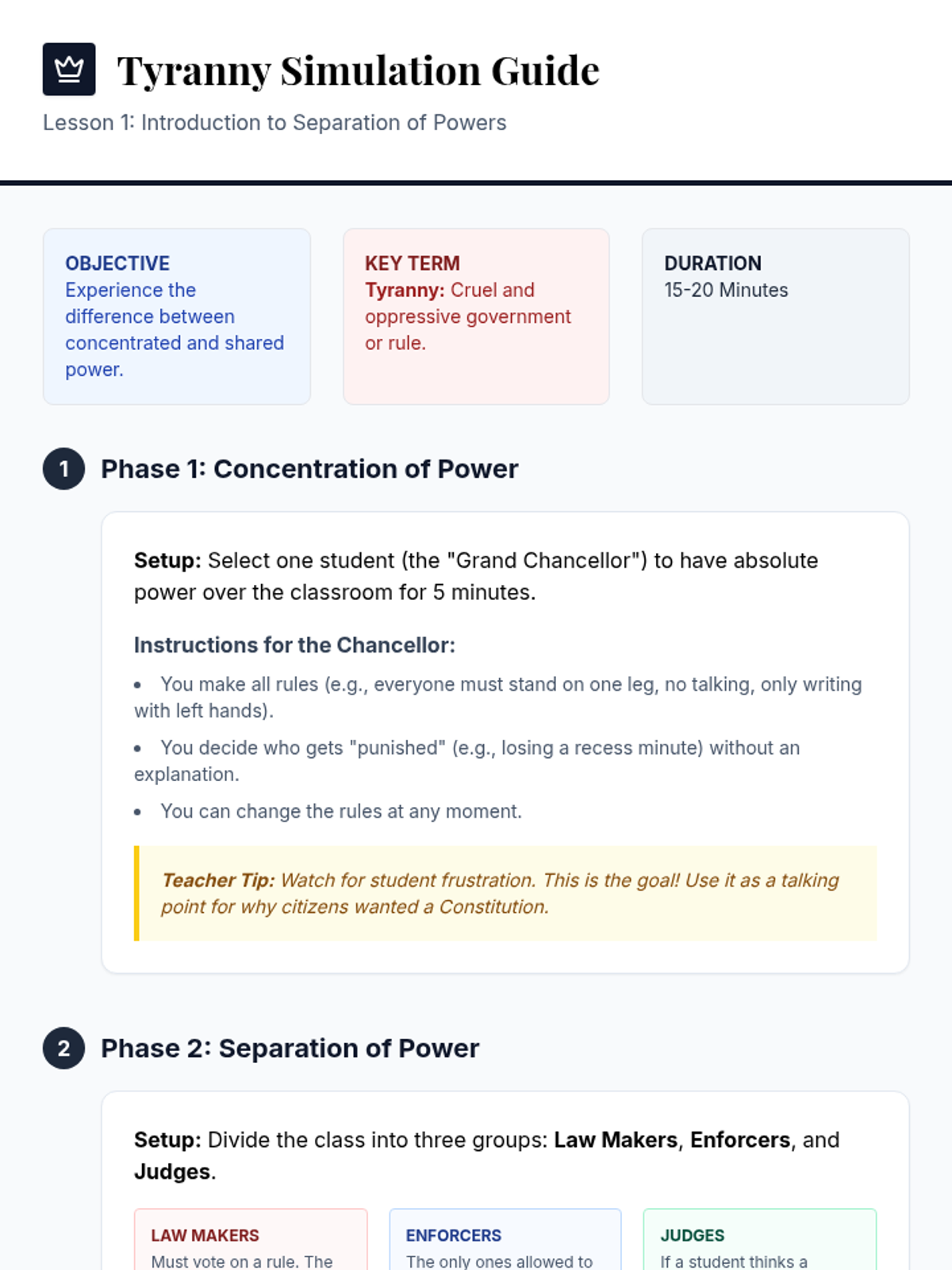 A simulation-based 5th-grade sequence exploring the difference between power and authority, the sources of legitimacy, and the necessity of limiting government power through the rule of law. Students transition from experiencing raw power in simulations to drafting their own classroom charter of limited authority.