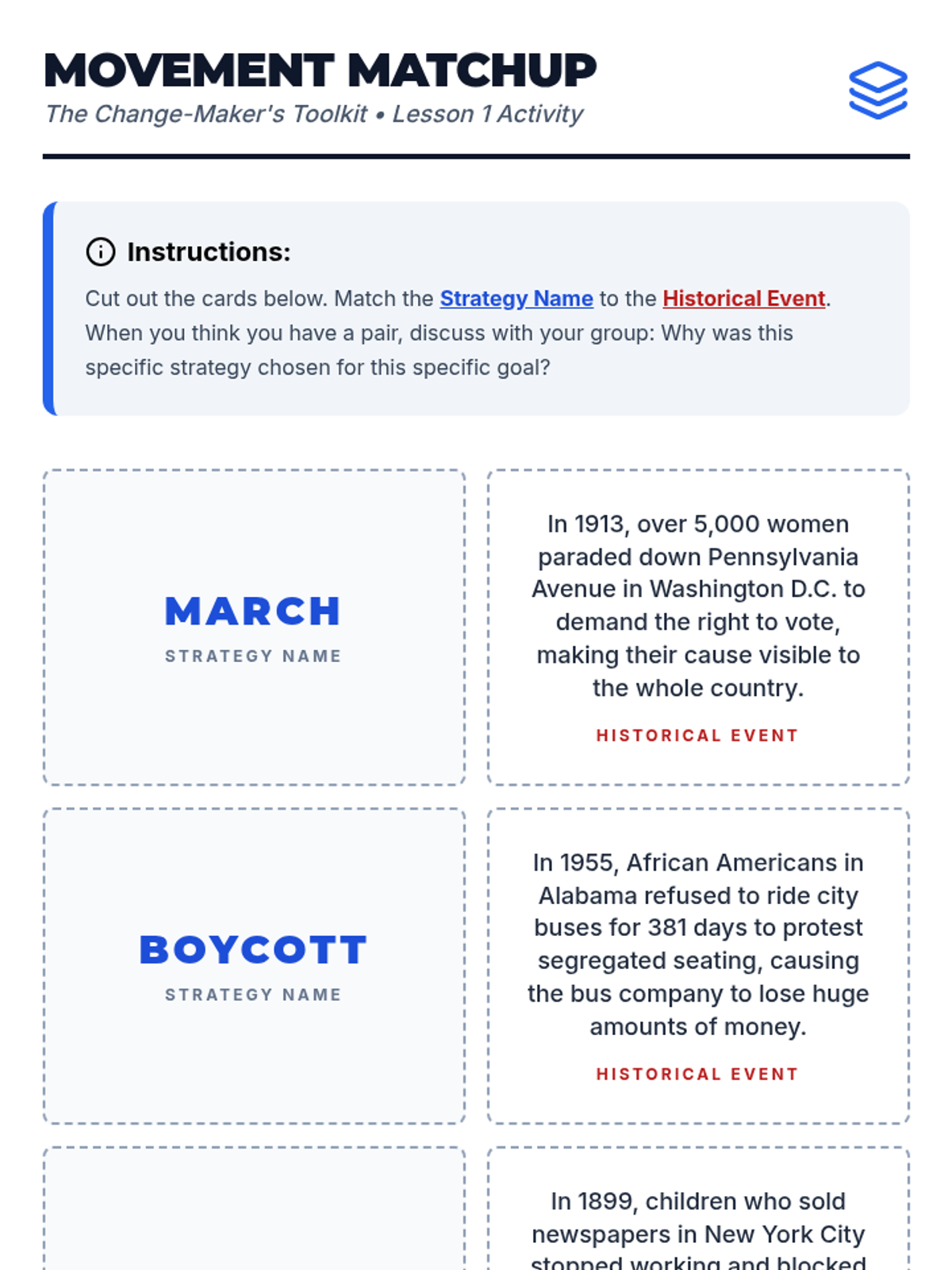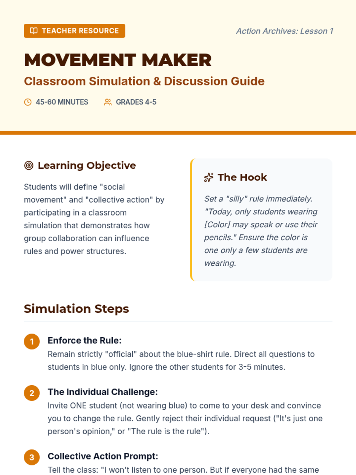 Students examine the strategies of historical social movements (petitions, boycotts, marches) to understand how citizens collaborate for legislative change. The unit covers the Civil Rights and Women's Suffrage movements, culminating in a community action planning project.