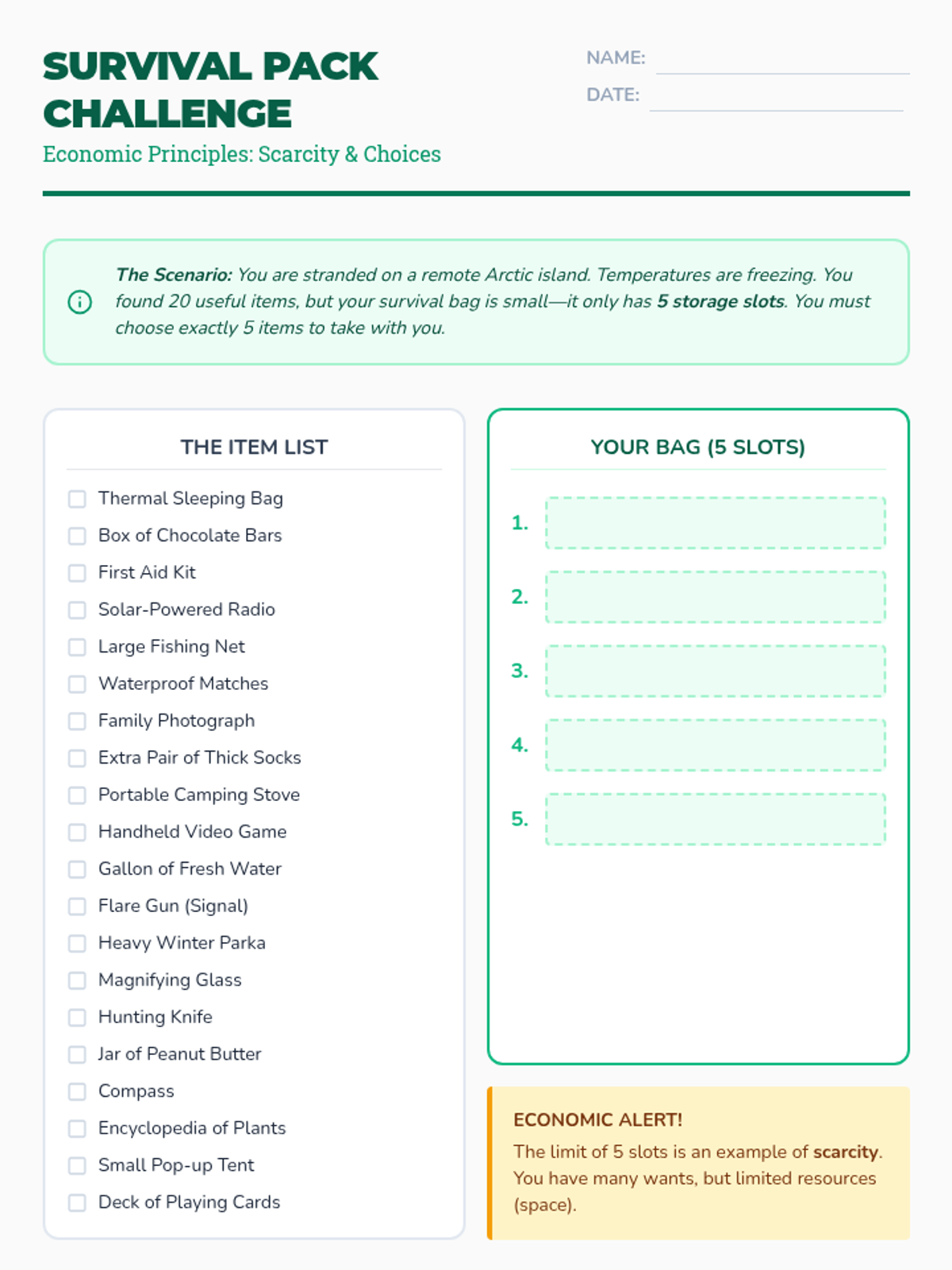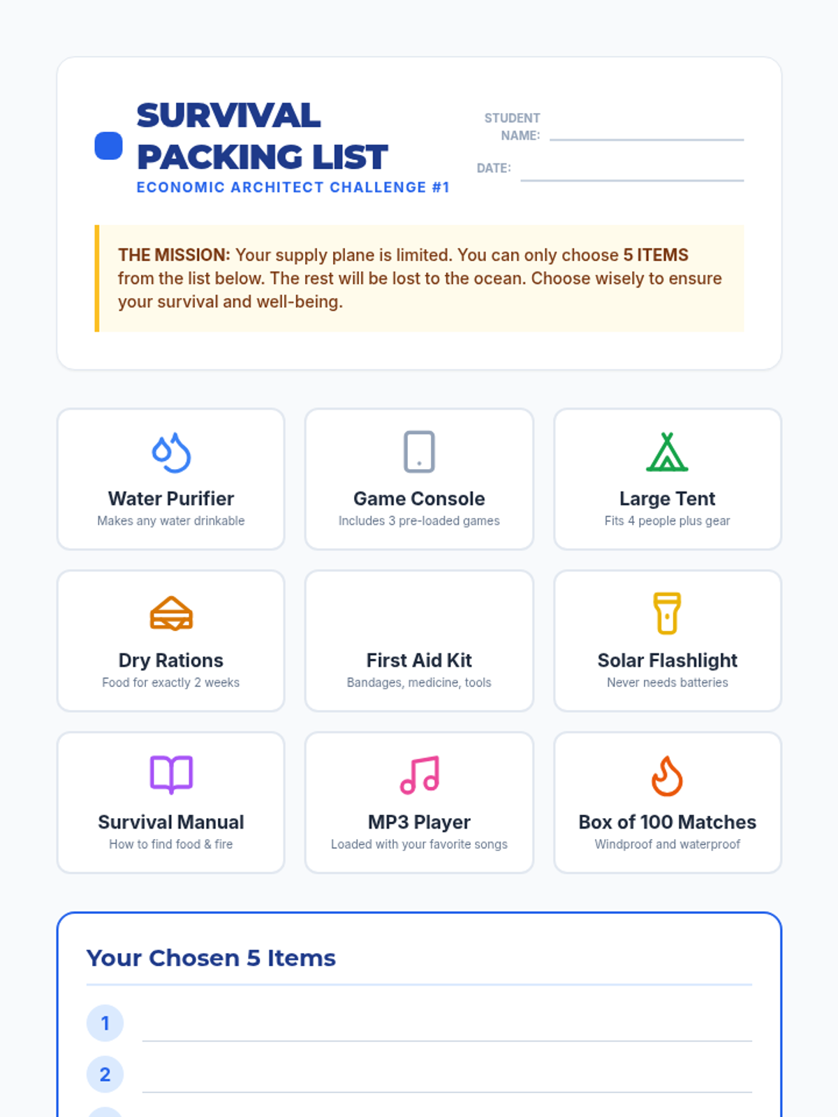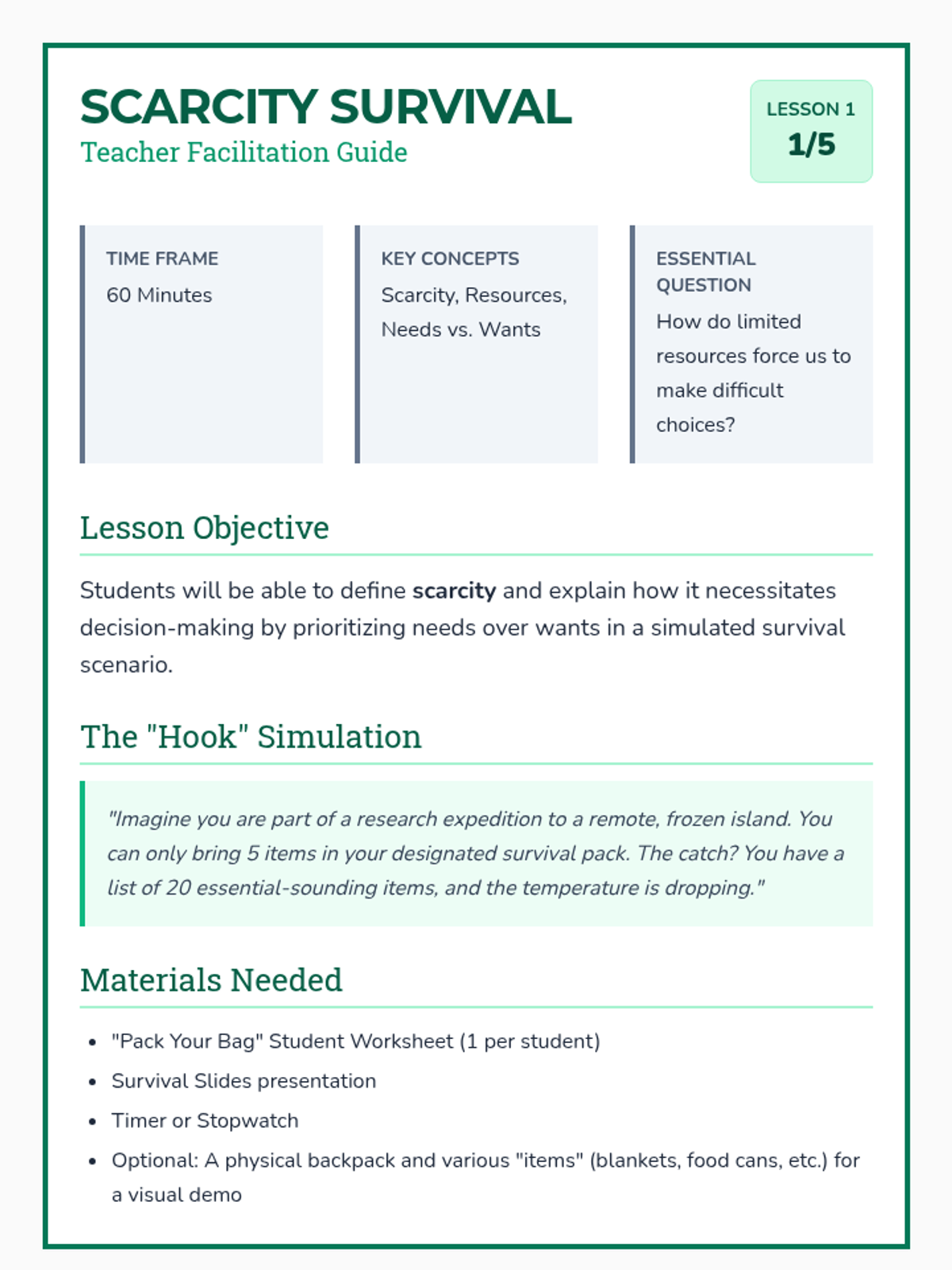 A comprehensive 5th Grade Economics unit that uses simulations and games to teach scarcity, opportunity cost, factors of production, resource allocation, and incentives. Students move from personal survival scenarios to community-wide economic planning.