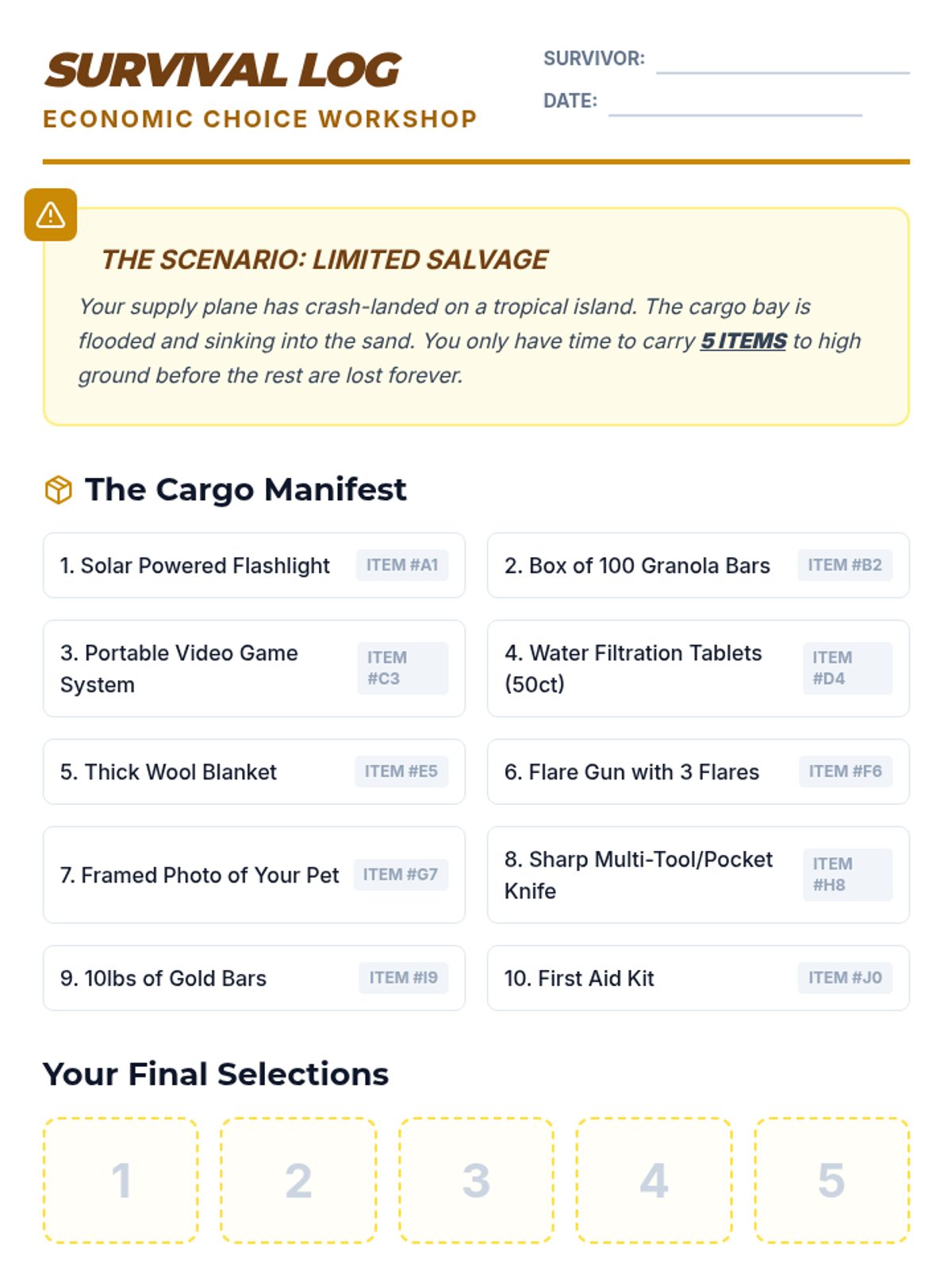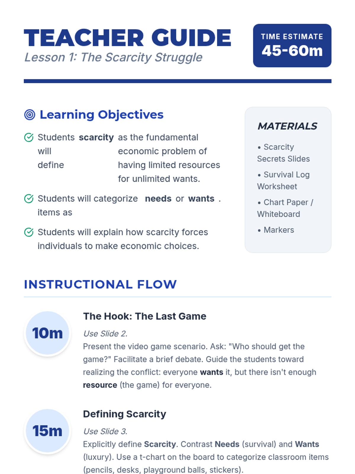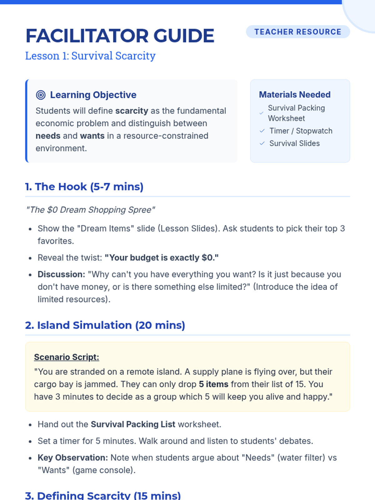 A comprehensive 5th Grade Economics unit that uses simulations and games to teach scarcity, opportunity cost, factors of production, resource allocation, and incentives. Students move from personal survival scenarios to community-wide economic planning.