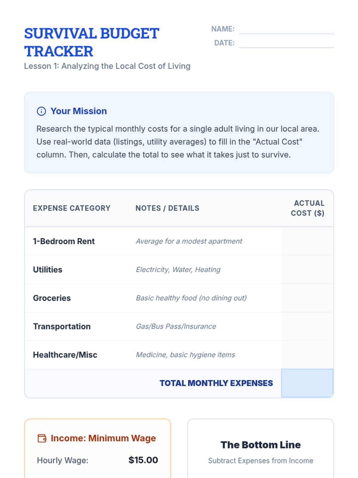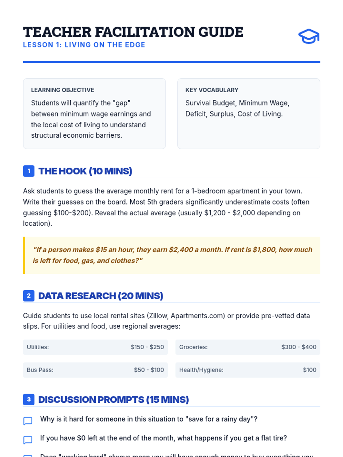 This sequence examines the practical barriers to social mobility through the lens of budgeting and cost-of-living analysis. Students analyze concrete data regarding income, housing, and unexpected expenses to understand the structural challenges of economic inequality.