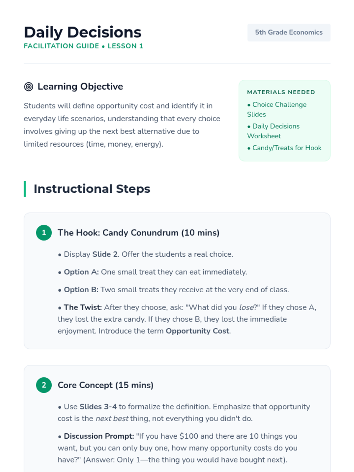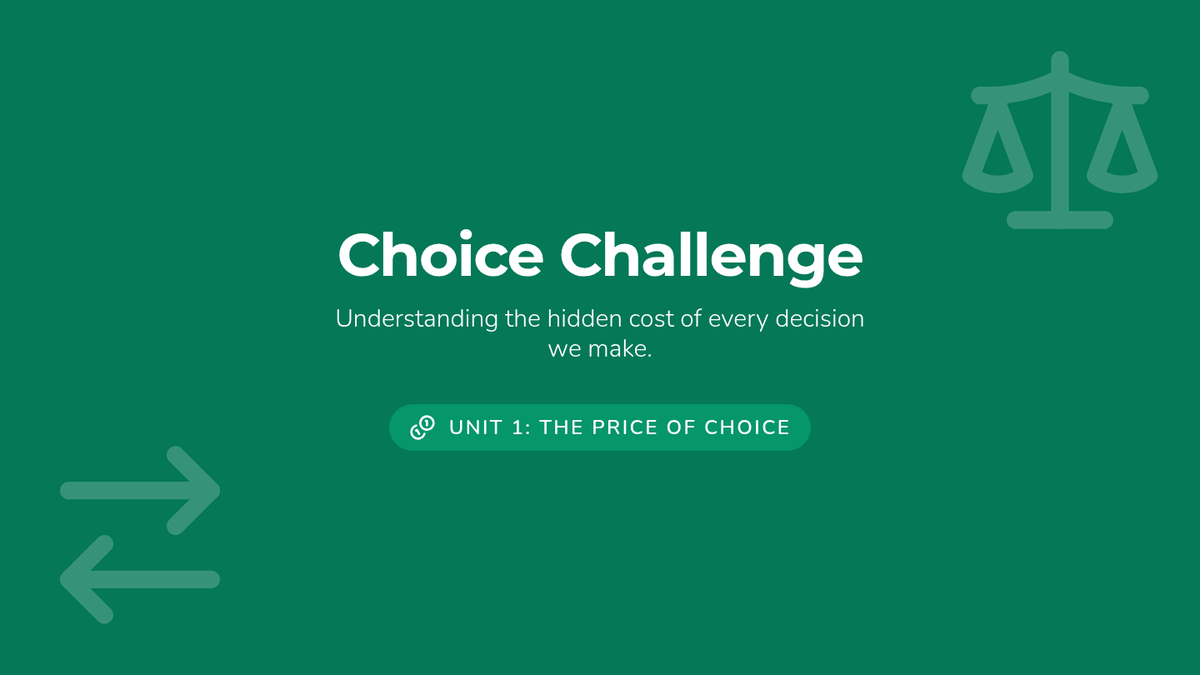 A 5th-grade economics sequence focused on decision-making, opportunity cost, and resource allocation. Students progress from personal choices to complex community planning and specialization simulations.