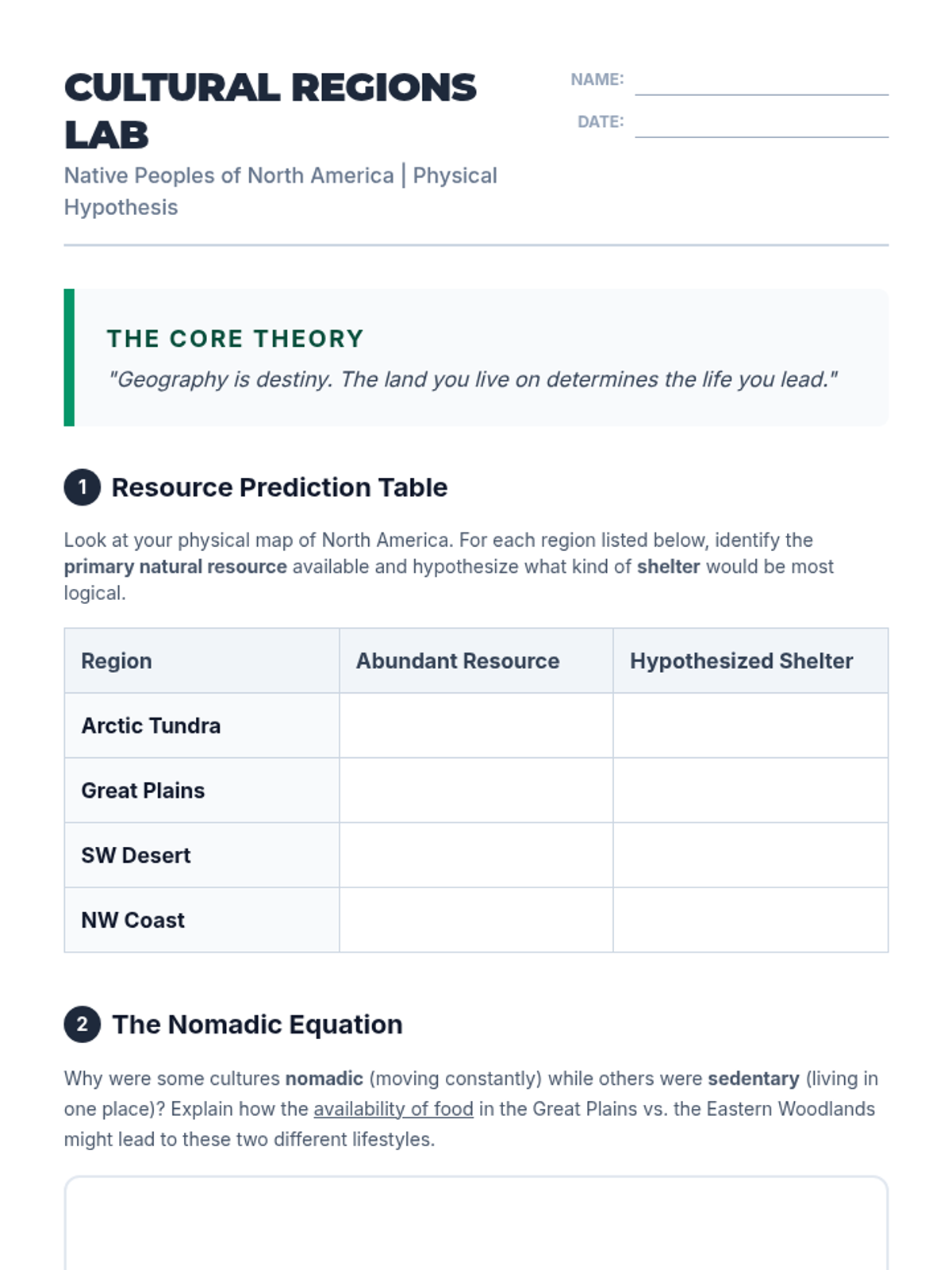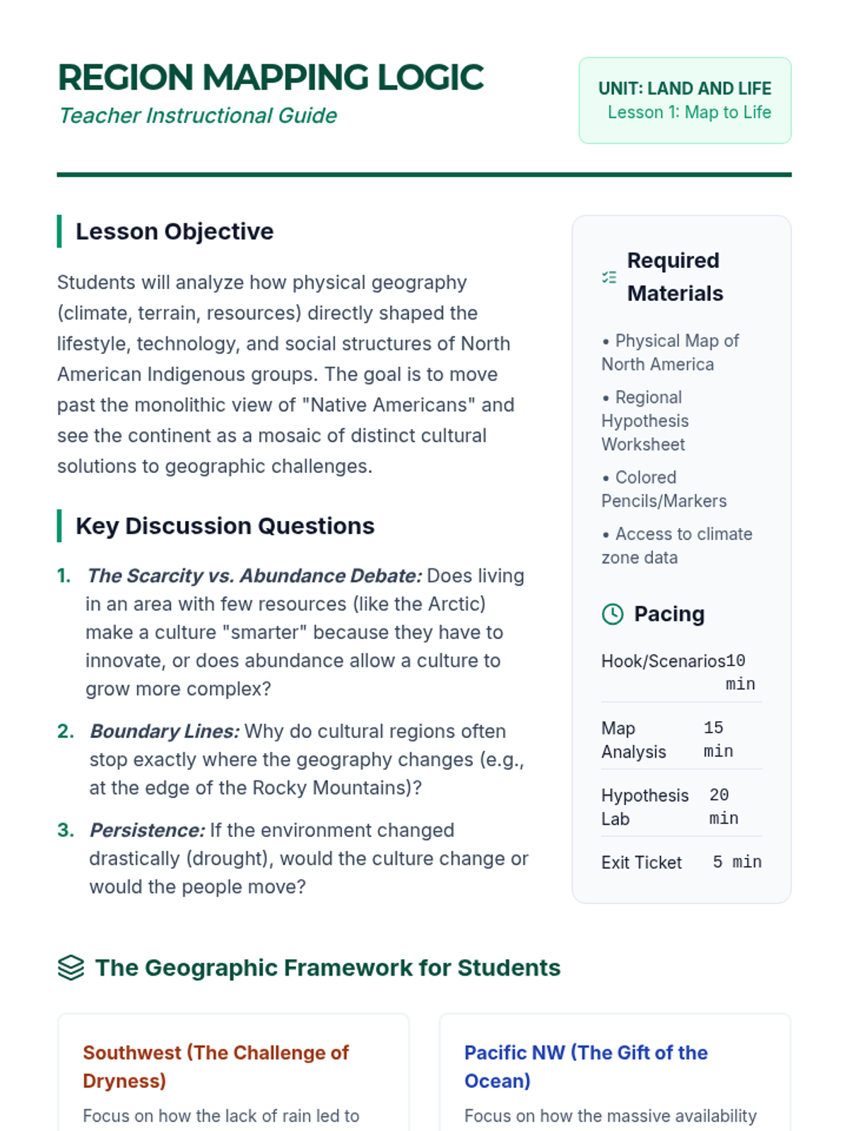 This sequence explores the deep connection between physical geography and the development of diverse Indigenous cultures across North America prior to European contact. Students analyze how environmental features dictated resource availability, shelter, and social structures in regions like the Arctic, Southwest, and Pacific Northwest.