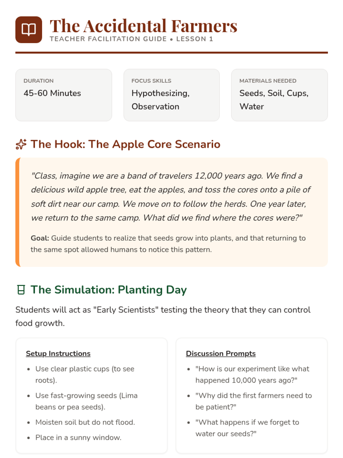 This sequence explores the Neolithic Revolution, tracing the shift from nomadic hunting and gathering to settled agricultural communities. Students investigate the 'accidental' discovery of farming, the process of animal domestication, the architecture of early villages like Catalhoyuk, and the economic shifts brought by food surpluses and job specialization.