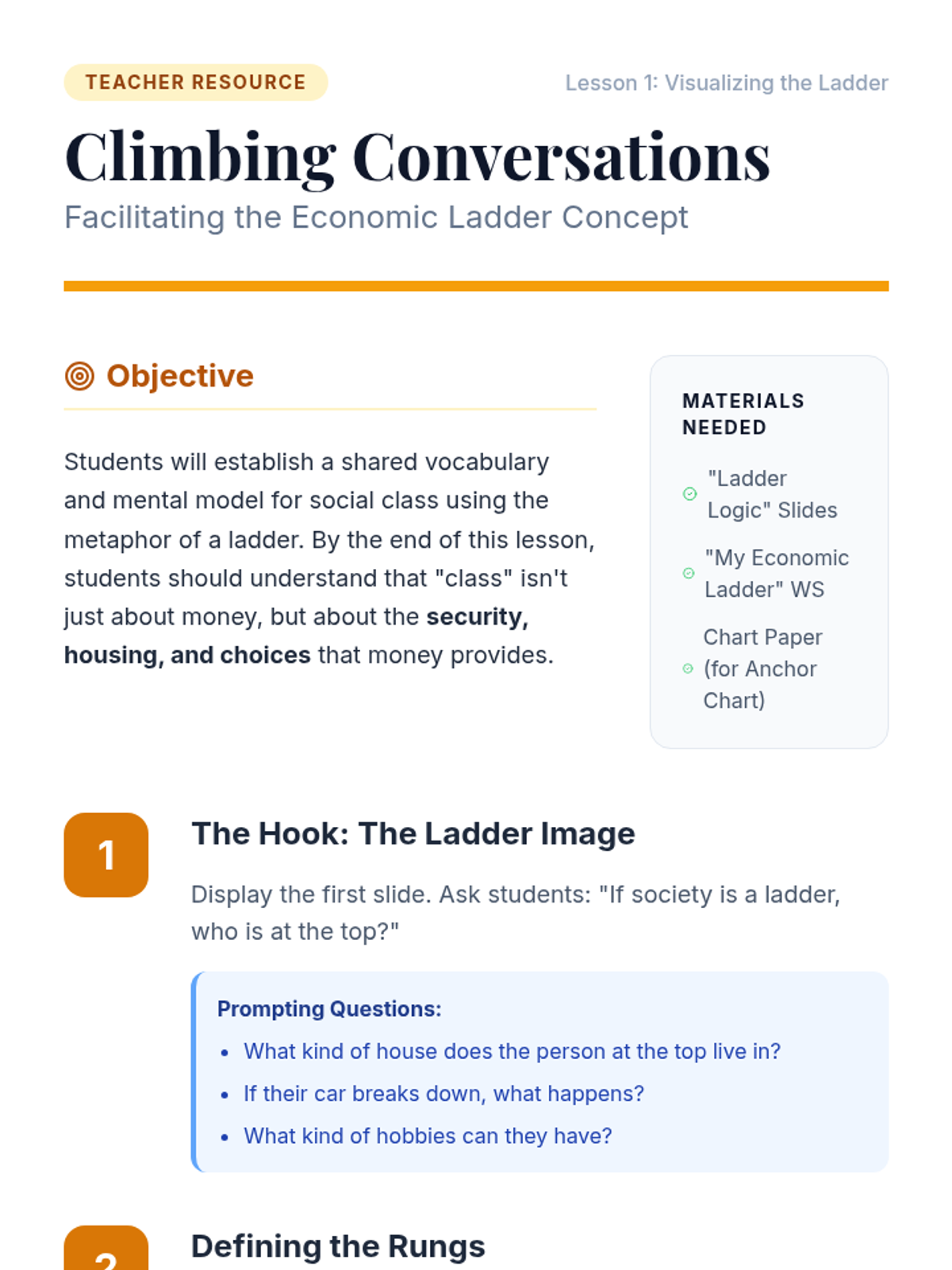 Using literature and historical narratives, this sequence helps students understand social mobility through the 'economic ladder' metaphor. Students analyze the California Gold Rush, fictional stories of hardship, and participate in a privilege simulation to identify both barriers and supports in achieving economic security.