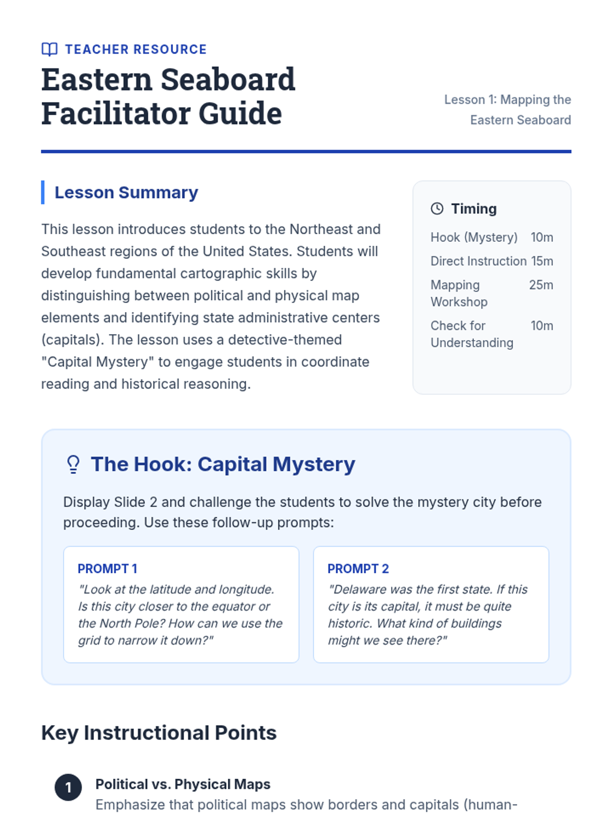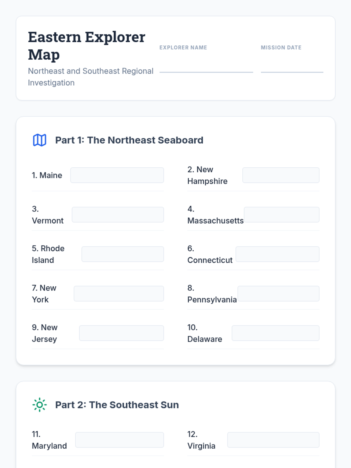 A 5-day unit exploring the Northeastern United States, covering its unique geography and climate, the rich history of the Wampanoag, Abenaki, and Iroquois nations, and the vibrant modern culture of its eleven states.