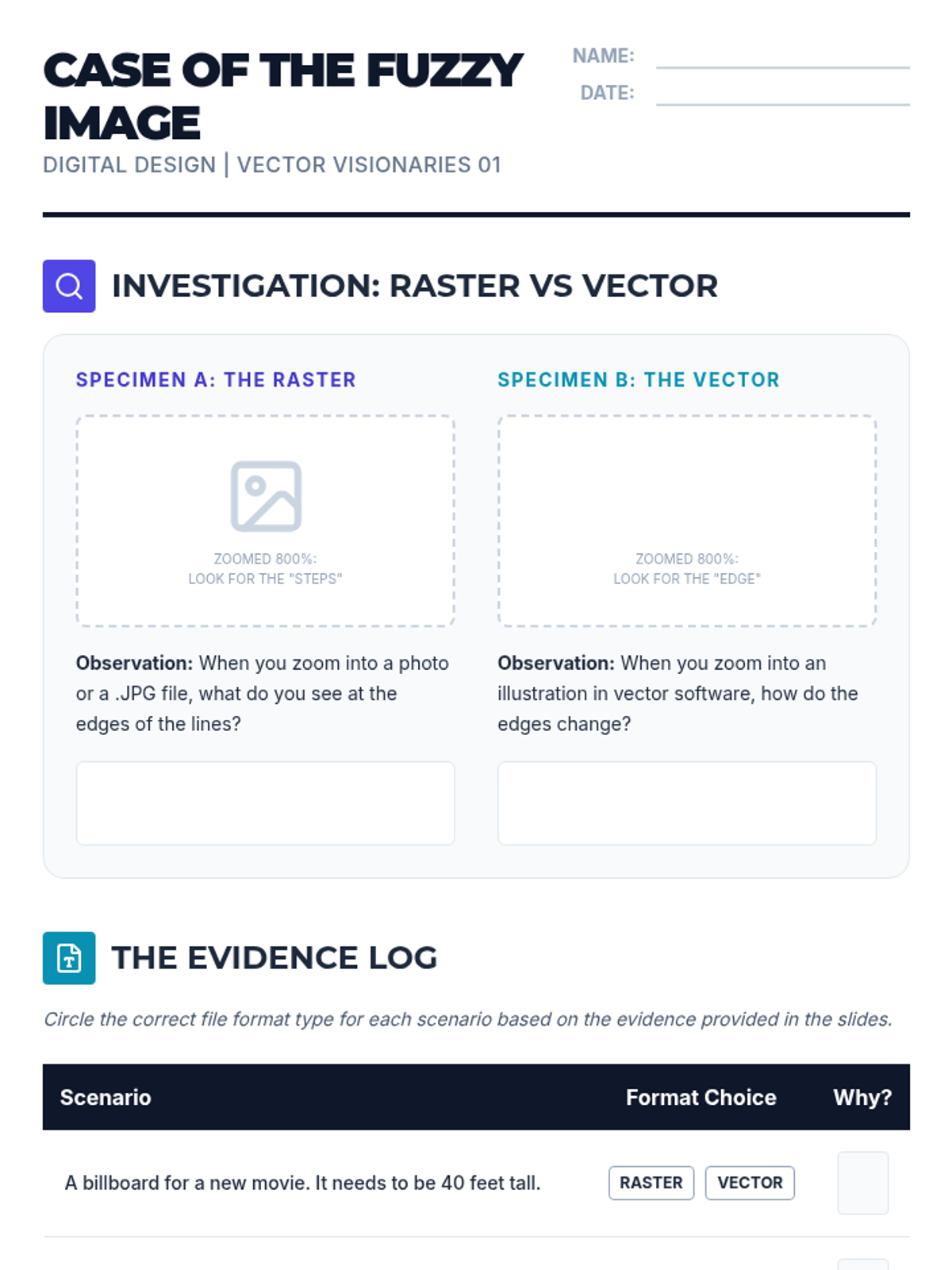 A comprehensive 5-lesson sequence for 6th graders on vector illustration, focusing on the technical differences between raster and vector graphics, mastering shape-building and pen tools, and creating a personal logo. Students move from basic geometry to complex symbolic design.