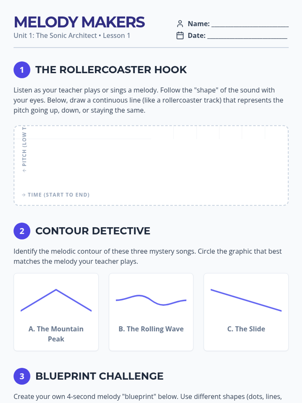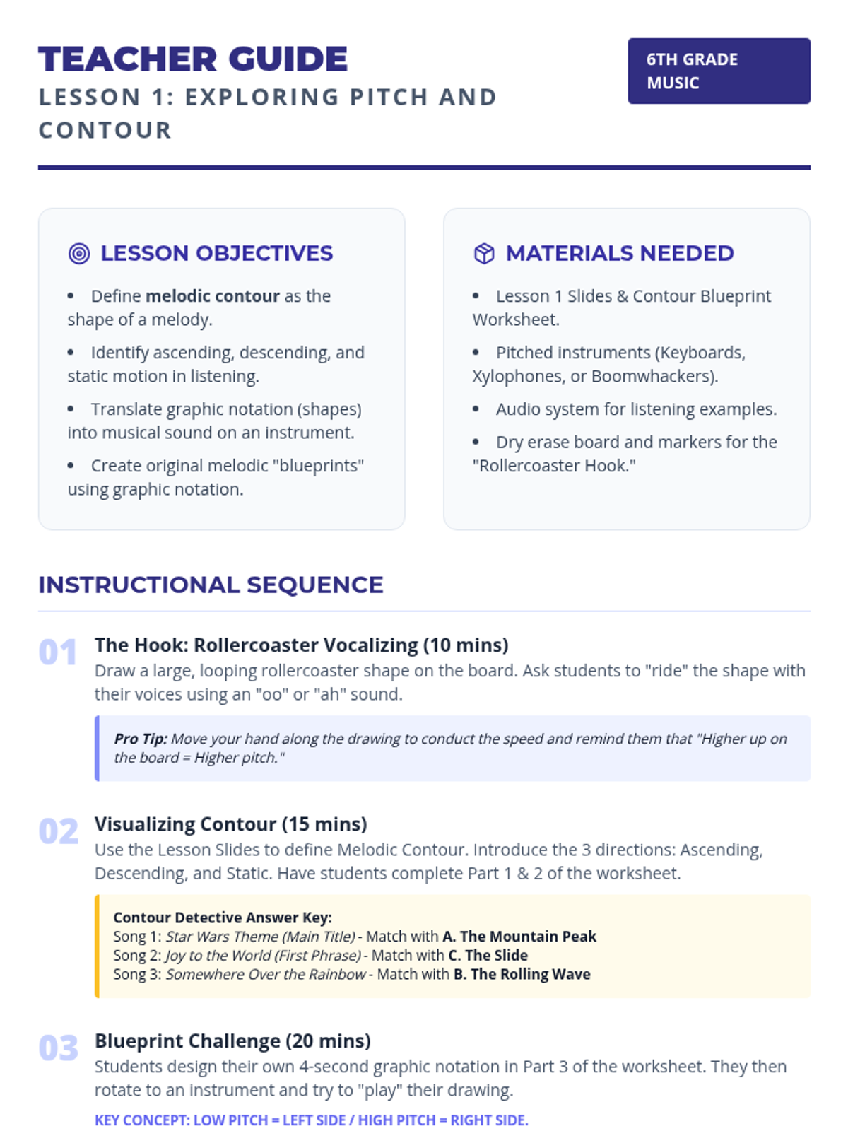 A comprehensive 5-lesson unit for 6th-grade students focused on composing memorable melodies. Students progress from visualizing melodic shapes to understanding pentatonic scales, mastering call-and-response phrasing, and finally notating and varying their own musical creations.