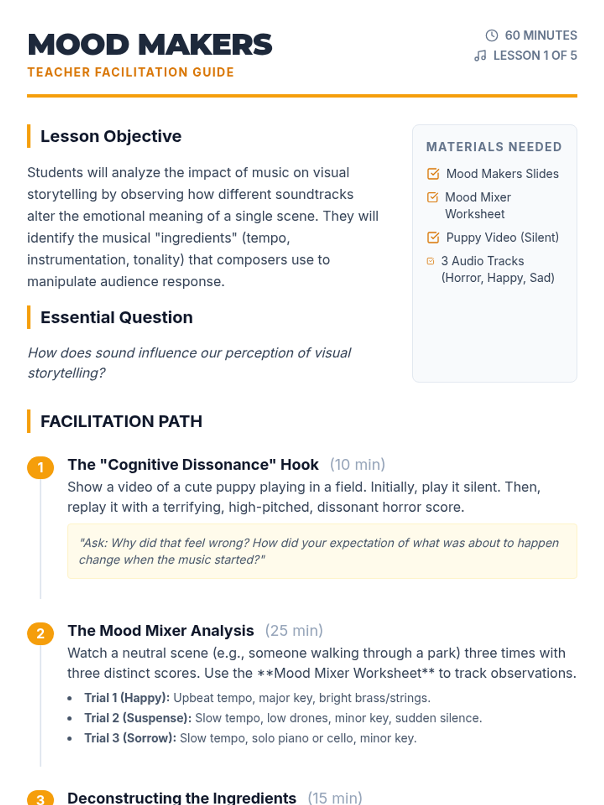 A two-part sequence exploring how music communicates emotions, stories, and visual imagery through various musical elements and excerpts. Students analyze how tempo, melody, and instrumentation shape our perception of sound.