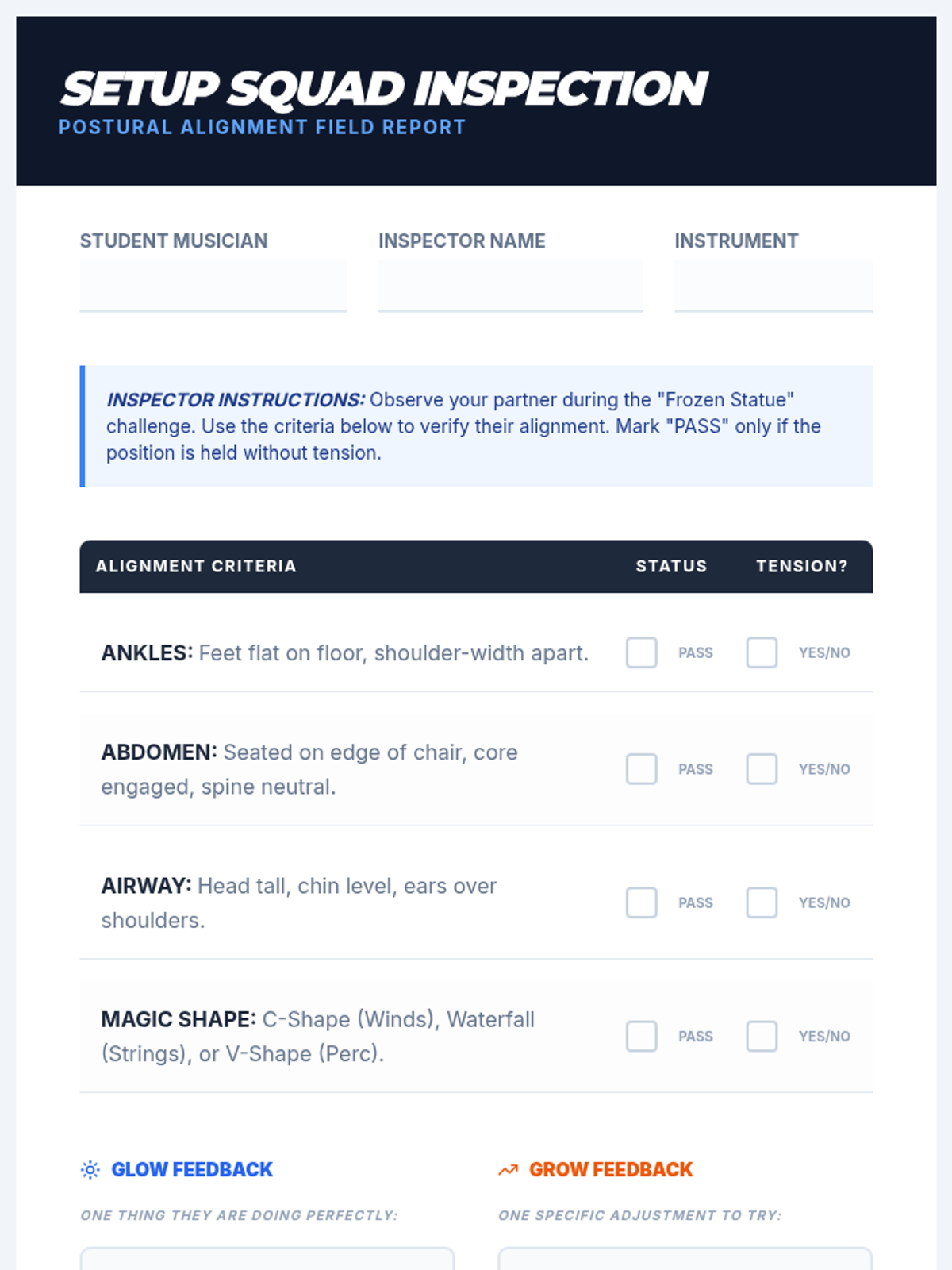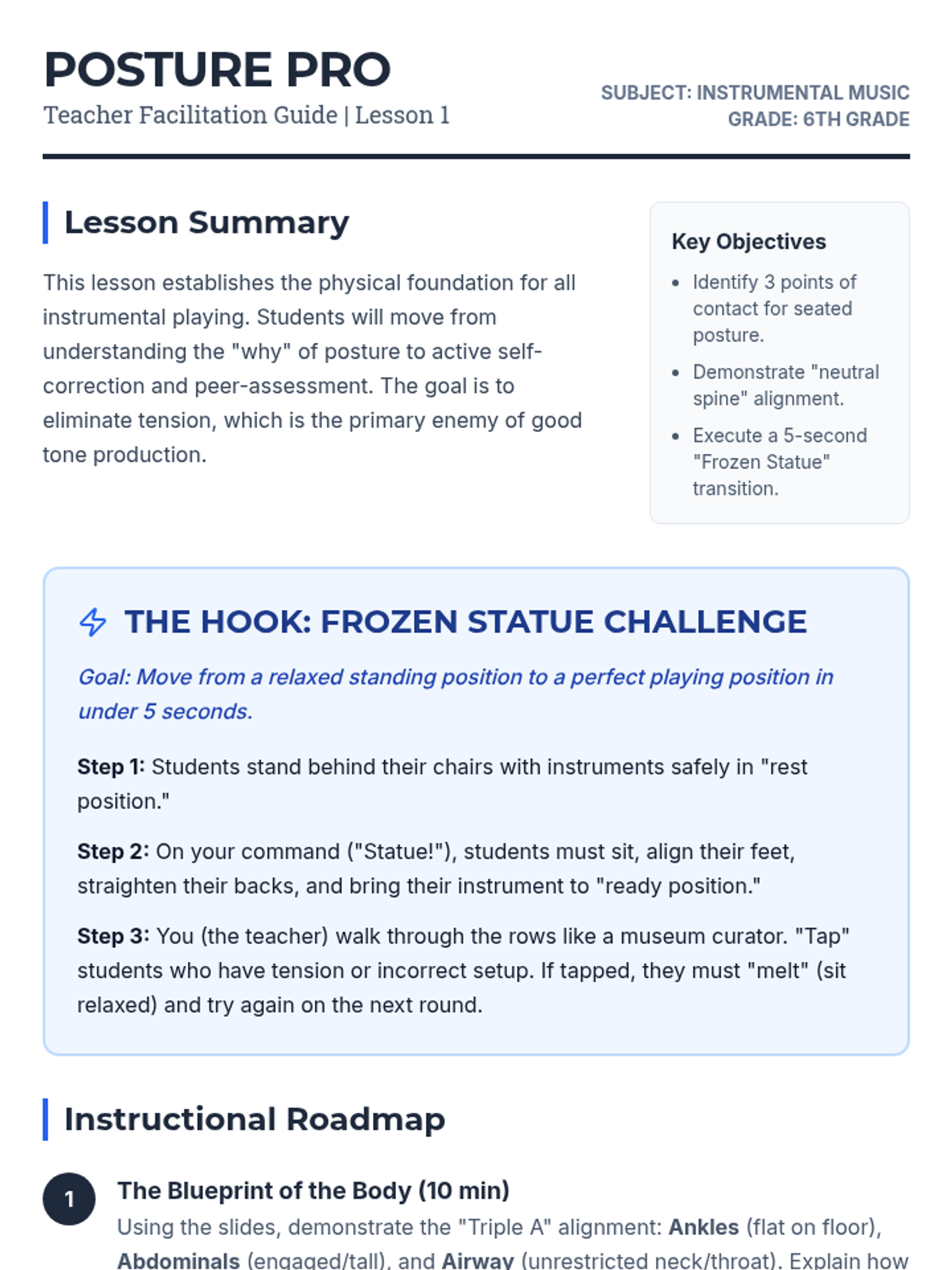 A comprehensive unit for 6th-grade instrumentalists focusing on the physical mechanics of tone production, posture, and articulation. Students move from basic ergonomic setup to advanced intonation and scale performance.